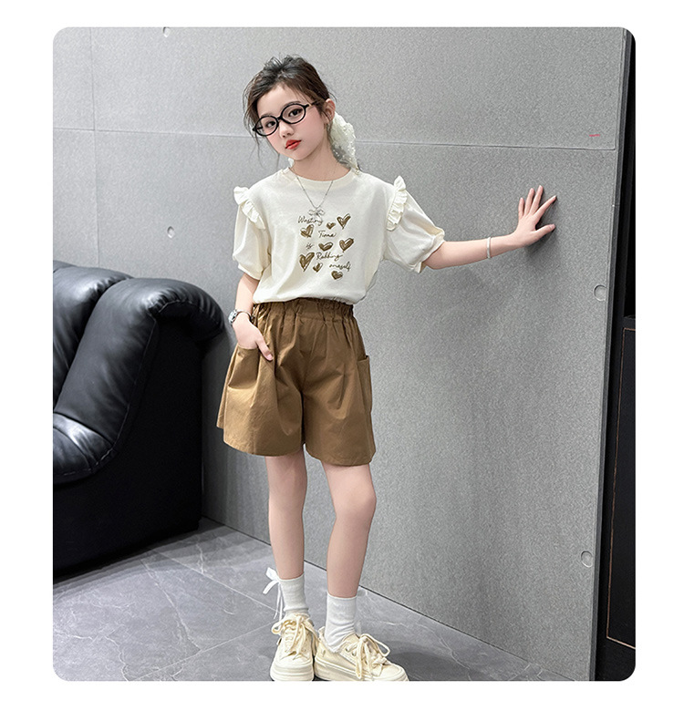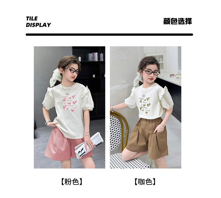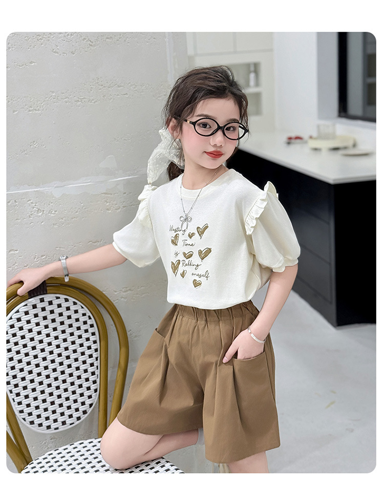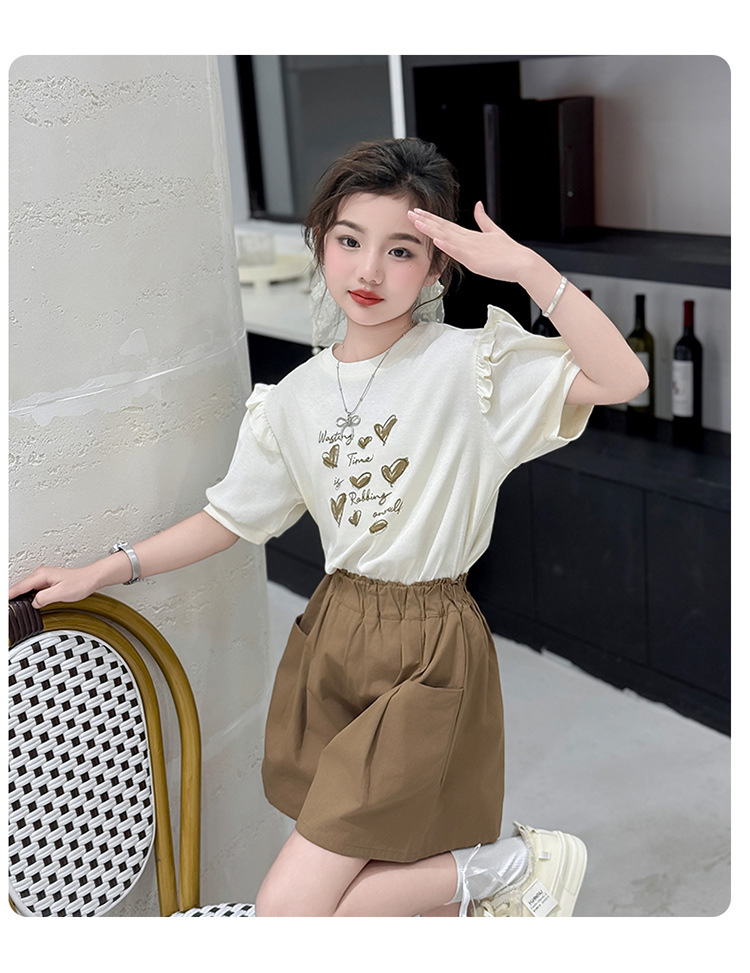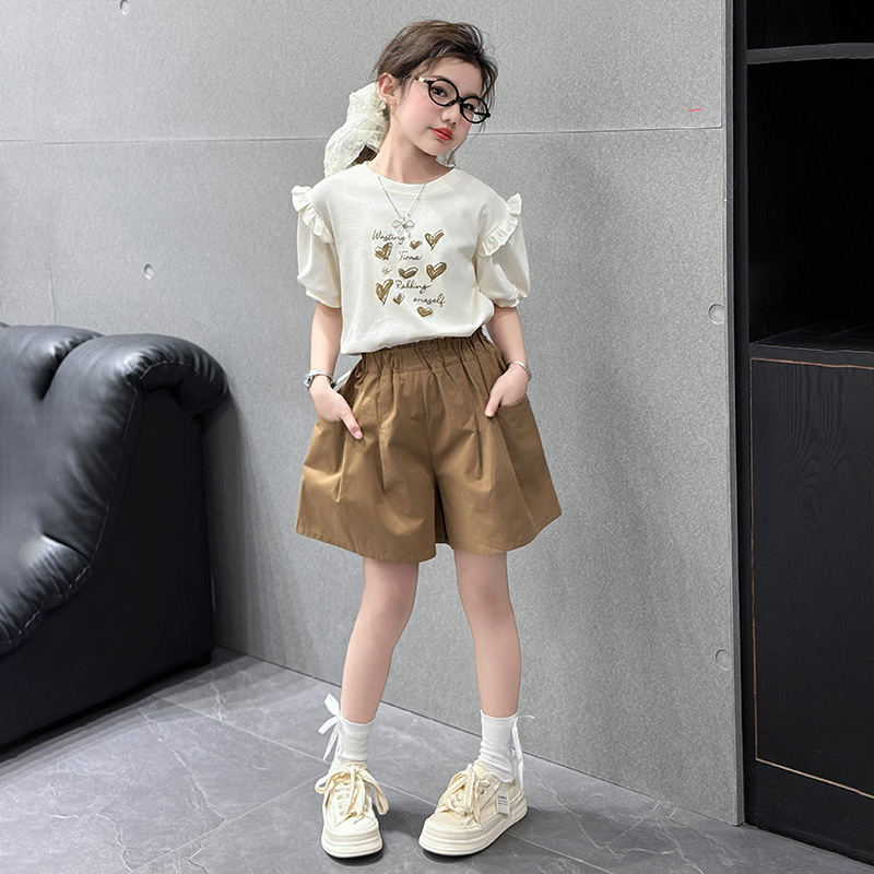 여자 반팔 반팔 세트 2025 년 여름 새 스타일 소녀의 달콤한 레이스 퍼프 소매 티셔츠 반바지 투피스 세트스토어 가기