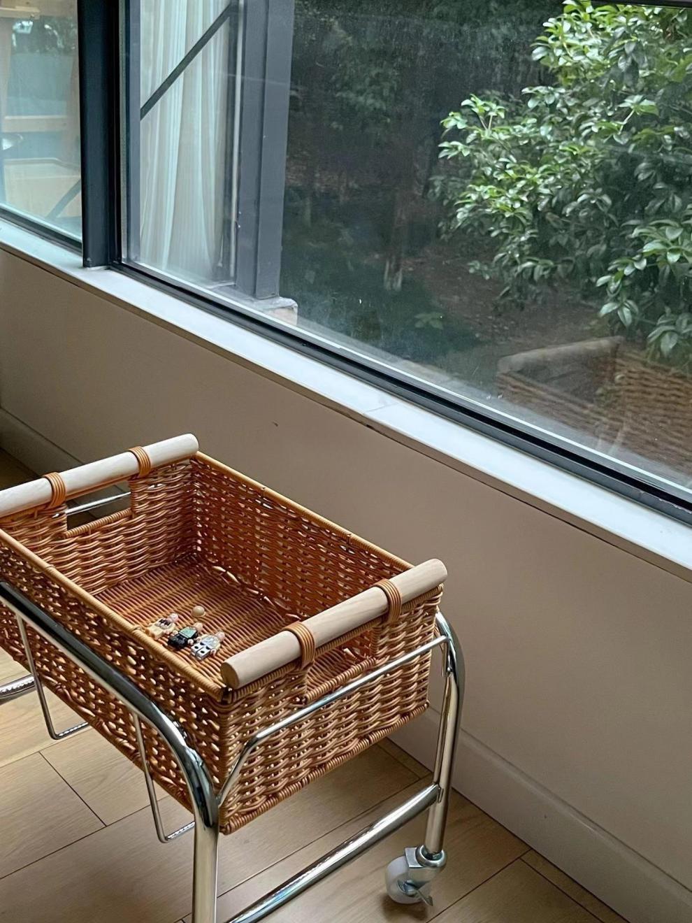 중간 고대 등나무 바퀴 달린 카트 저장 바구니 금속 스낵 선반 저장 선반 홈 저장 상자 홈 거실