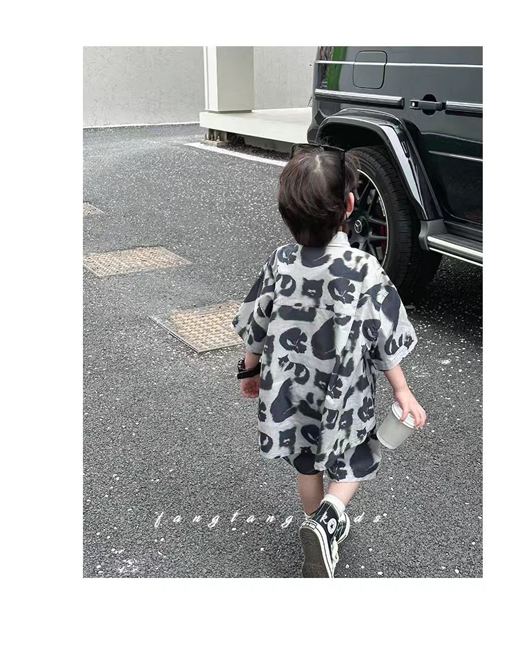 여름 신작 소년과 어린이 숲 스타일 맞춤형 여름 회색 고양이 셔츠 반팔 비치 반바지 투피스 세트스토어 가기