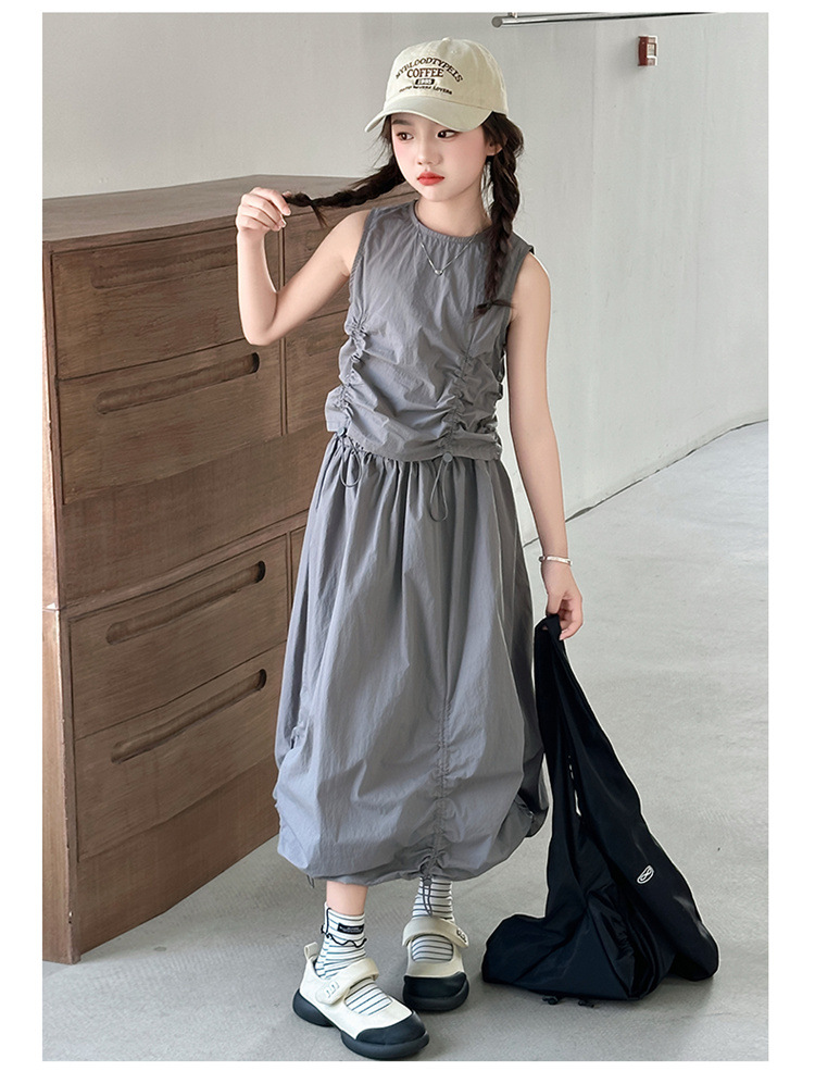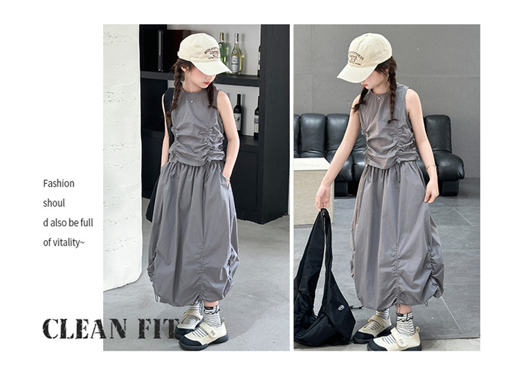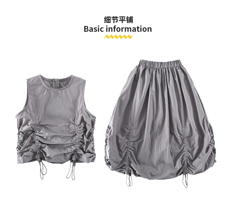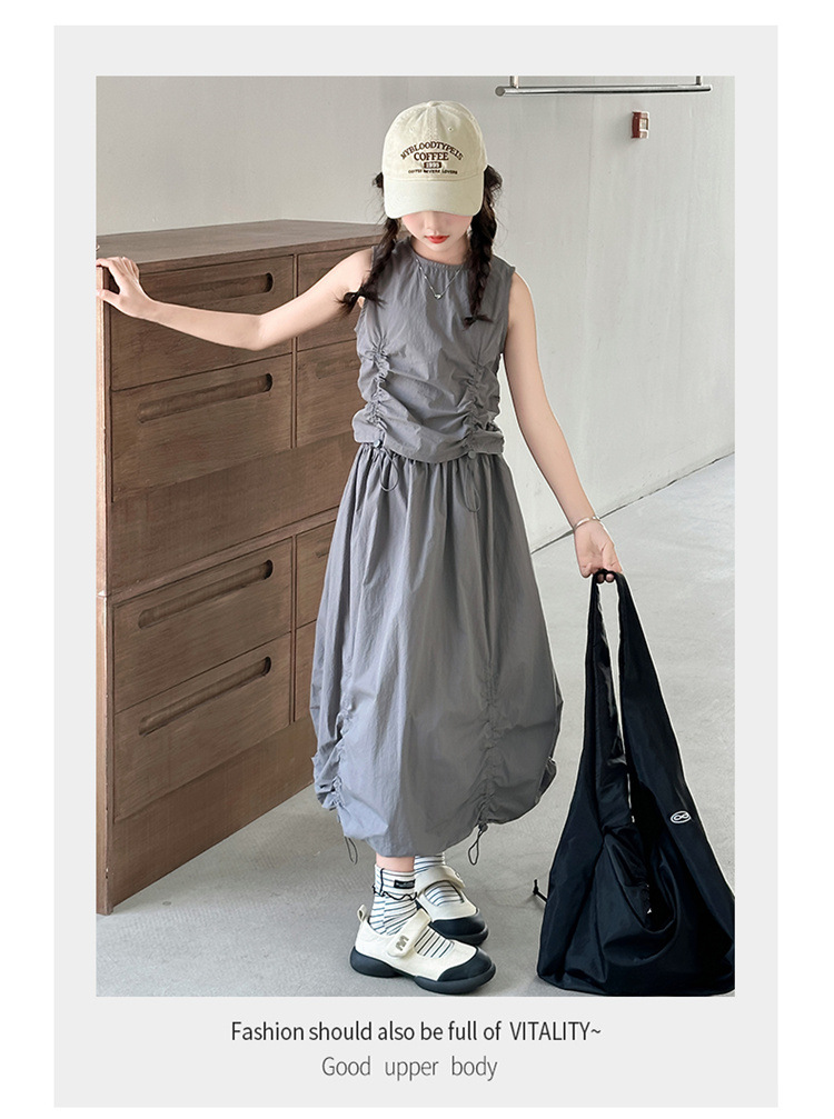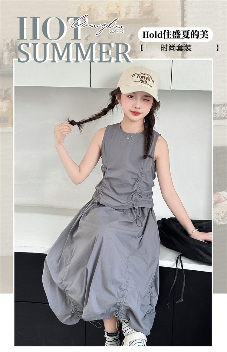 소녀 세트 2025 여름 새 스타일 소녀 유행 주름 민소매 조끼 드로우 스트링 작업복 유행 절반 길이 스커트스토어 가기