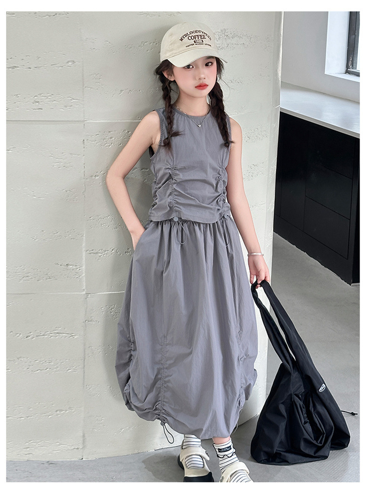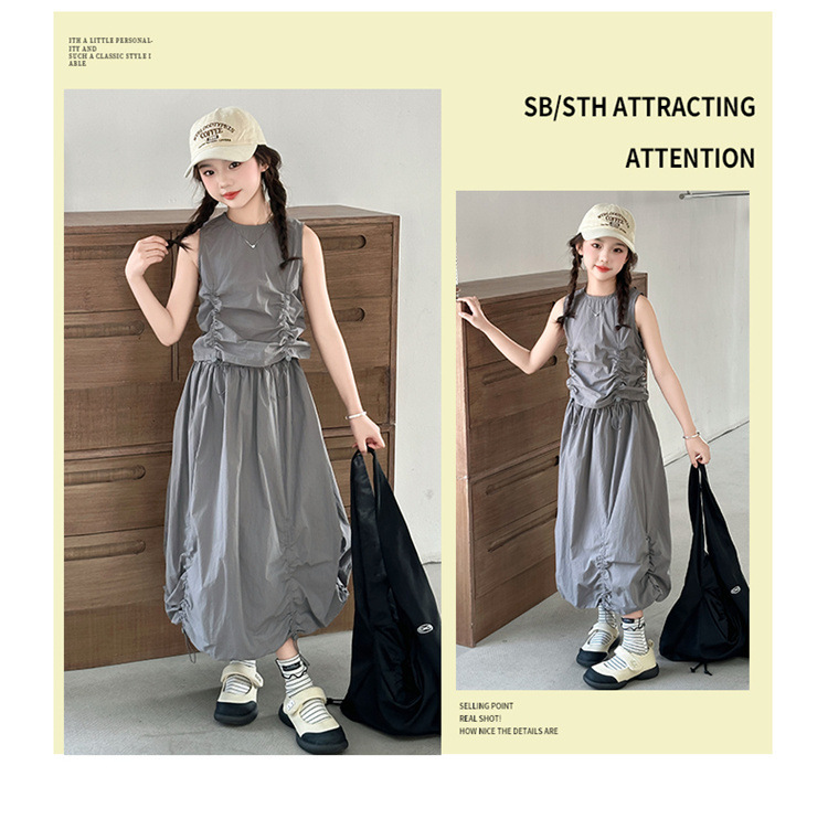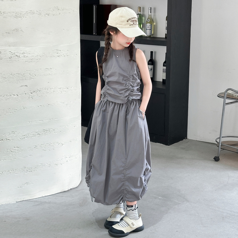 소녀 세트 2025 여름 새 스타일 소녀 유행 주름 민소매 조끼 드로우 스트링 작업복 유행 절반 길이 스커트