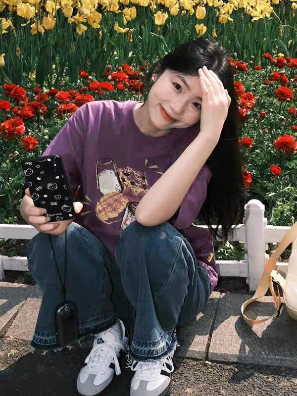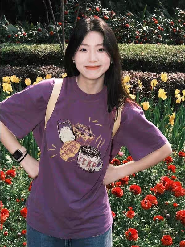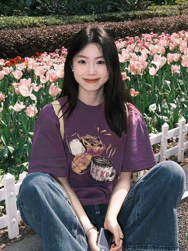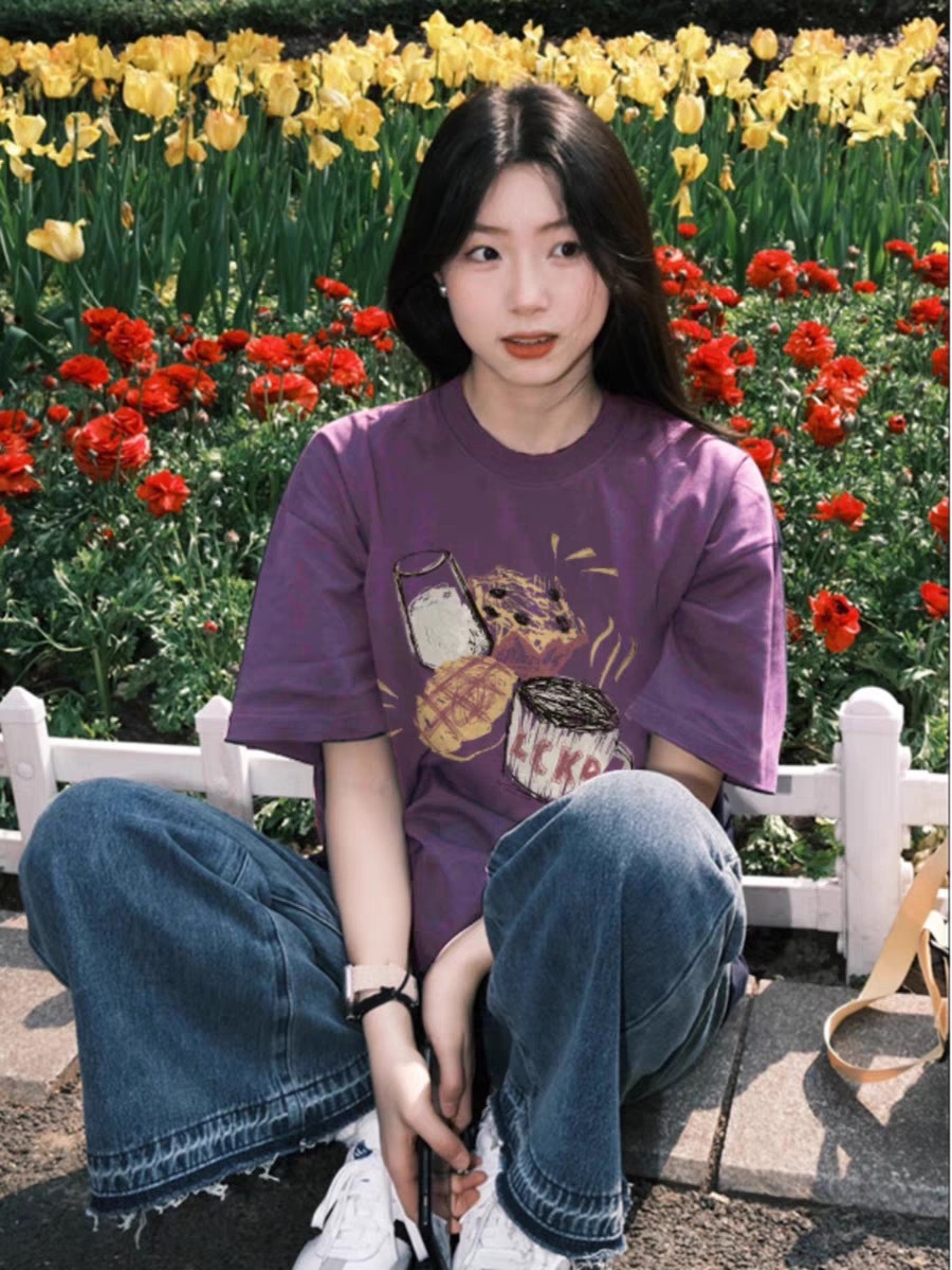 유럽과 미국의 포도 보라색 면 반팔 티셔츠 여성 여름 새로운 디자인 감각 느슨한 게으른 홍콩 스타일 세련된 트렌디 탑스토어 가기