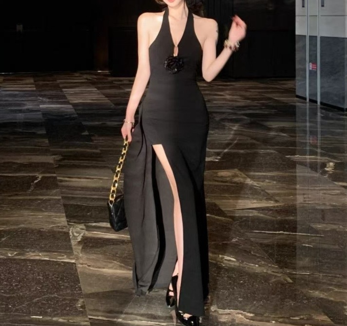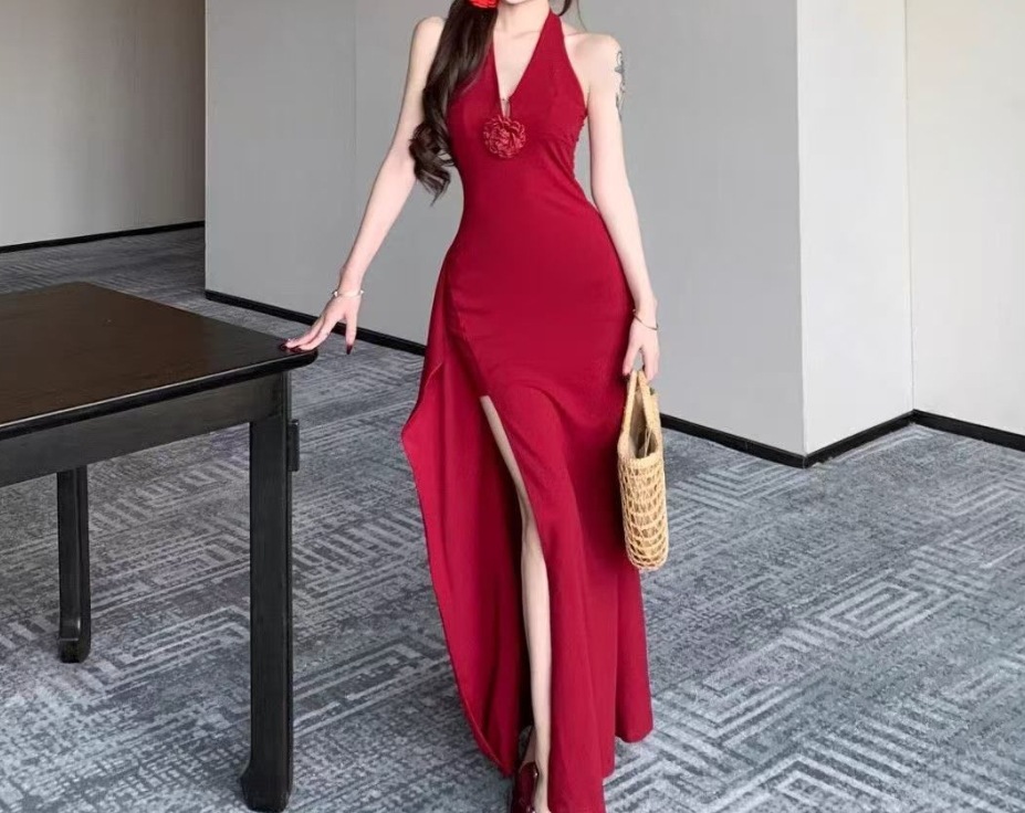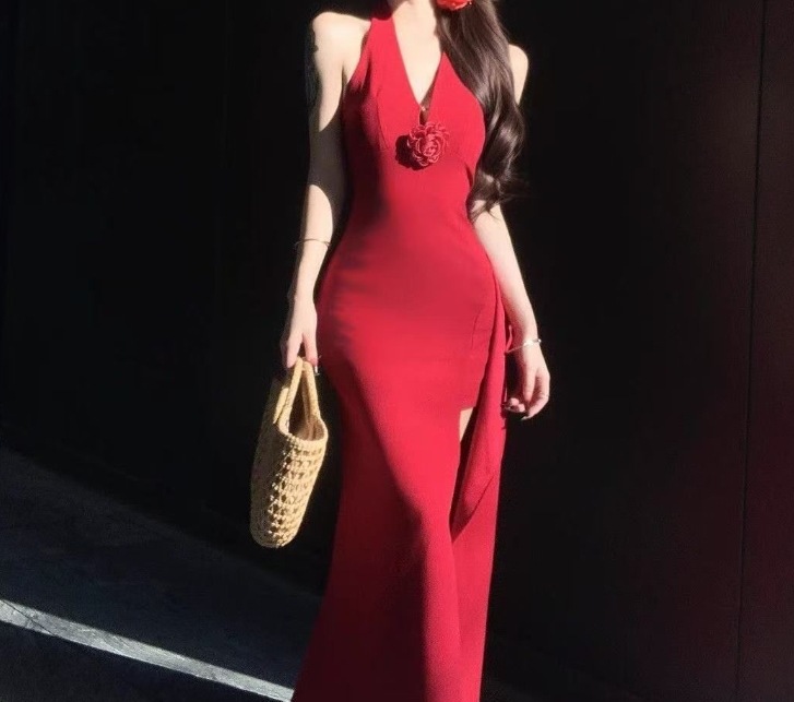 여성을위한 붉은 입체 꽃 홀터넥 드레스 여름 슬림 드레스 롱 스커트 순수한 욕망 허리 슬릿 힙 스커트