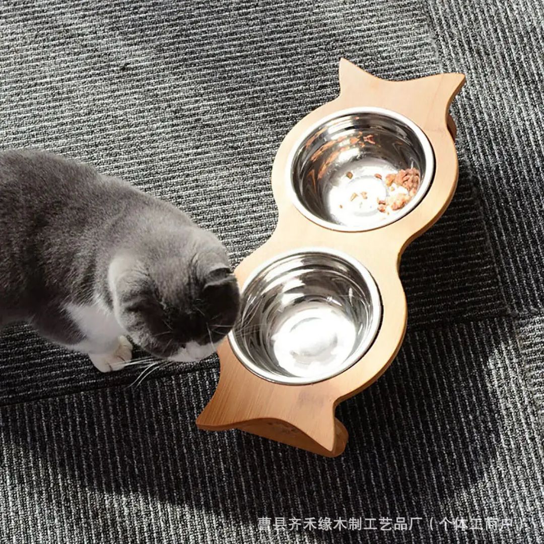 대나무 애완 동물 고양이 먹이 랙 2-in-1 더블 그릇 식탁 단단한 나무 동물 용품 개밥 그릇 랙 피더스토어 가기
