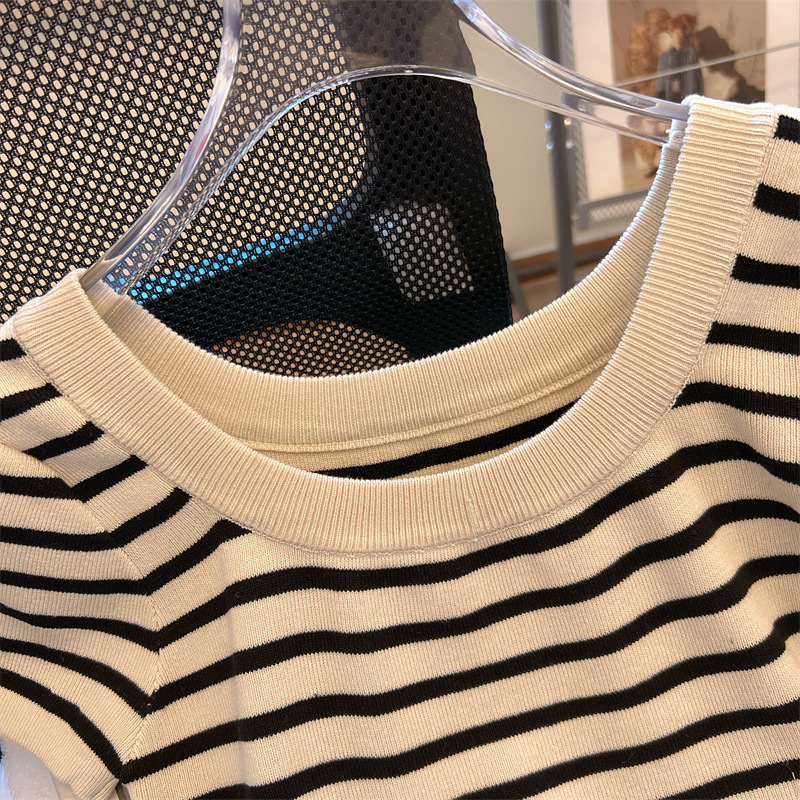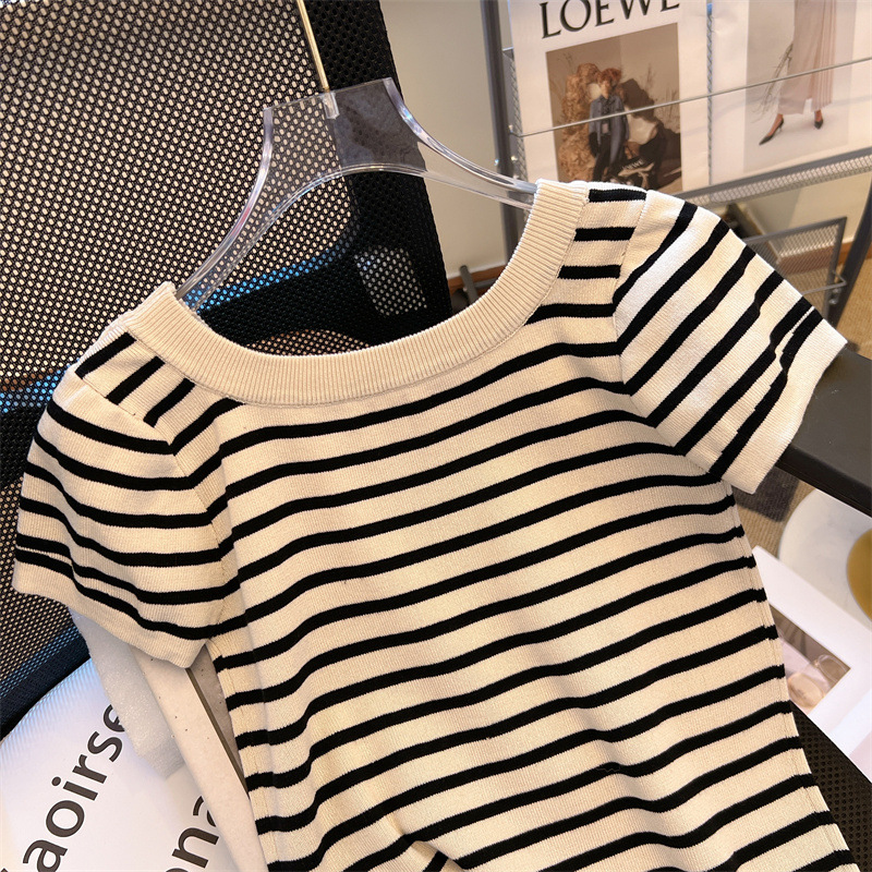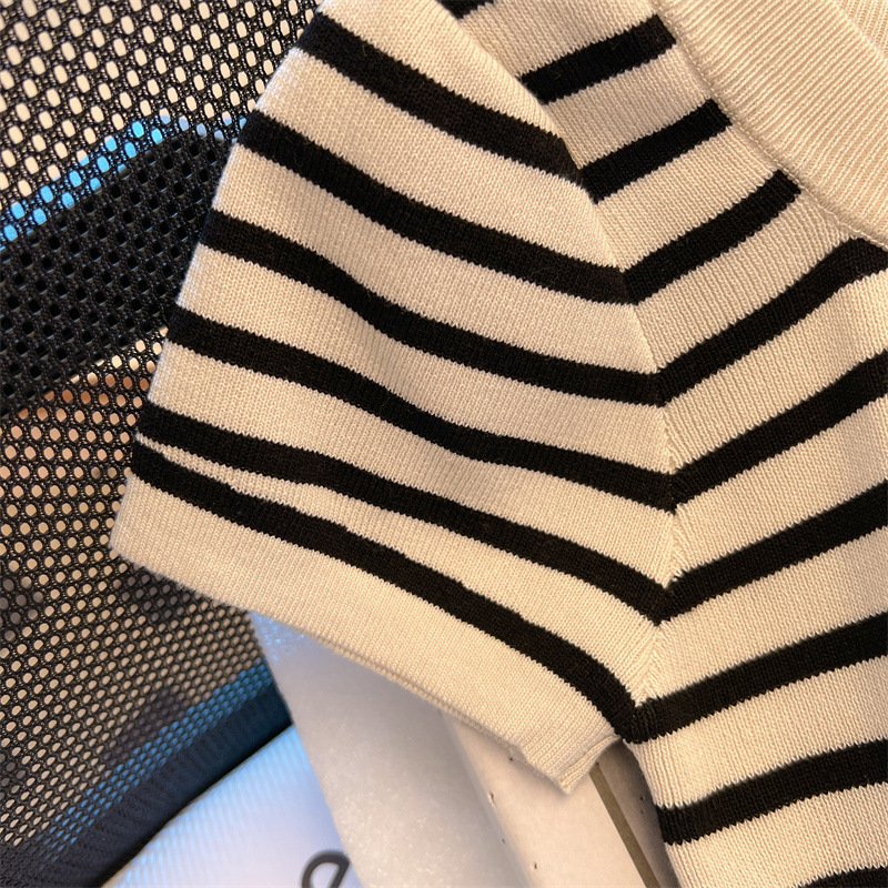 여름 줄무늬 반팔 티셔츠 숙녀 2025 새로운 작은 폭발 하이 엔드 재킷 아이스 실크 뜨개질스토어 가기