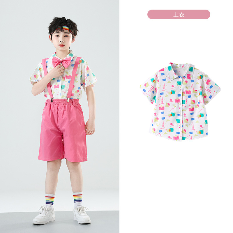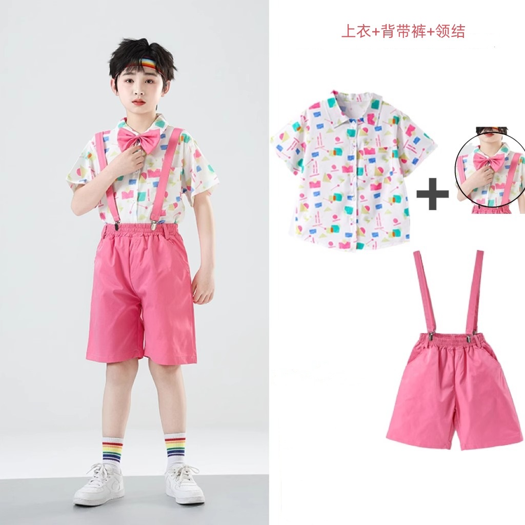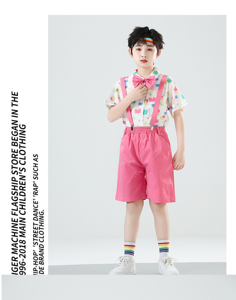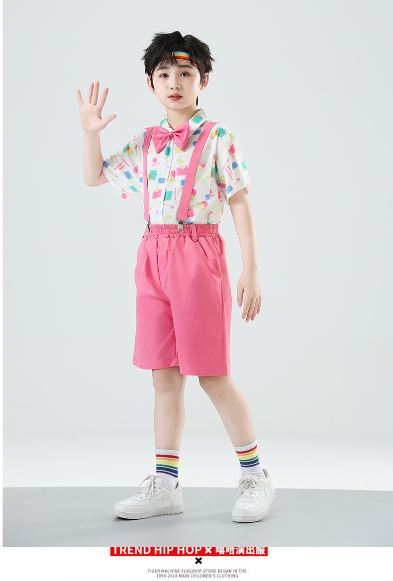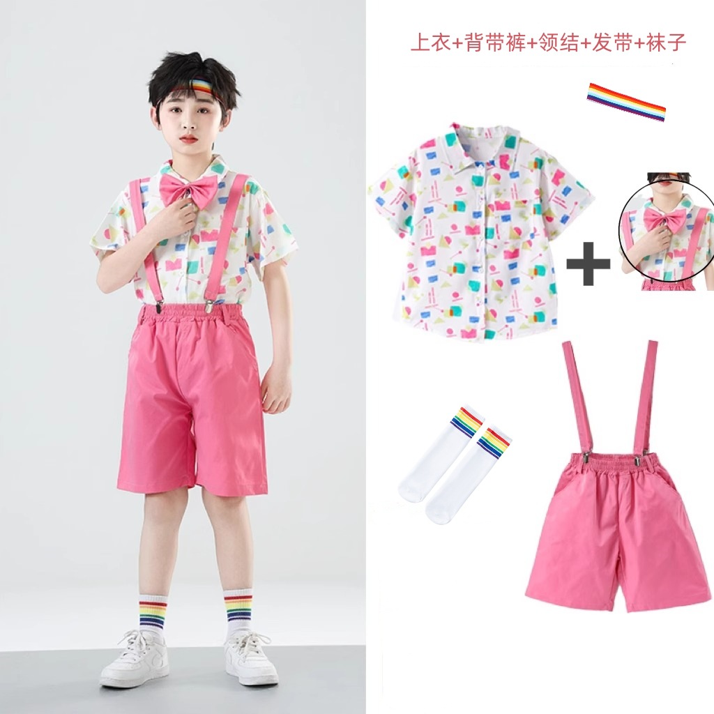 • 화이트 플로럴 셔츠 + 핑크 멜빵 반바지 + 핑크 나비넥타이 + 레인보우 머리띠