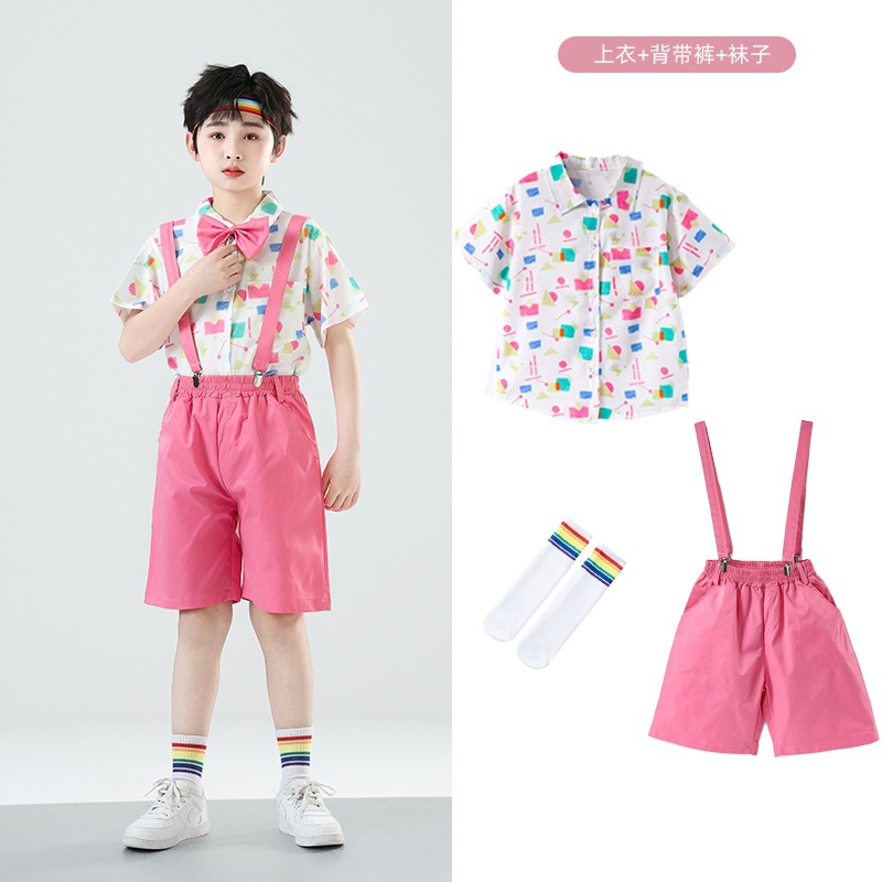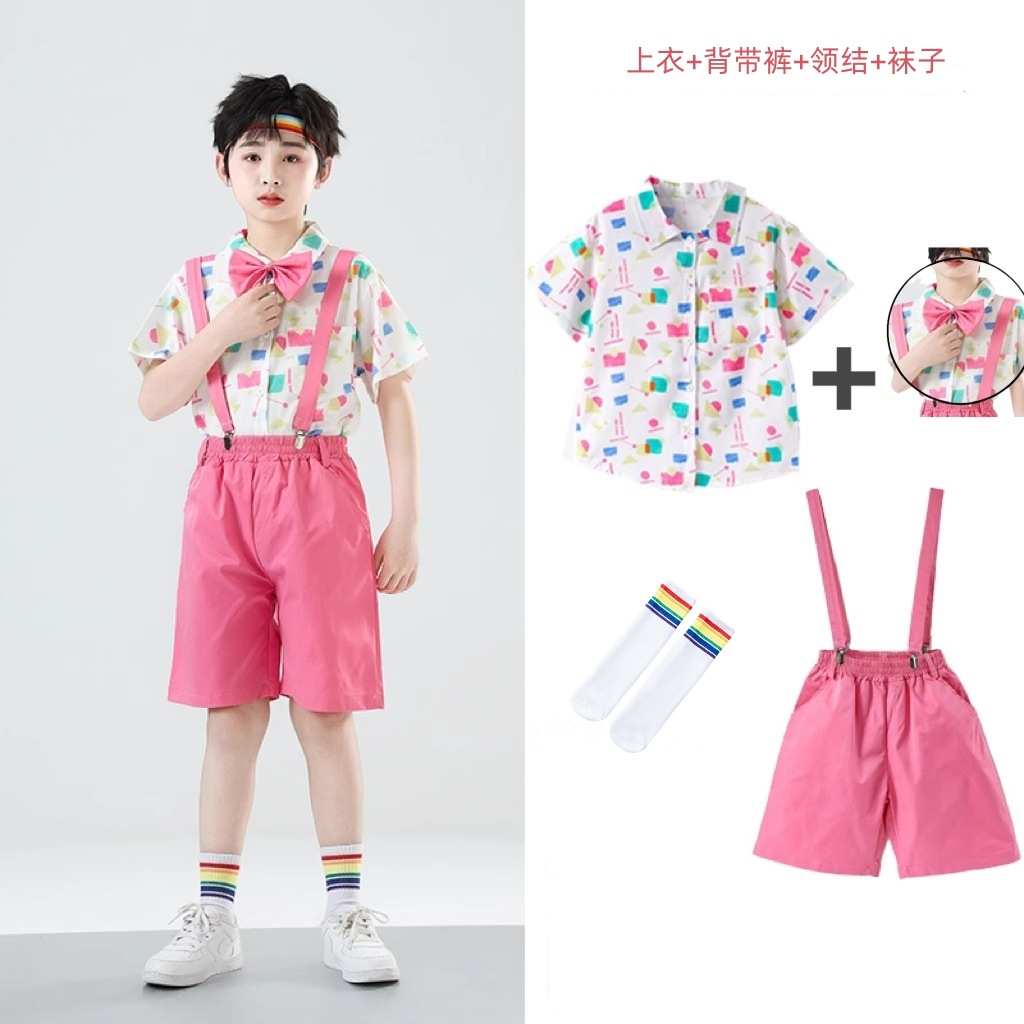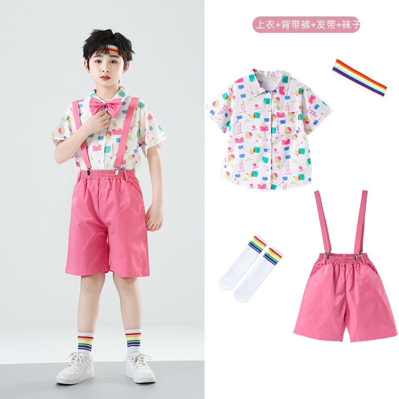 • 흰색 꽃무늬 셔츠 + 핑크색 멜빵바지 + 핑크색 나비넥타이 + 무지개 양말