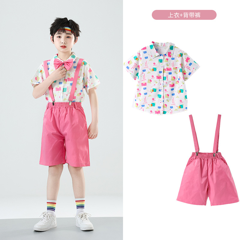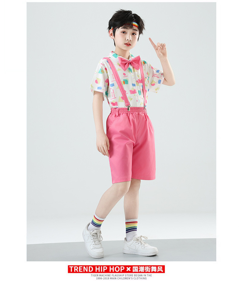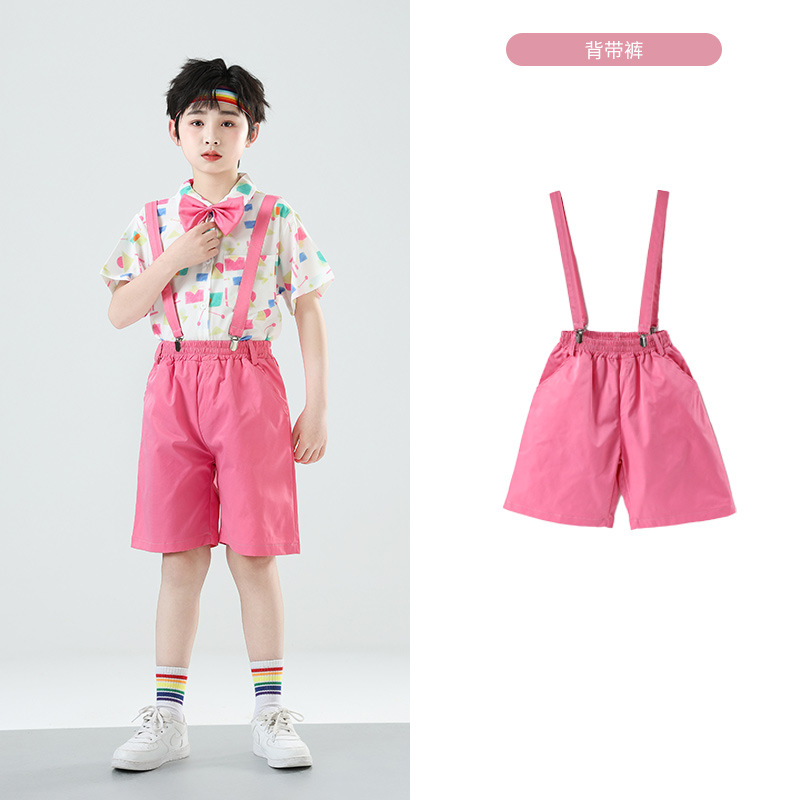 • 화이트 플로럴 셔츠 + 핑크 멜빵 반바지 + 핑크 나비넥타이