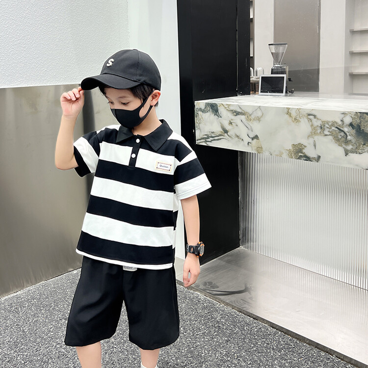 어린이 여름 새로운 컬러 블록 줄무늬 POLO 칼라 엘 반팔 소년과 아기 캐주얼 느슨한 바지 세트