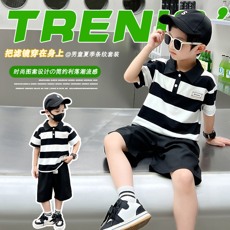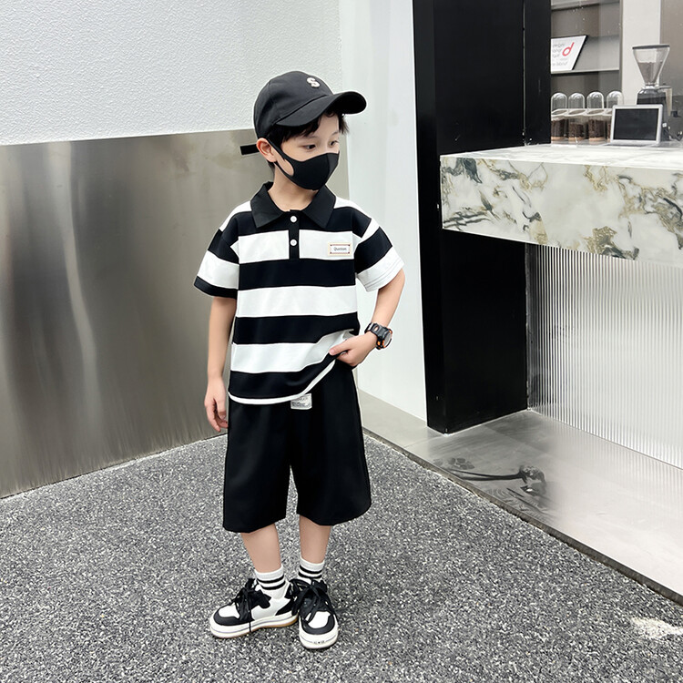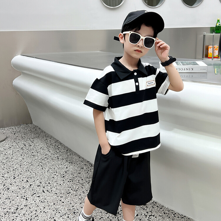 어린이 여름 새로운 컬러 블록 줄무늬 POLO 칼라 엘 반팔 소년과 아기 캐주얼 느슨한 바지 세트스토어 가기