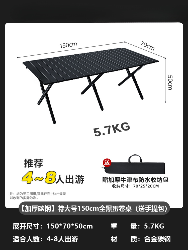 • [두꺼운 탄소강] 특대형 150cm 올블랙 에그롤 테이블 (핸드백 포함)