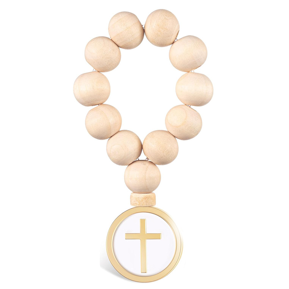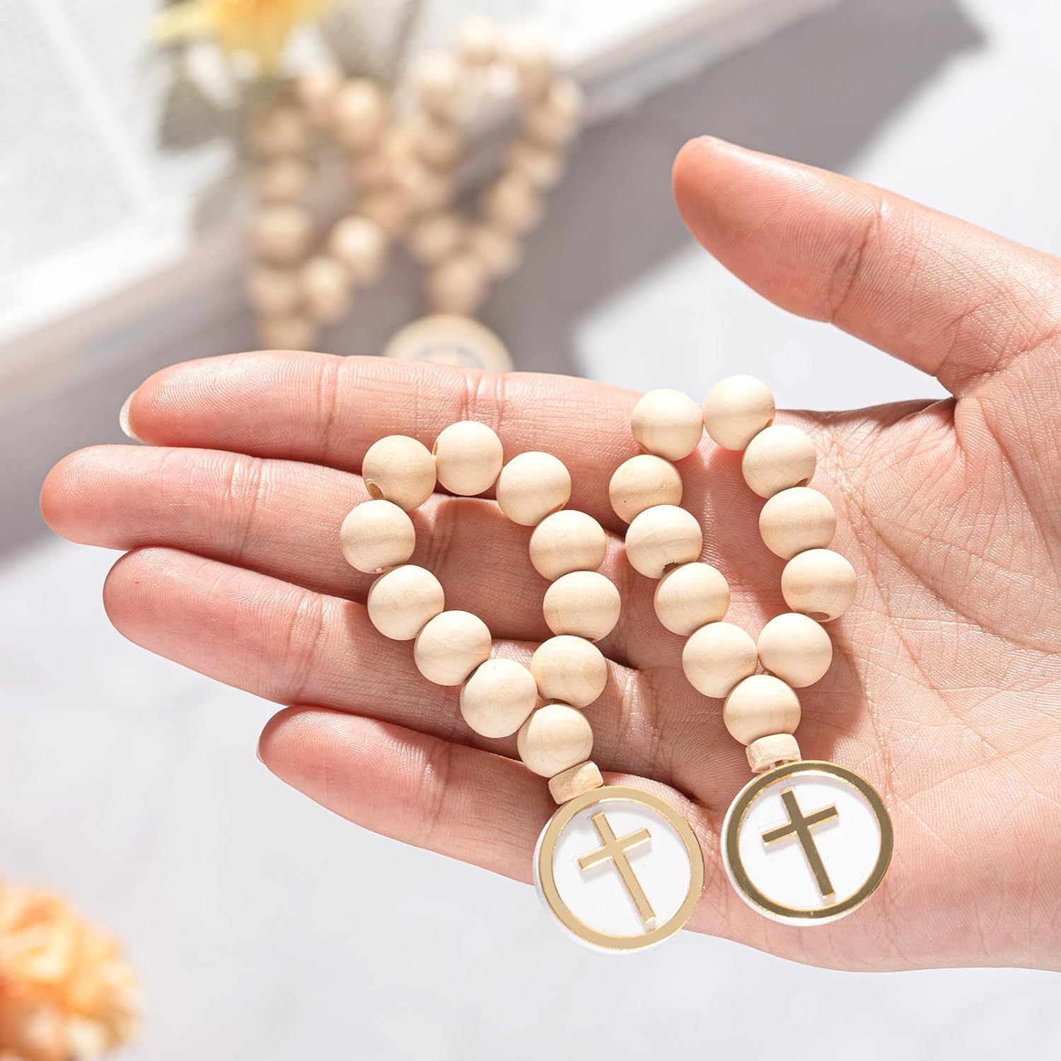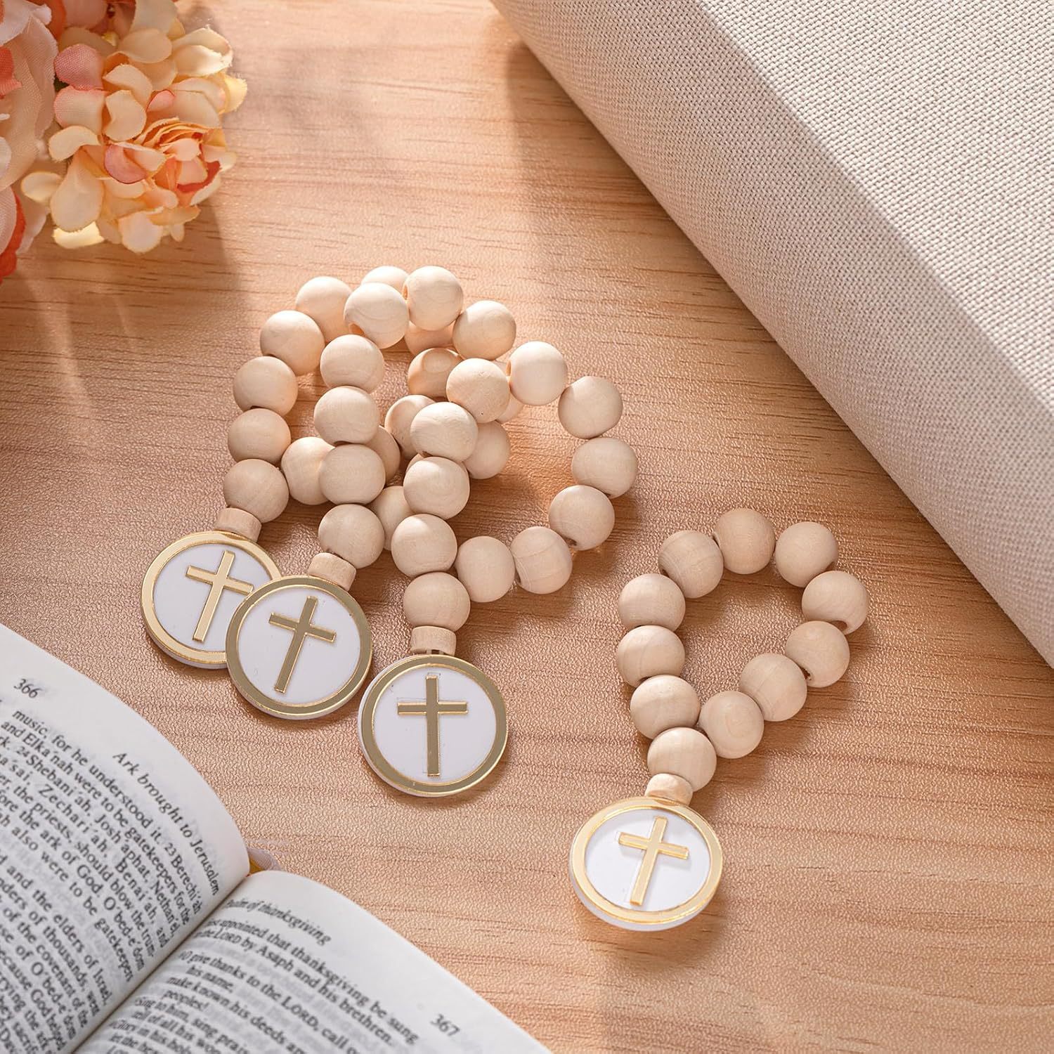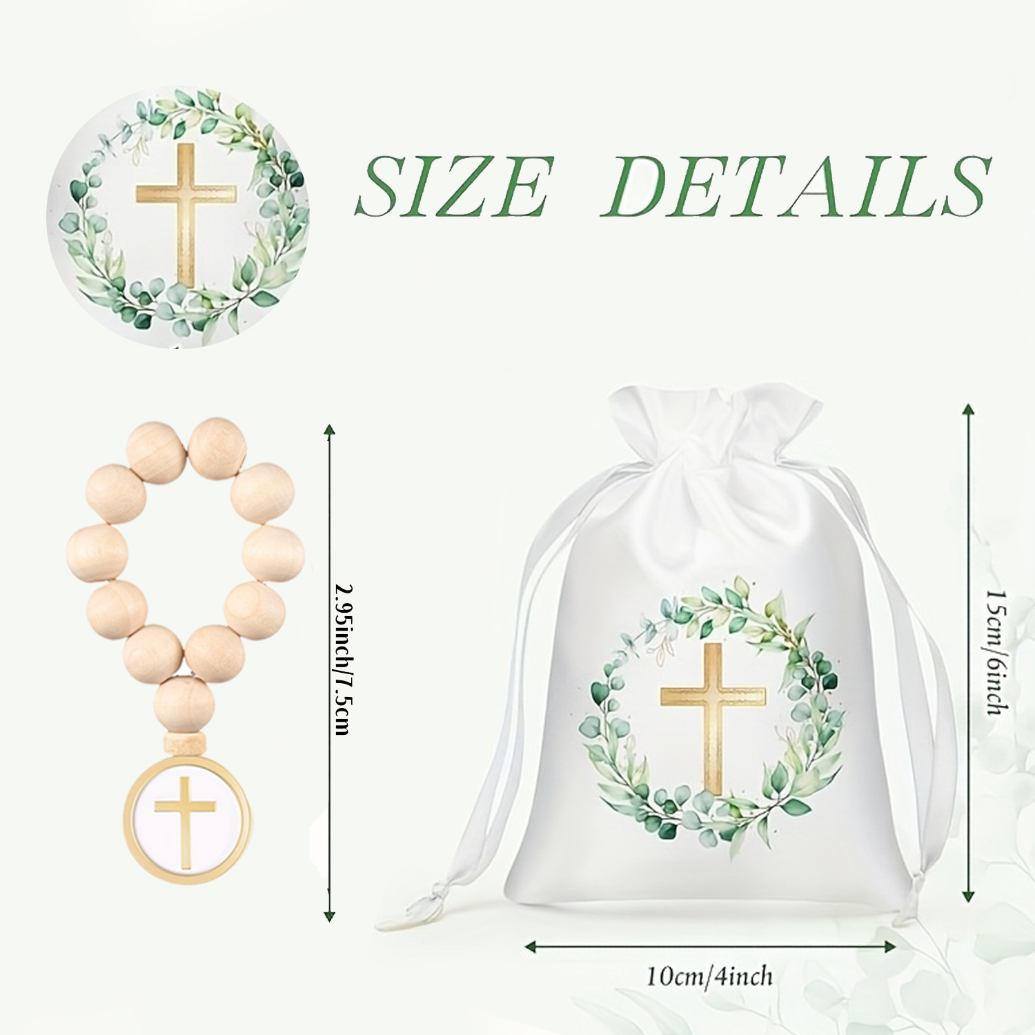 새로운 나무 묵주기기도 묵주와 십자형 흰색 메쉬 가방 성찬식 세례 저장 가방