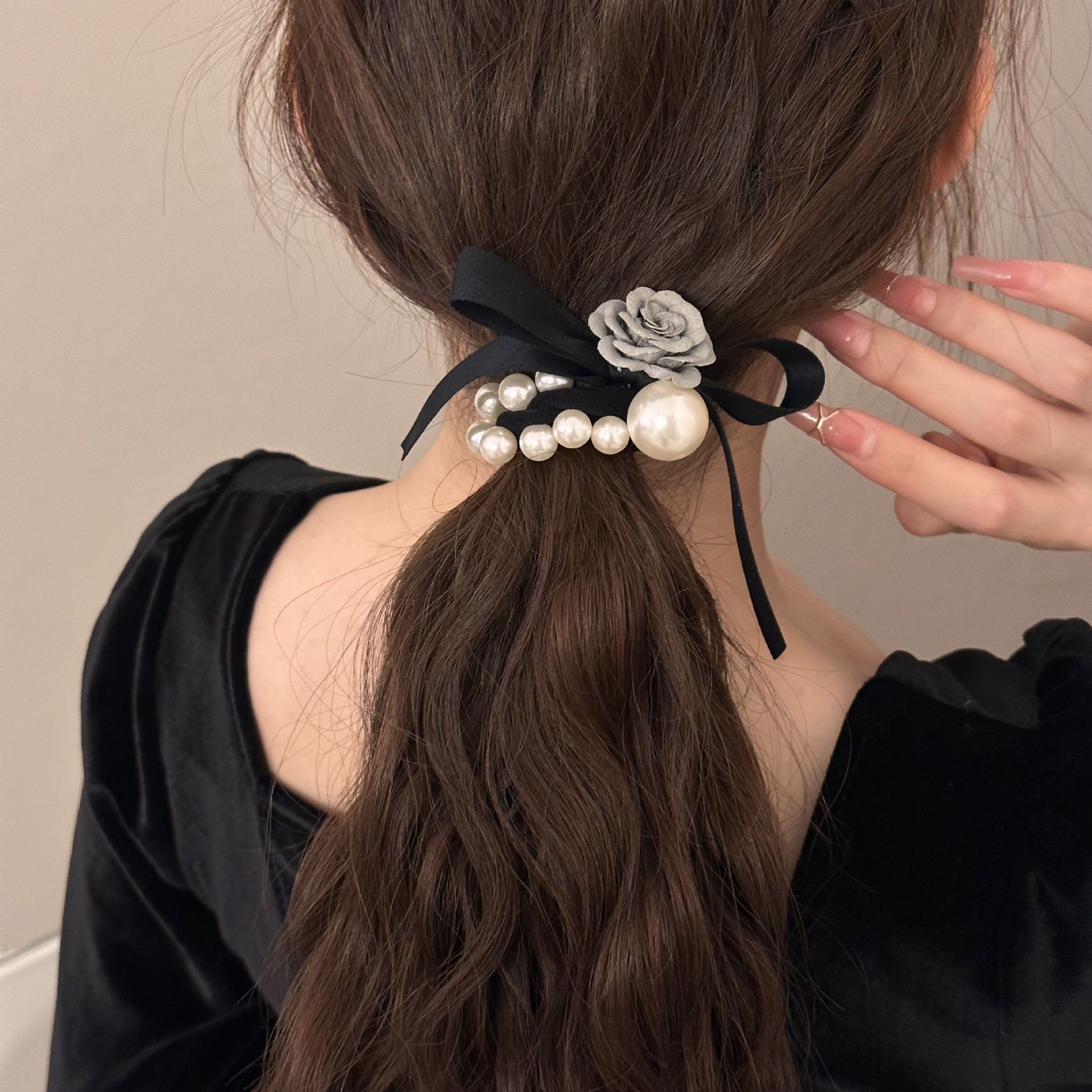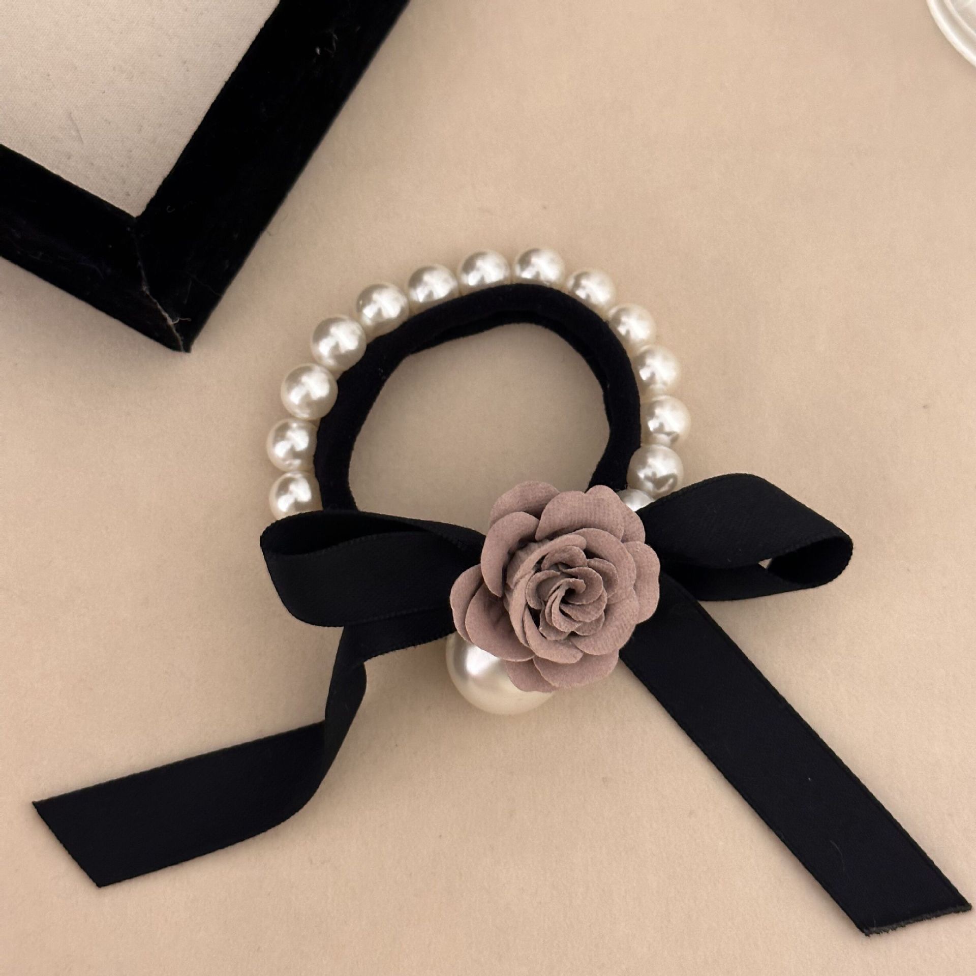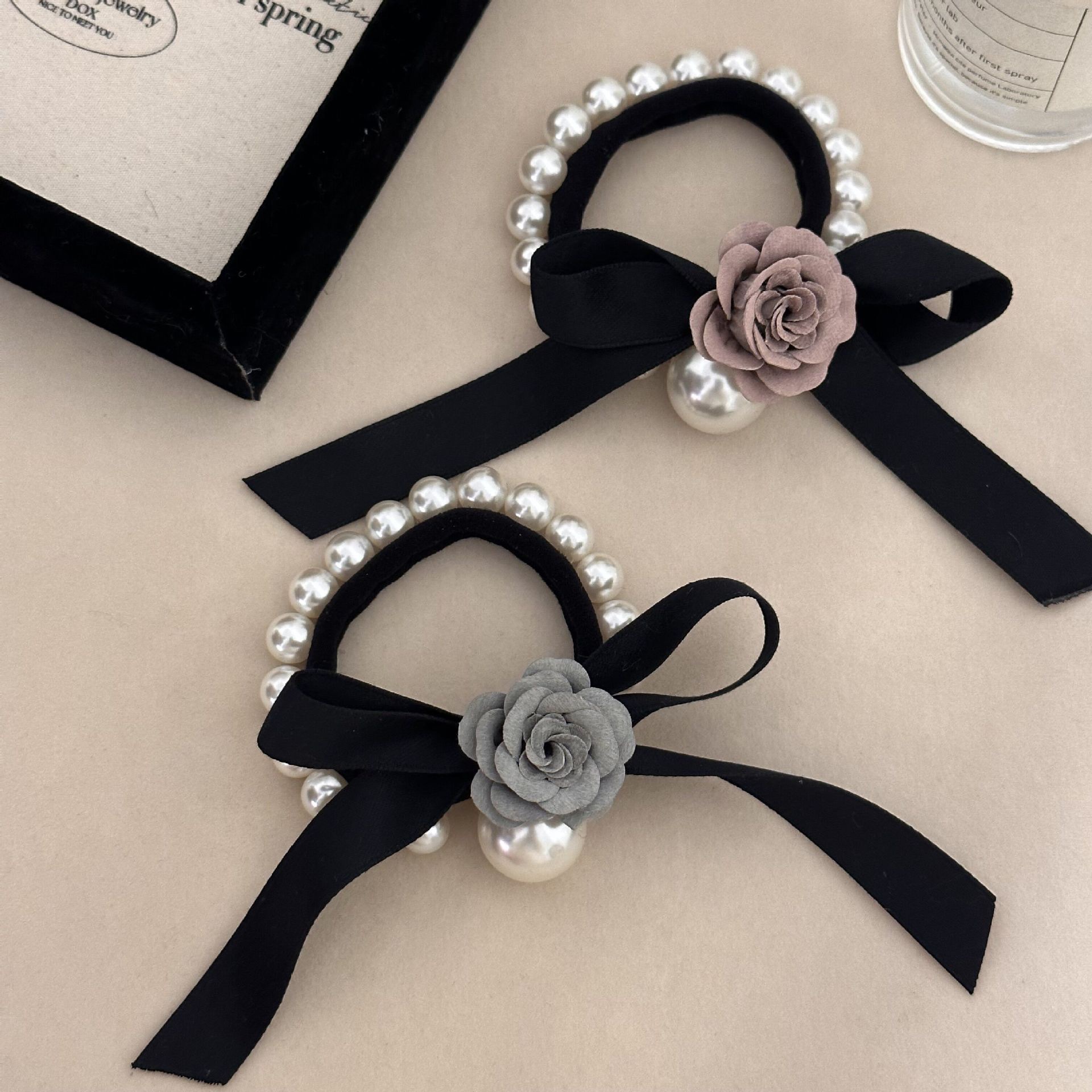 한국 스타일 달콤한 스타일 동백 활 진주 가죽 텐던 헤어 링 간단한 올 매치 새로운 높은 탄성 헤드 라인 헤어 액세서리