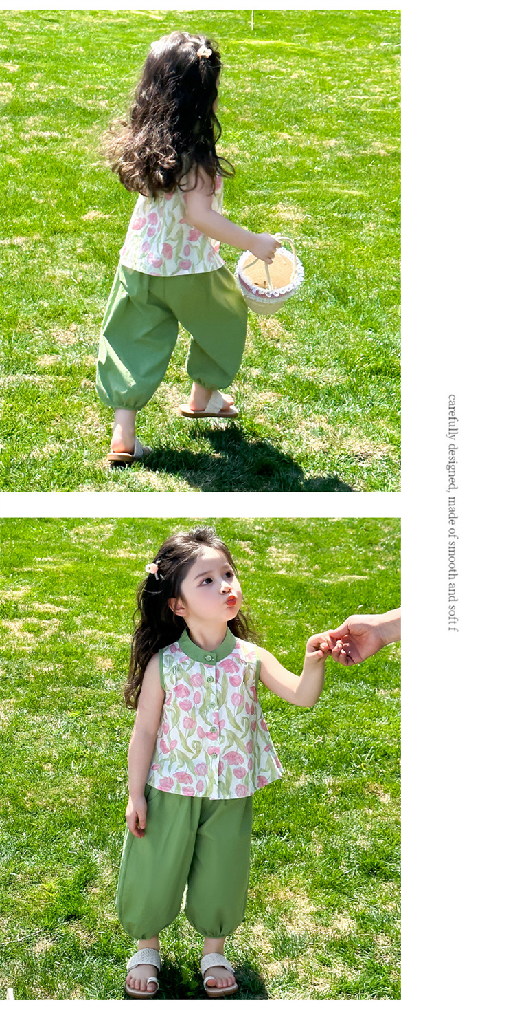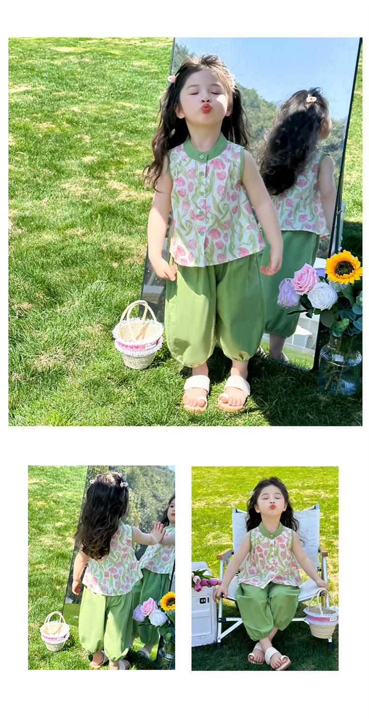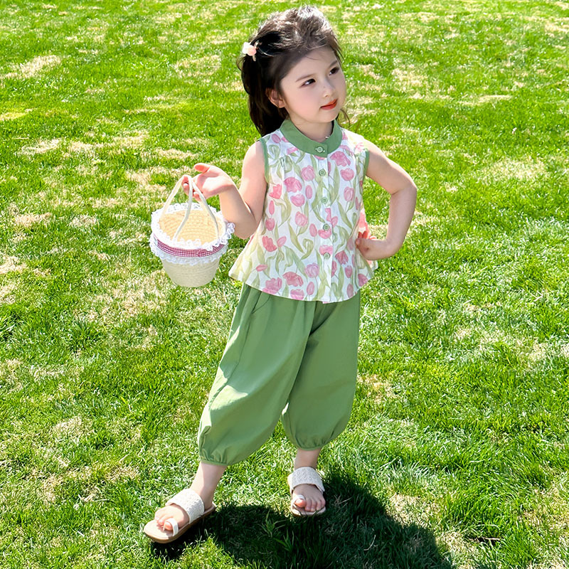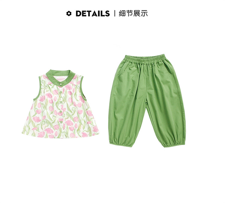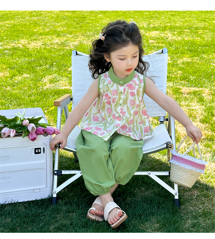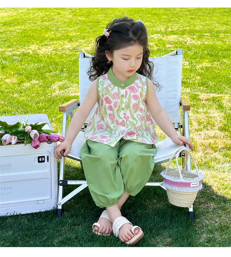 여자 여름 민소매 조끼 세트 2025 새로운 스타일 꽃 탑 레깅스 여름 옷 아동 의류 투피스 세트스토어 가기