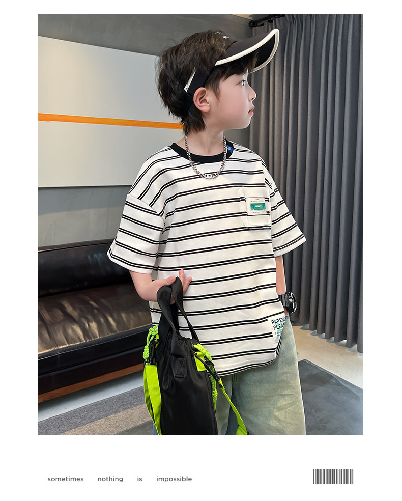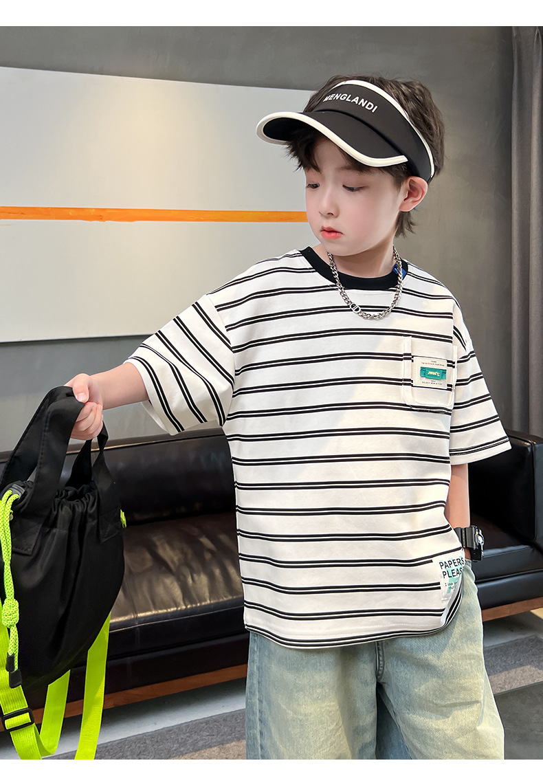 남학생 여름 줄무늬 반팔 티셔츠 2025 새 어린이 여름 반소매 중첩 어린이 여름 면화 탑 트렌디 티셔츠
