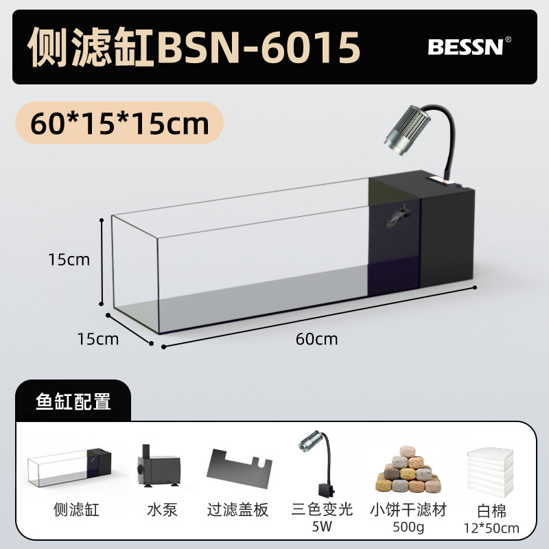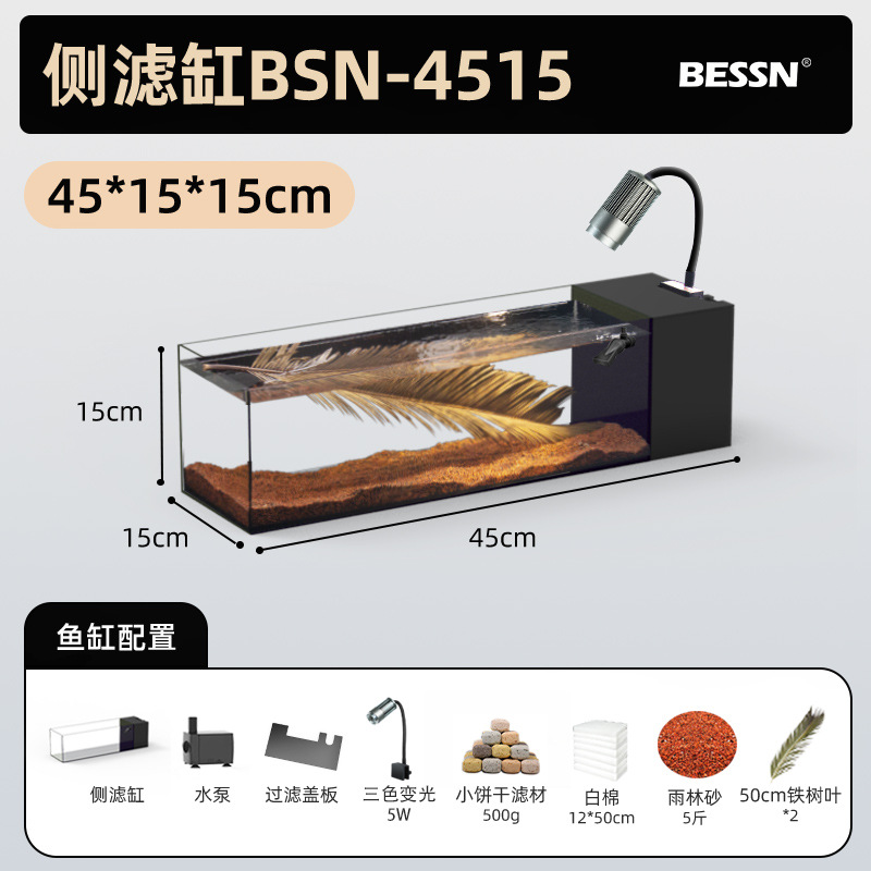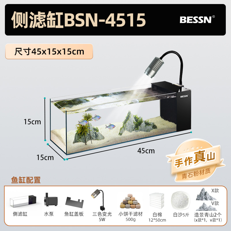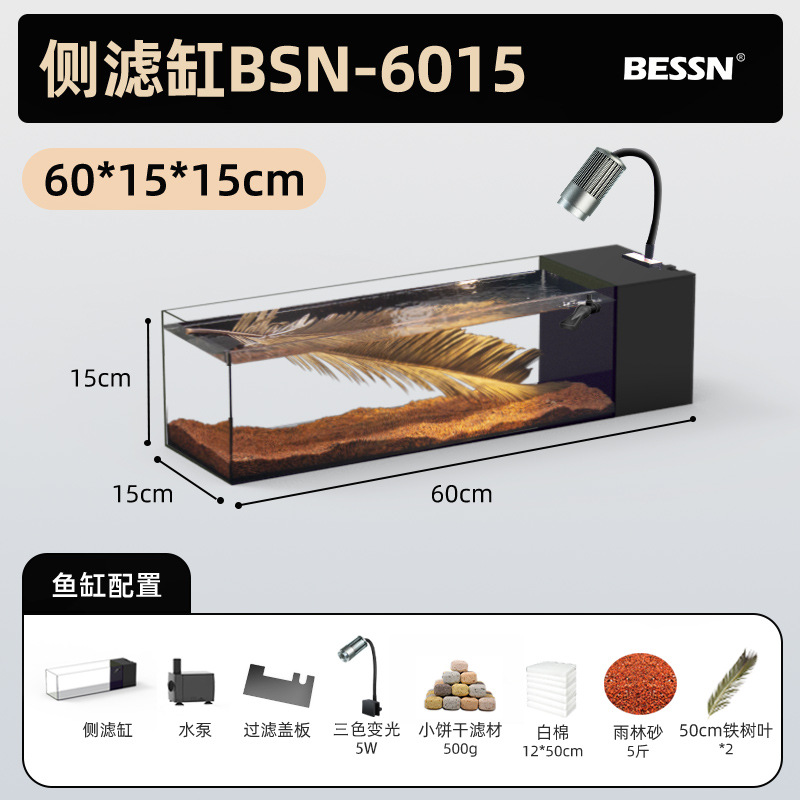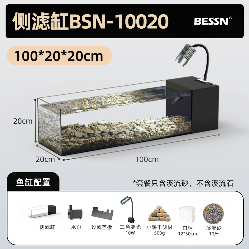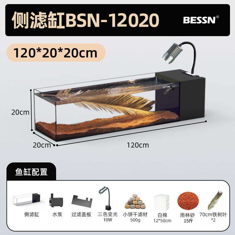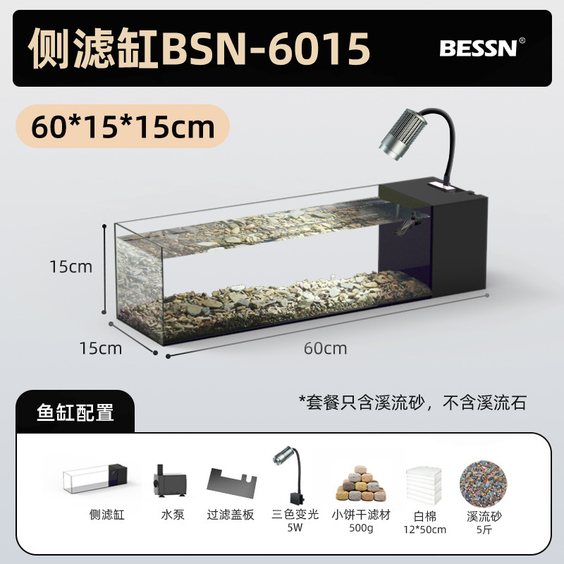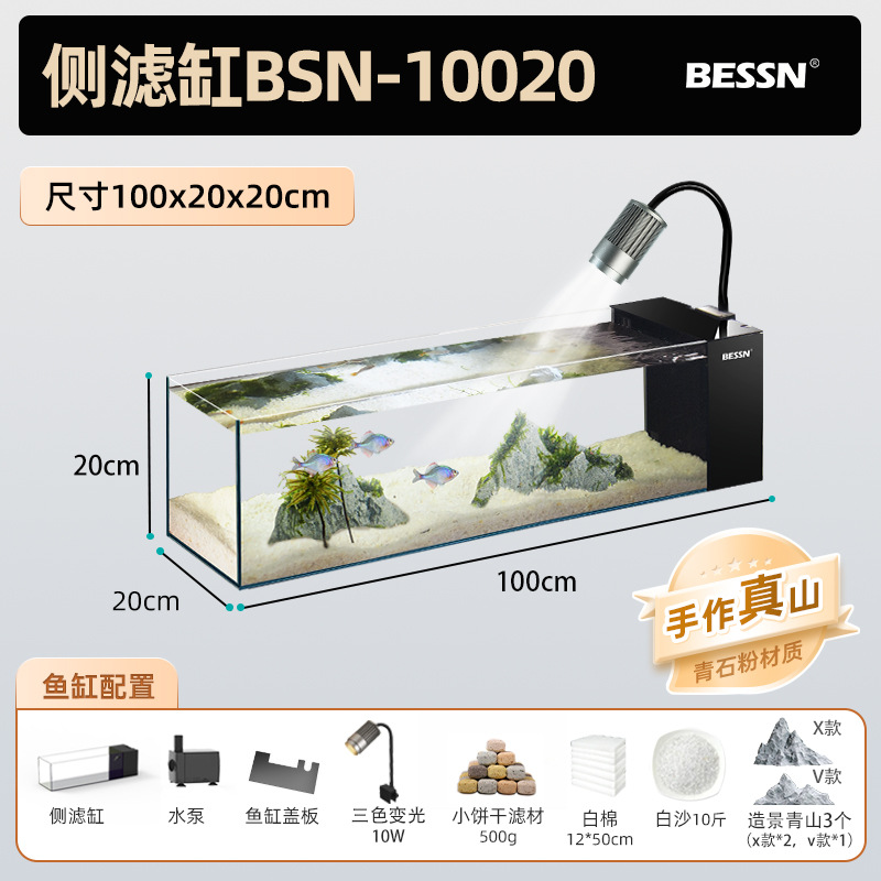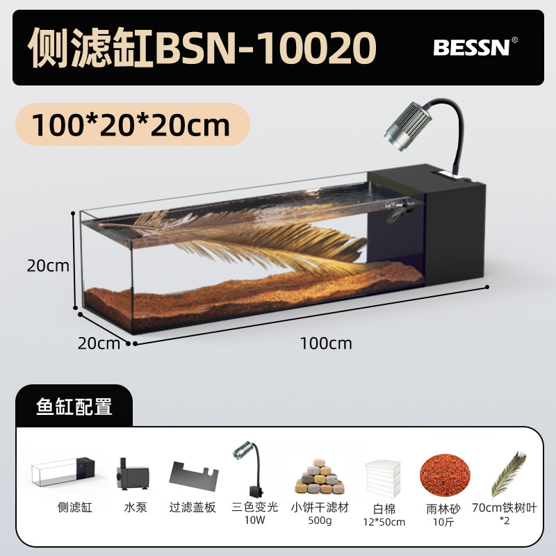 BESSN 데스크탑 스트림 탱크 물고기 탱크 풍경 슈퍼 화이트 탱크 거실 골드 크리스탈 유리 탱크 사이드 필터 남미 긴 물고기 탱크