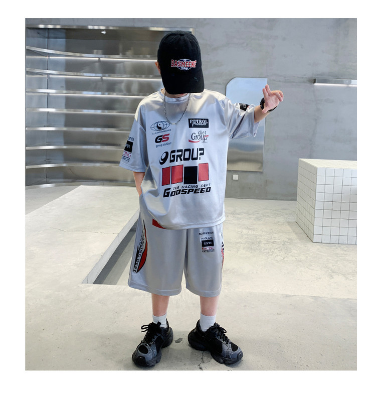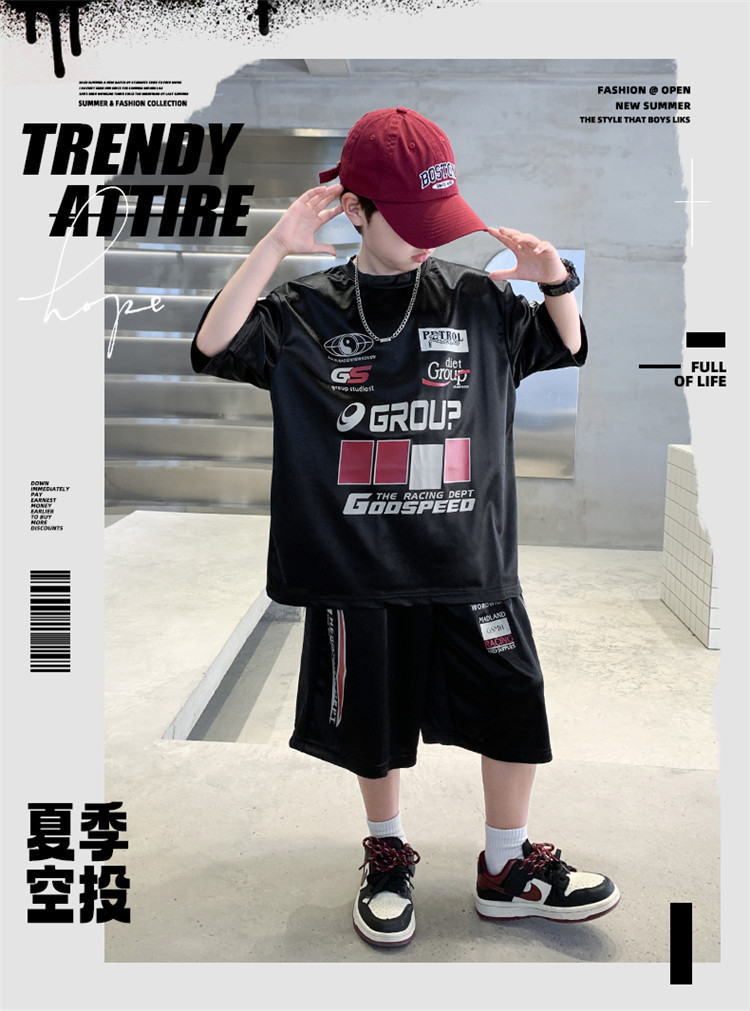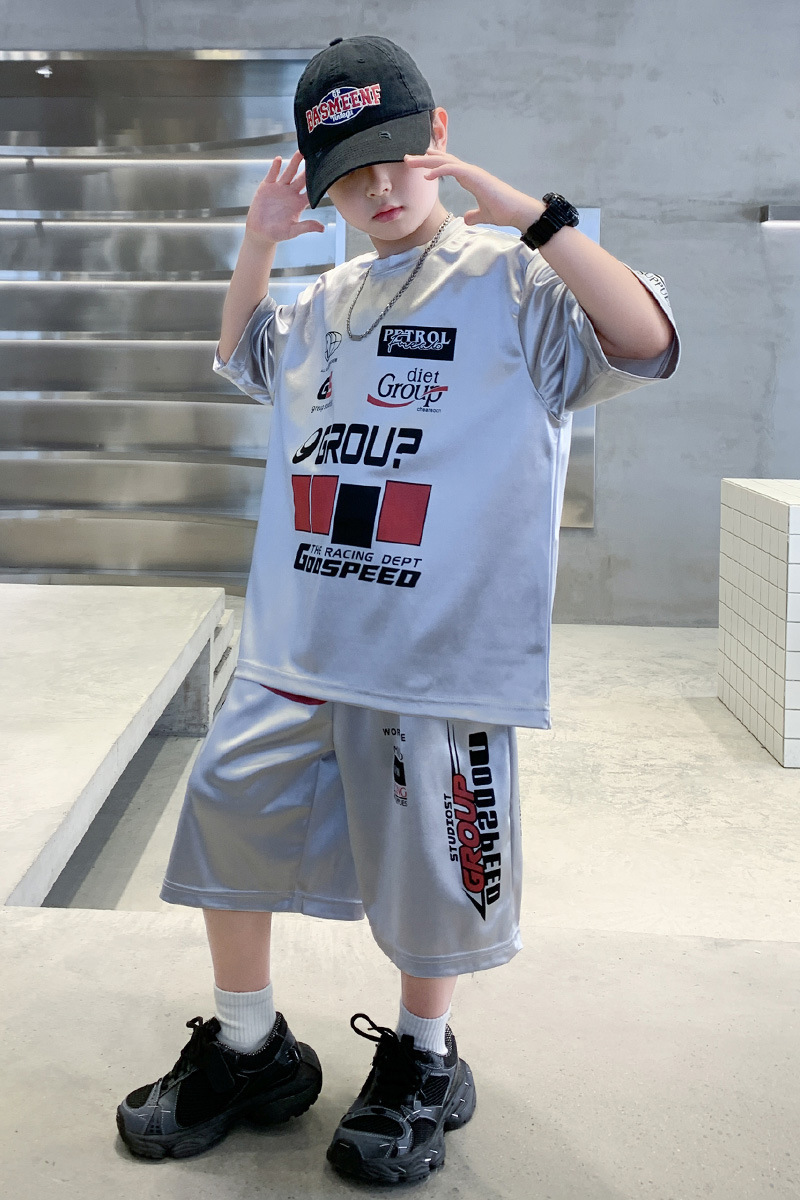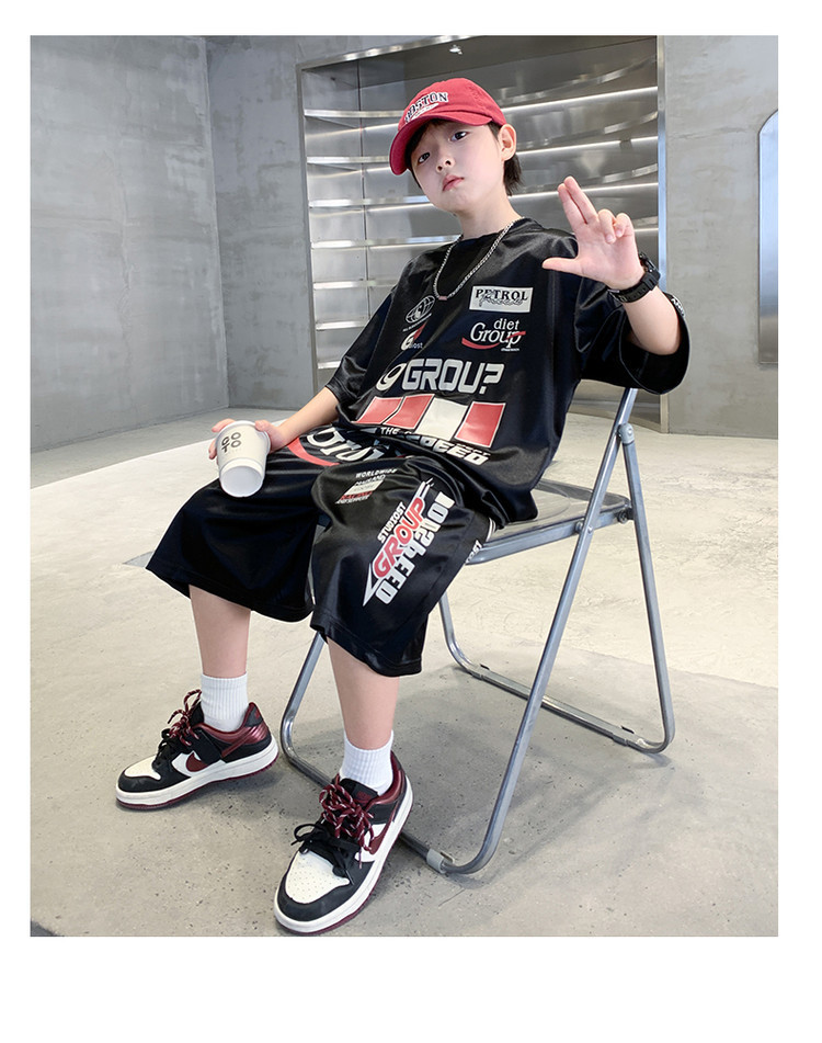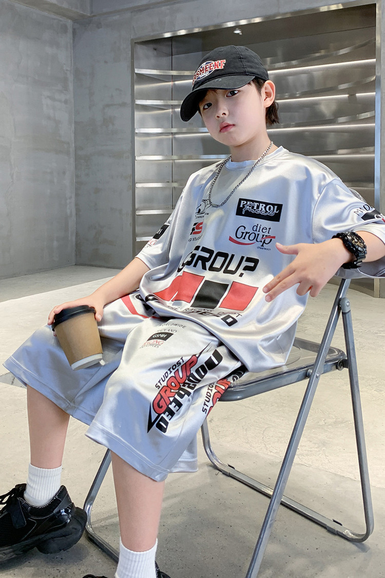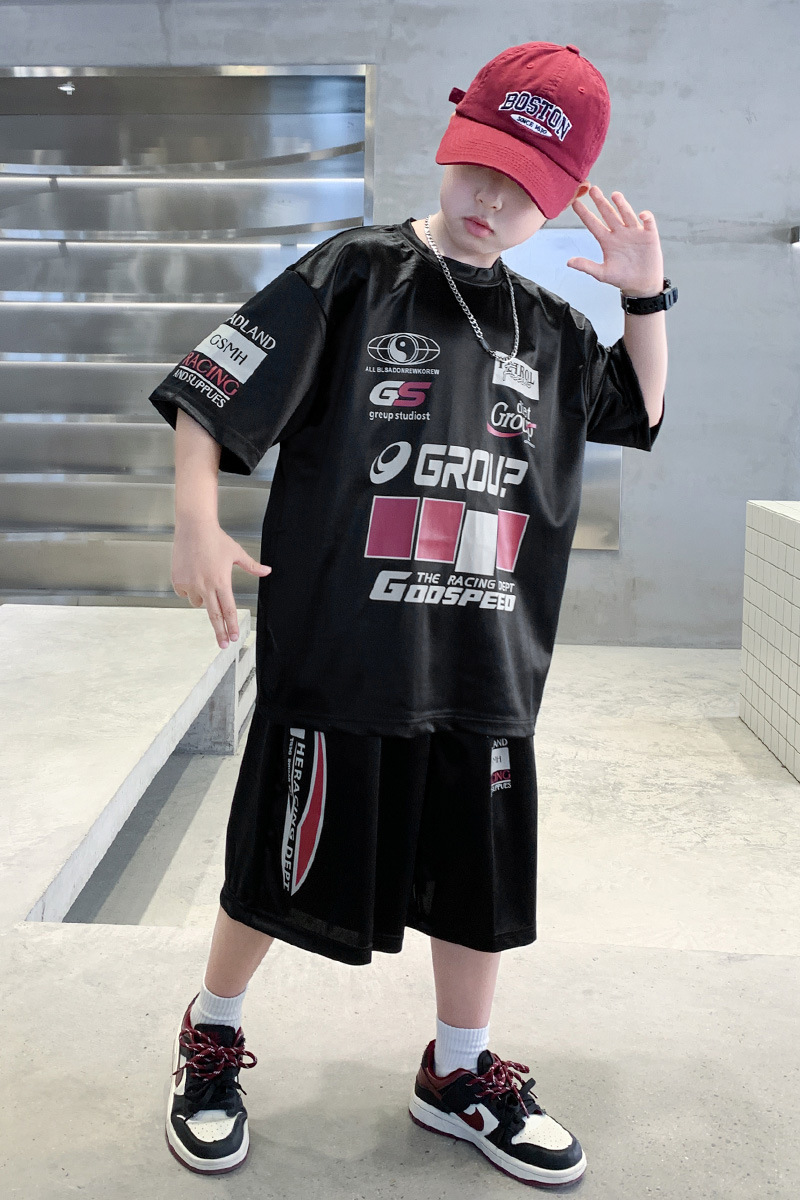 소년 반팔 양복 여름 어린이 유행 운동복 소년 잘 생긴 스트리트 댄스 오토바이 스타일 투피스 농구 유니폼