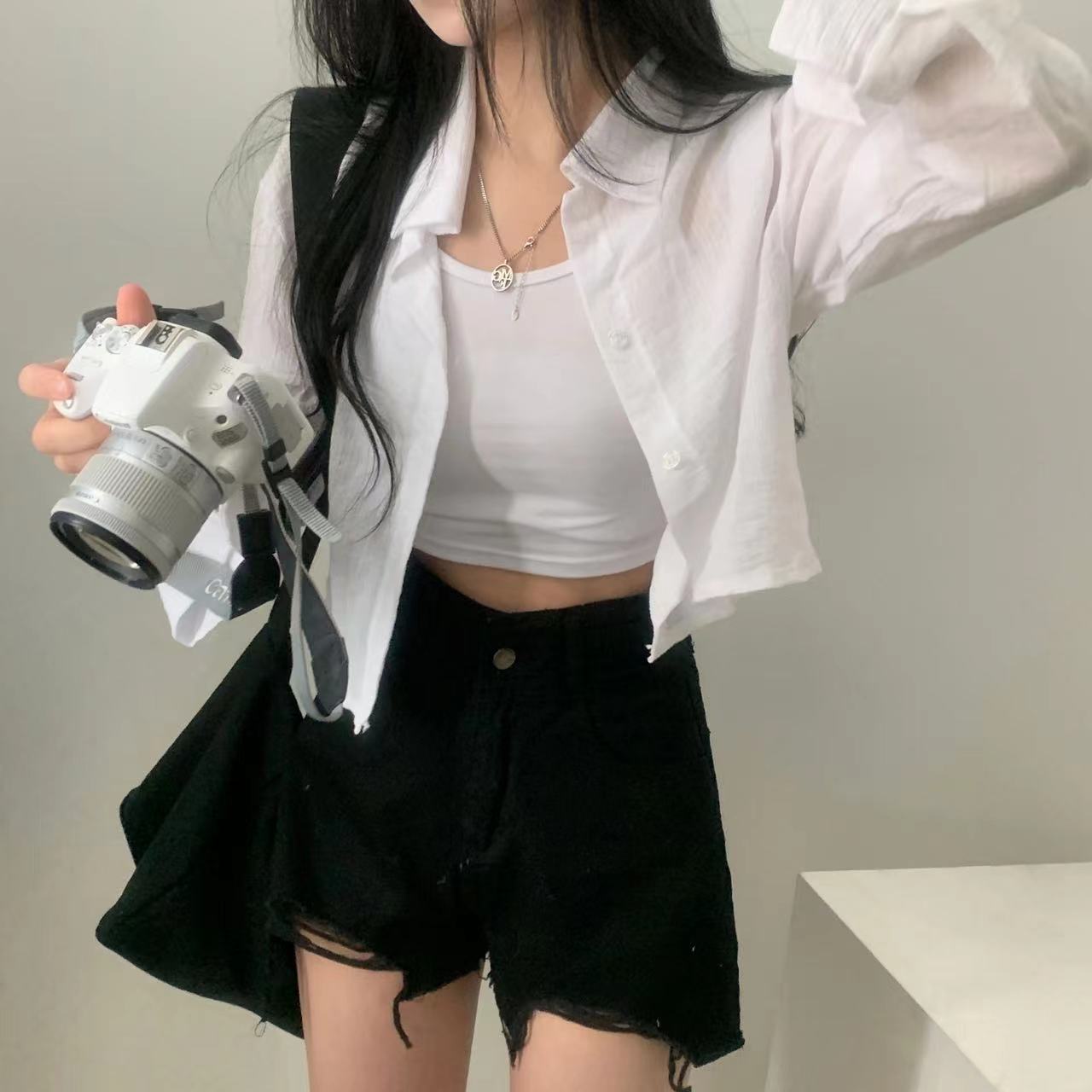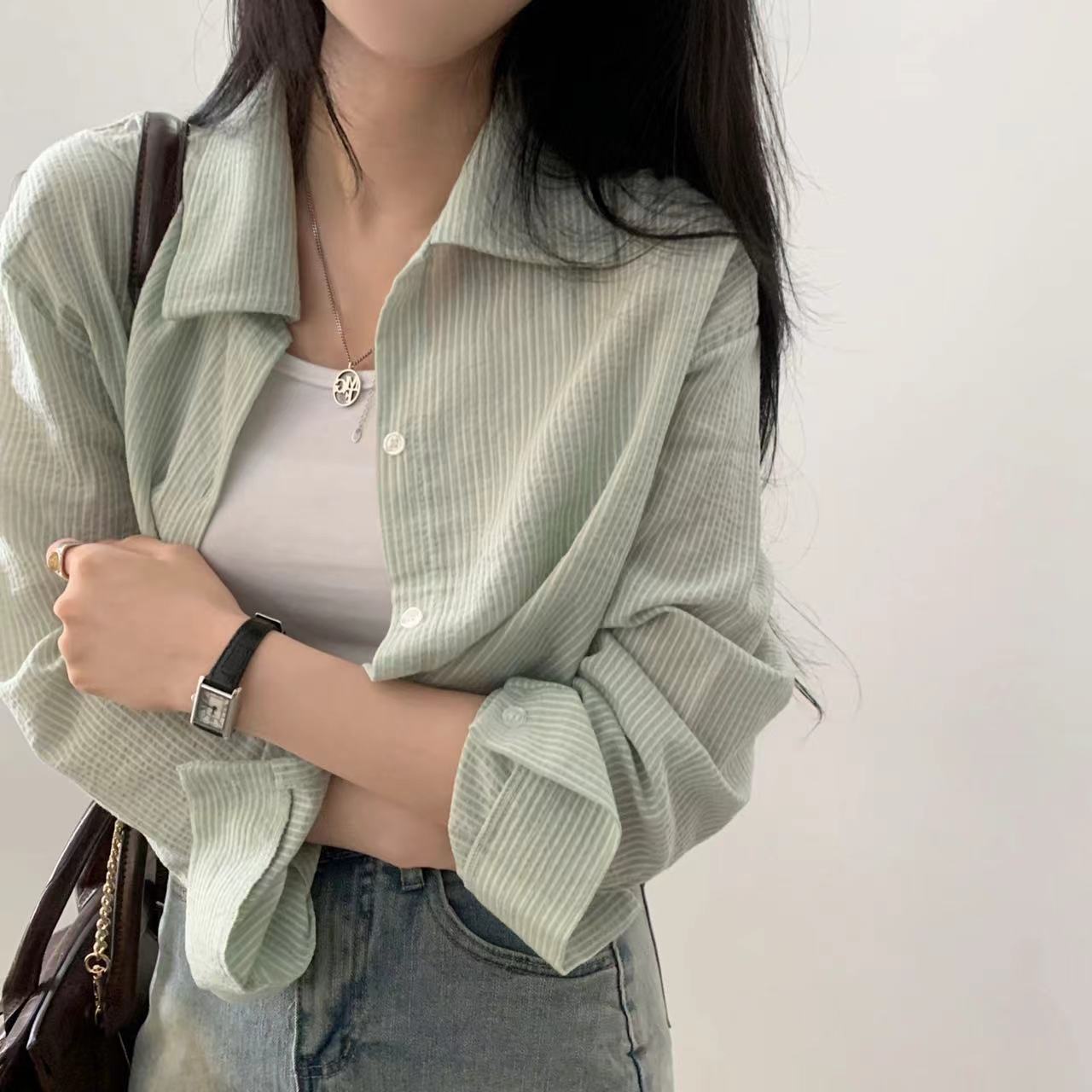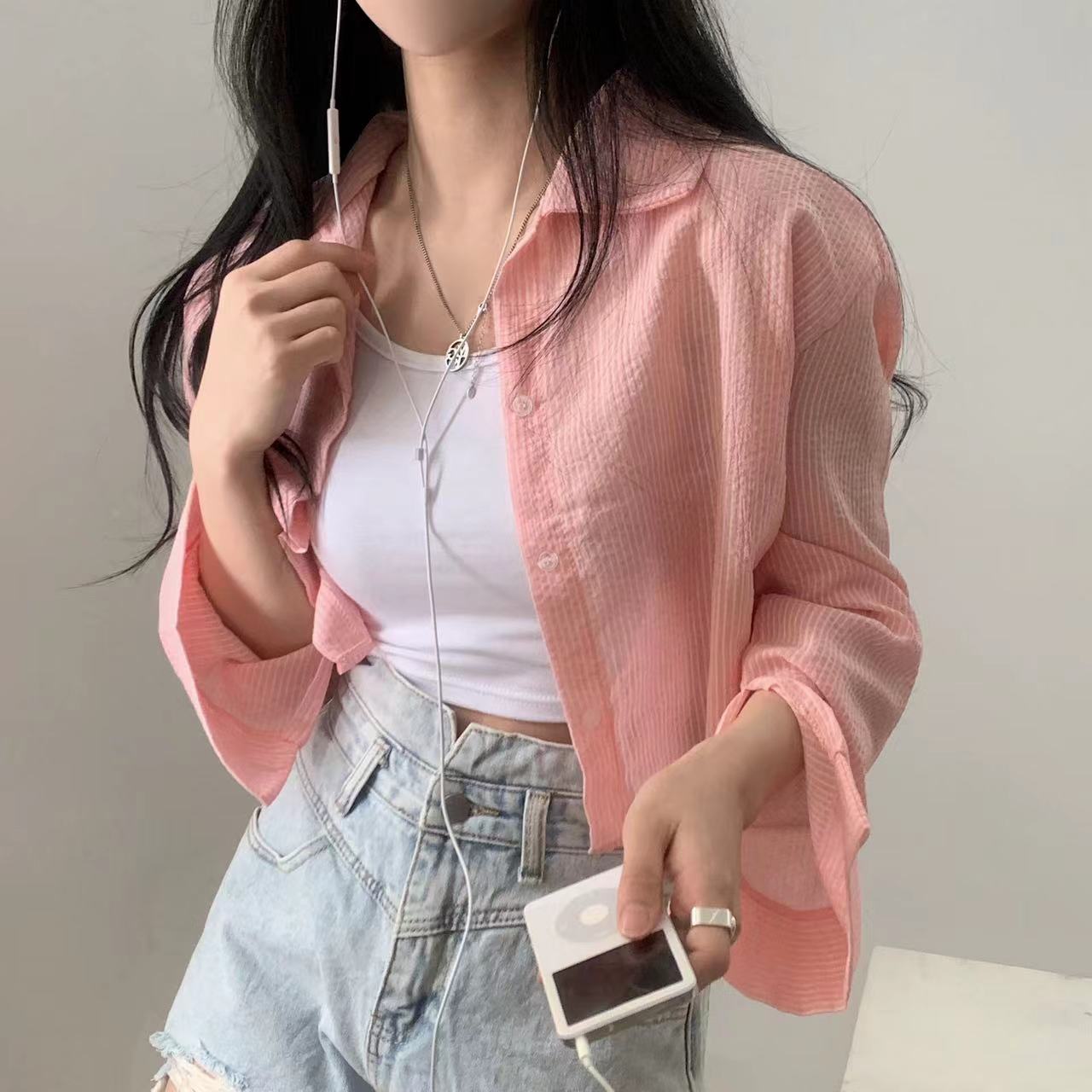 2025 태양 보호 의류 여성의 여름 얇은 파란색 줄무늬 셔츠 재킷 짧은 슬링 외부 카디건스토어 가기