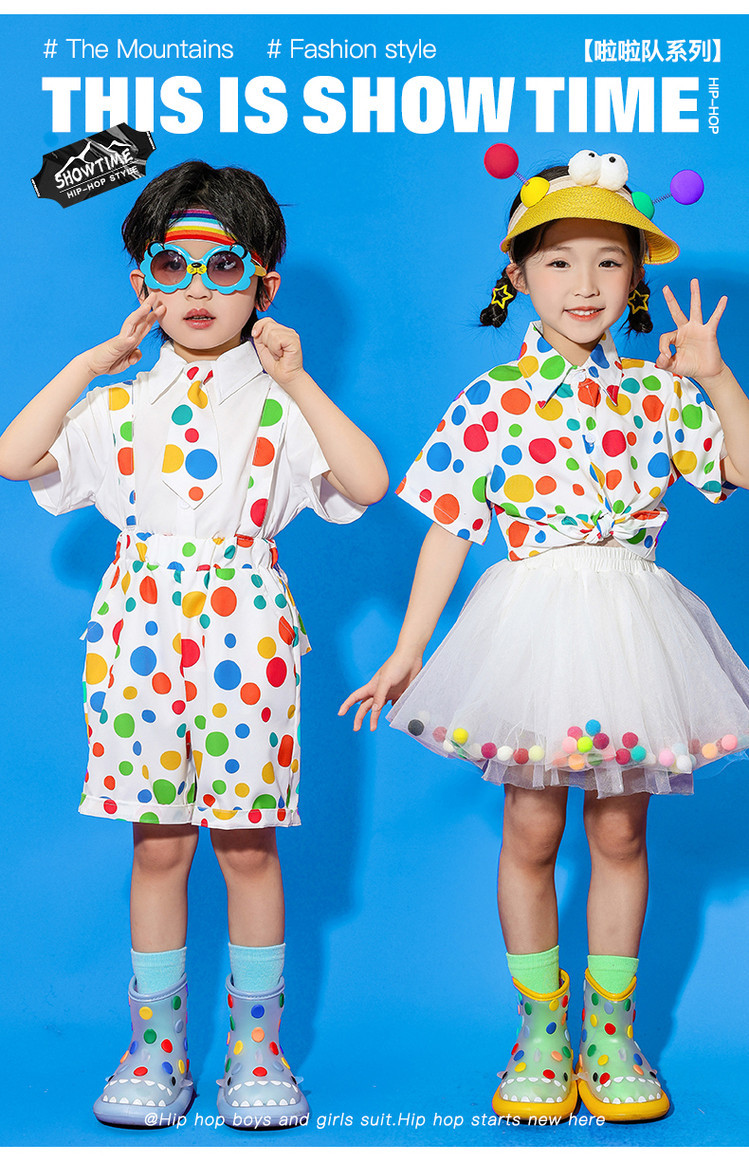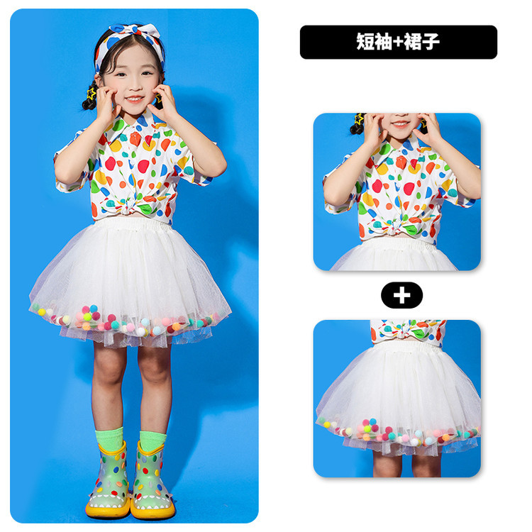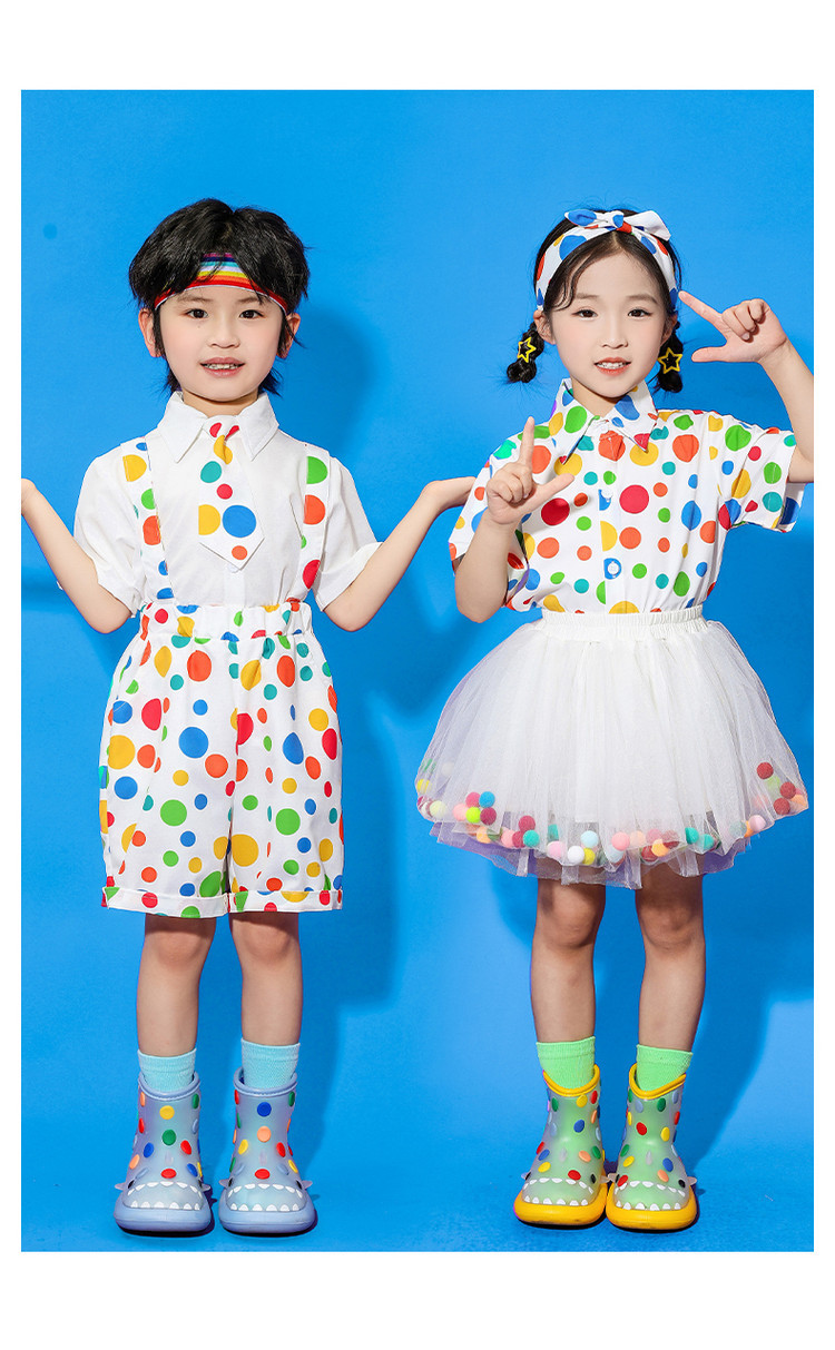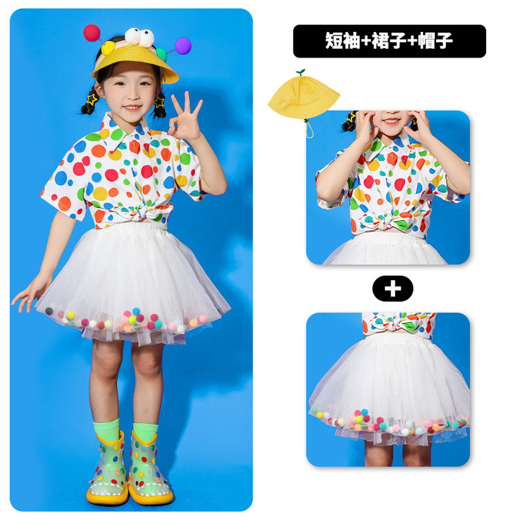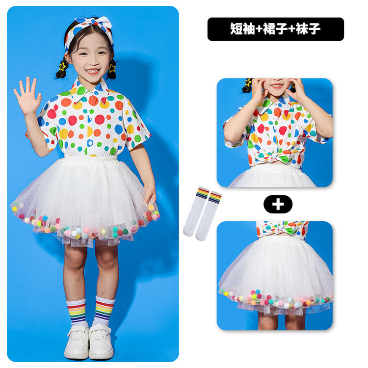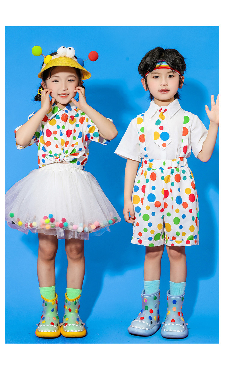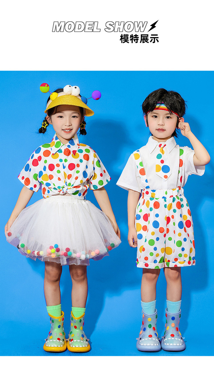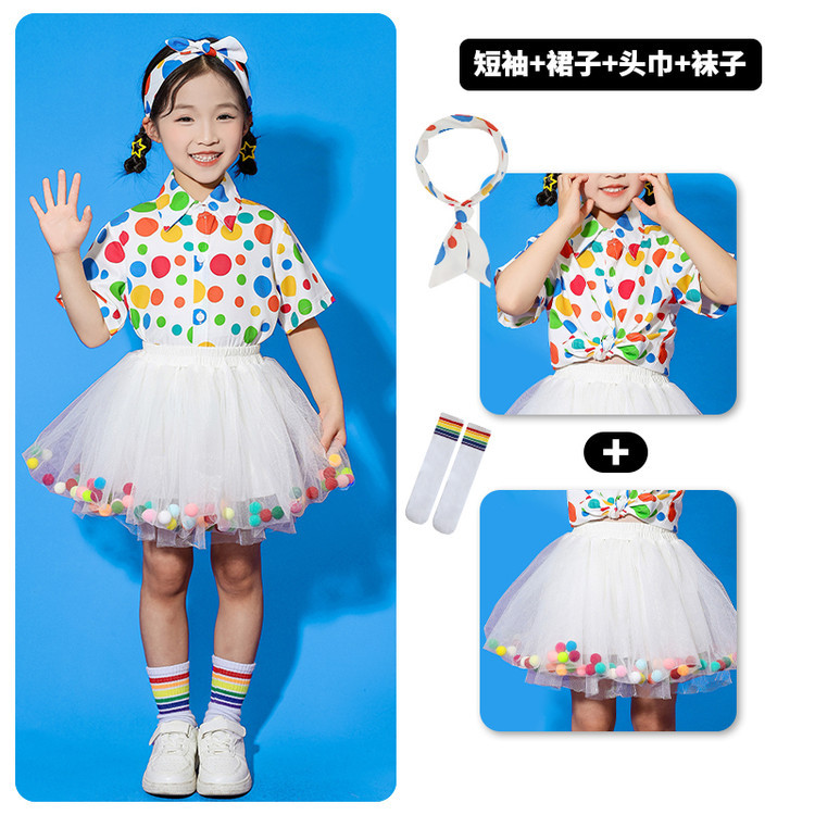 어린이 날 공연 의류 유치원 소년과 소녀 여름 도파민 컬러 웨이브 도트 셔츠 스커트 투피스 세트