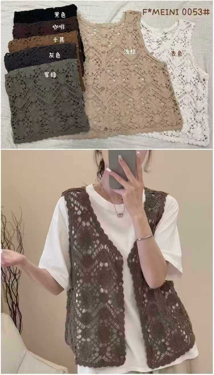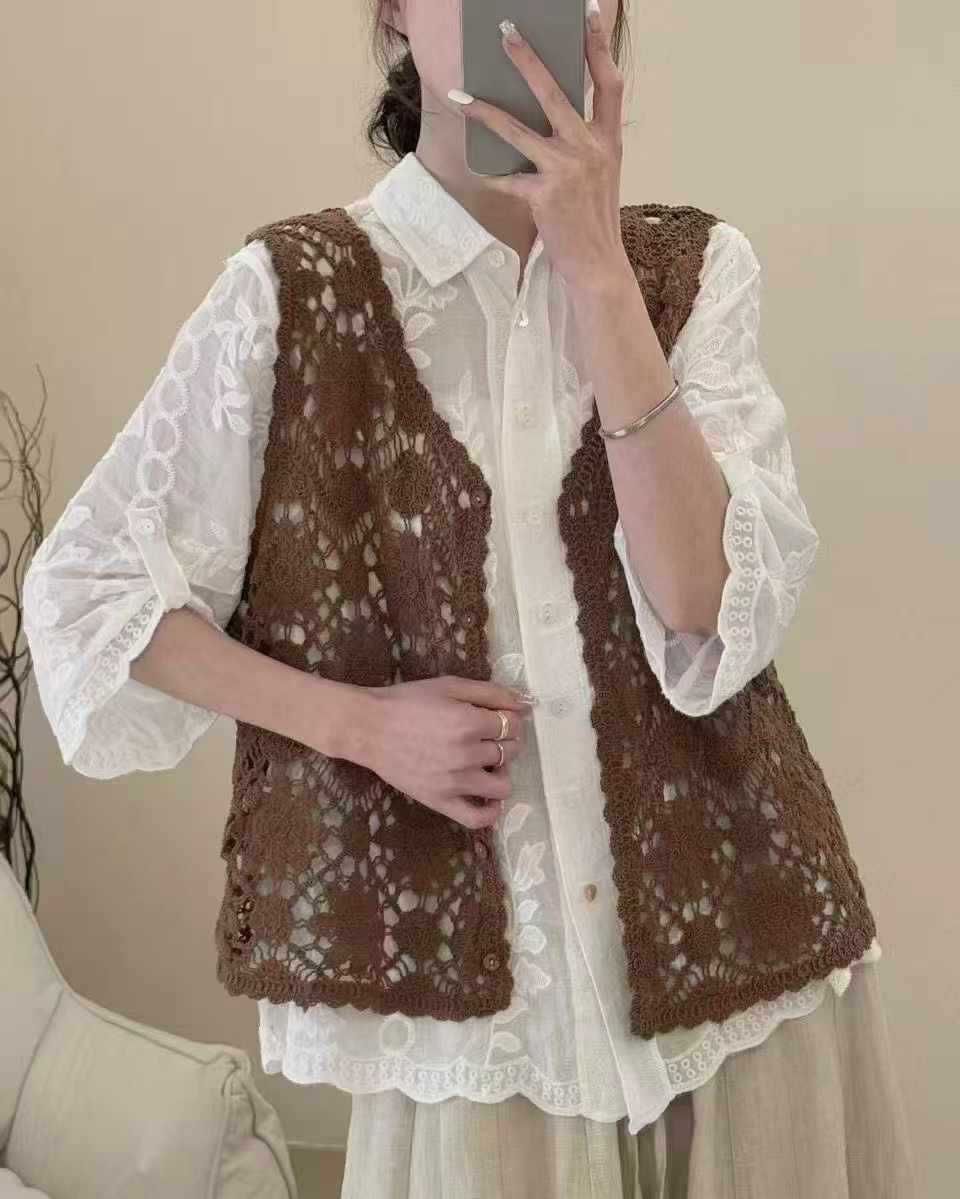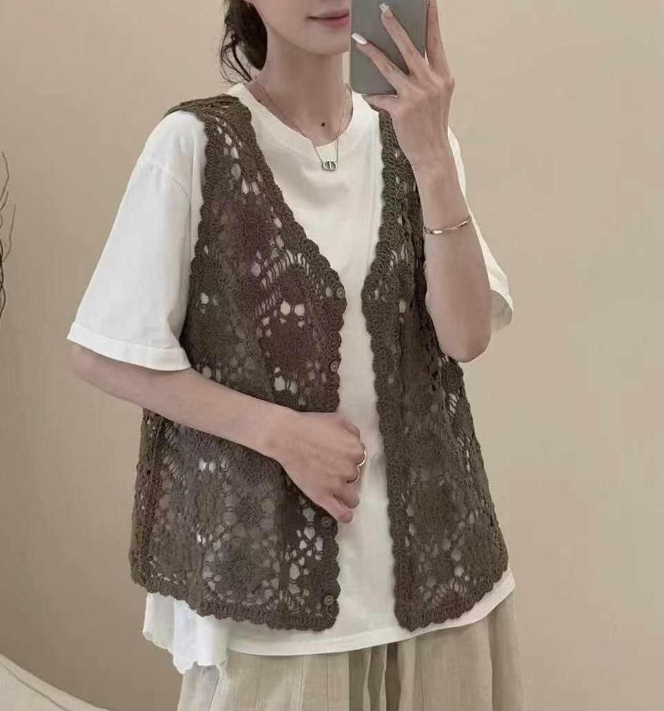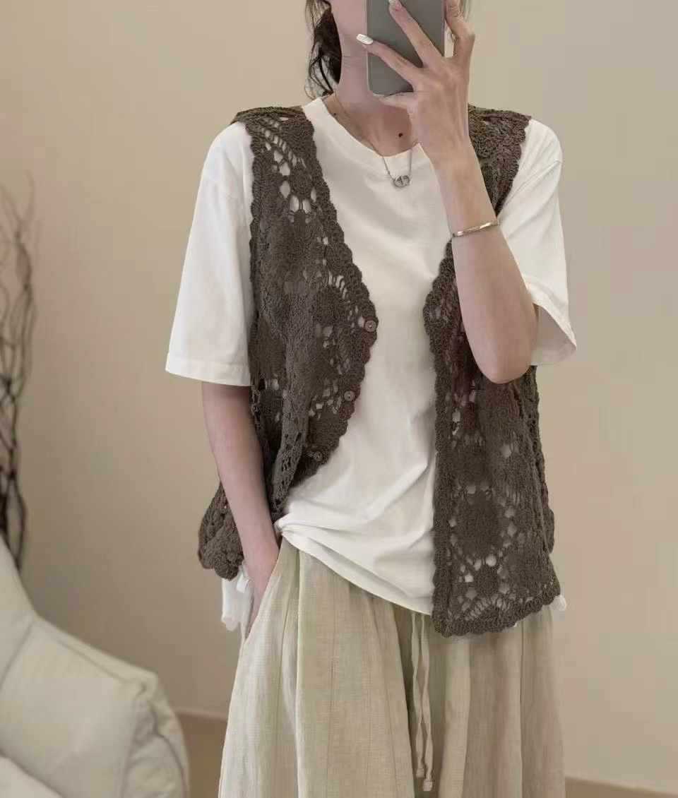 Fmn0053 여름 신작 문학 복고풍 니트 코튼 조끼 여성용 중공 느슨한 싱글 브레스트 아우터 탑