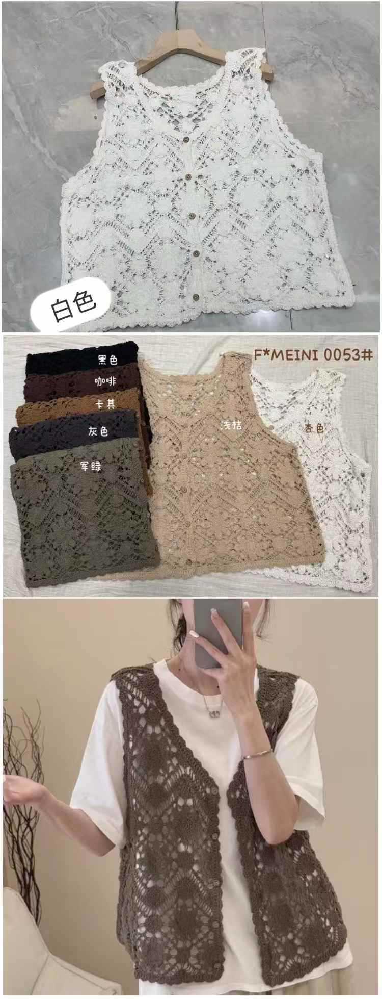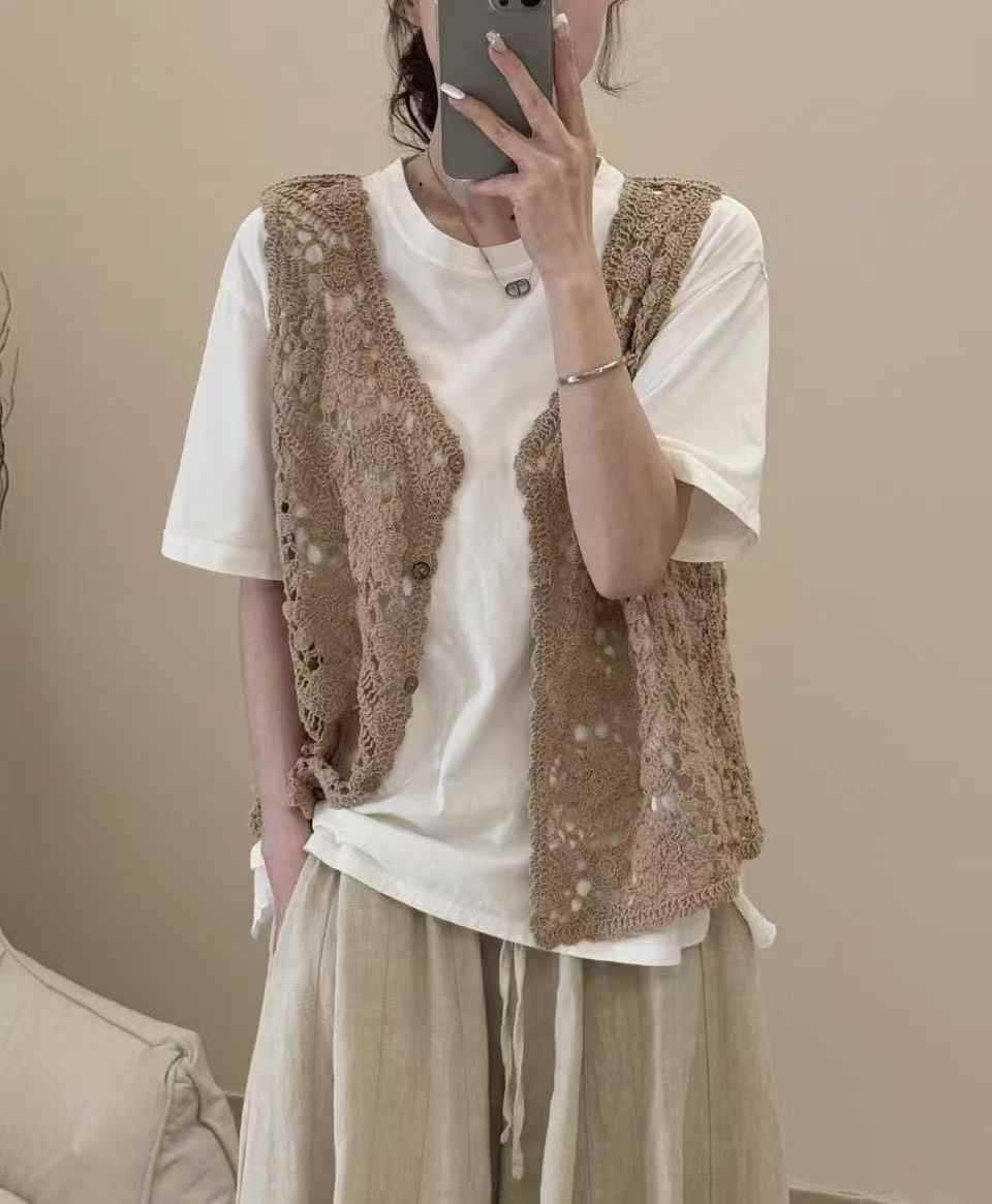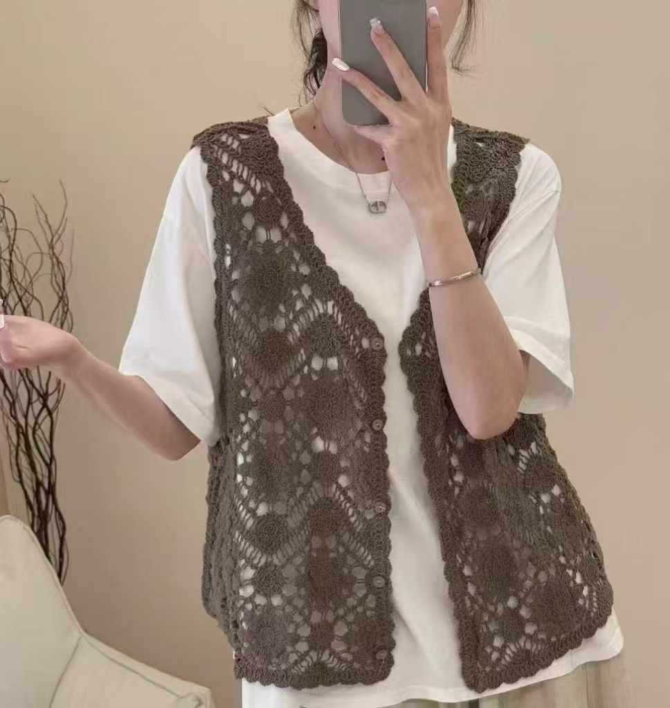 Fmn0053 여름 신작 문학 복고풍 니트 코튼 조끼 여성용 중공 느슨한 싱글 브레스트 아우터 탑