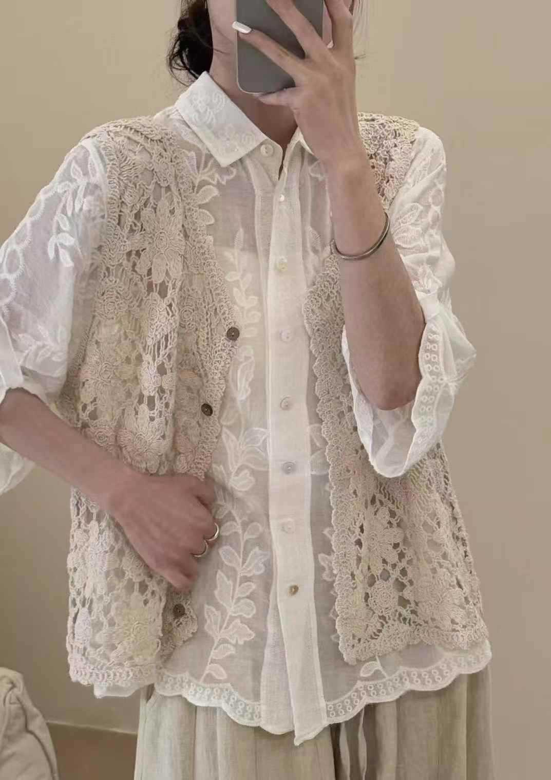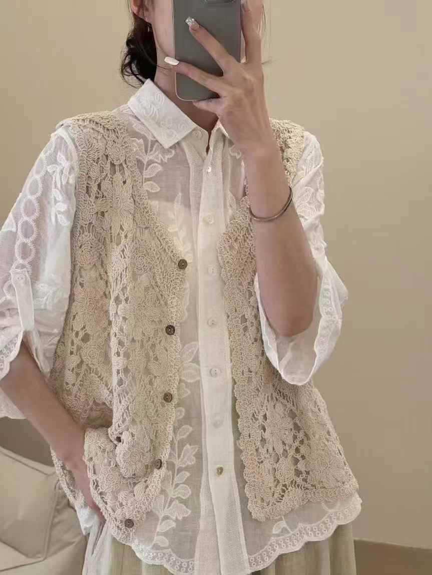 Fmn0053 여름 신작 문학 복고풍 니트 코튼 조끼 여성용 중공 느슨한 싱글 브레스트 아우터 탑스토어 가기
