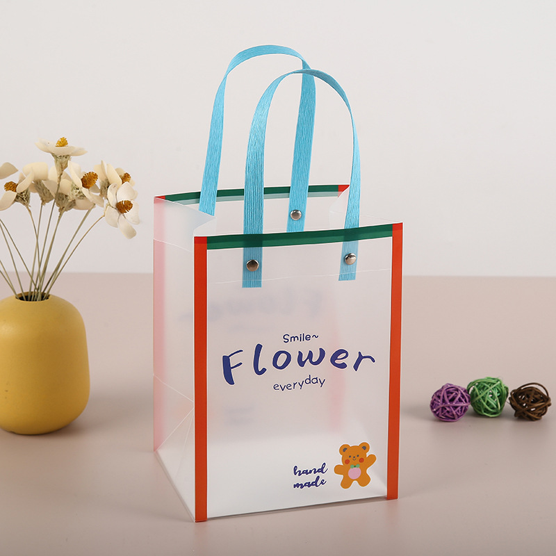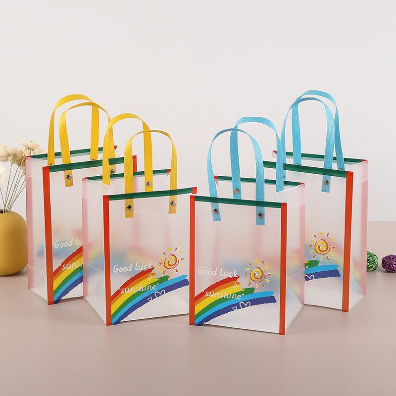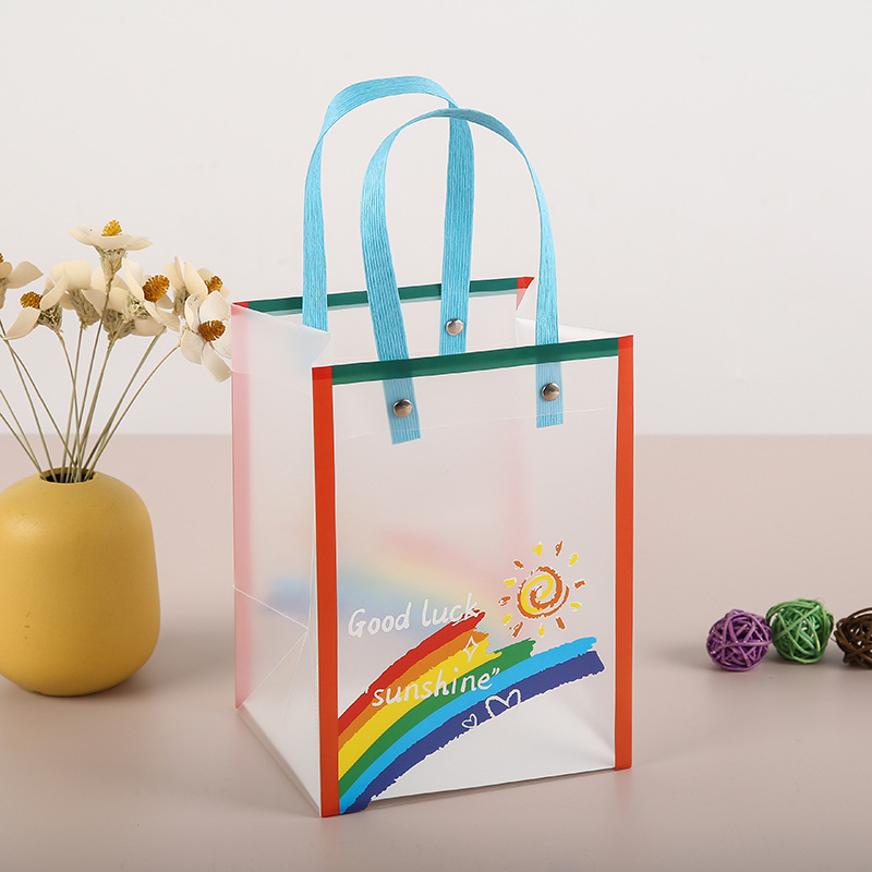 공장 직접 공급 pvc 투명 핸드백 pp 플라스틱 젖빛 선물 가방 맞춤 무지개 핸드백 인쇄 로고