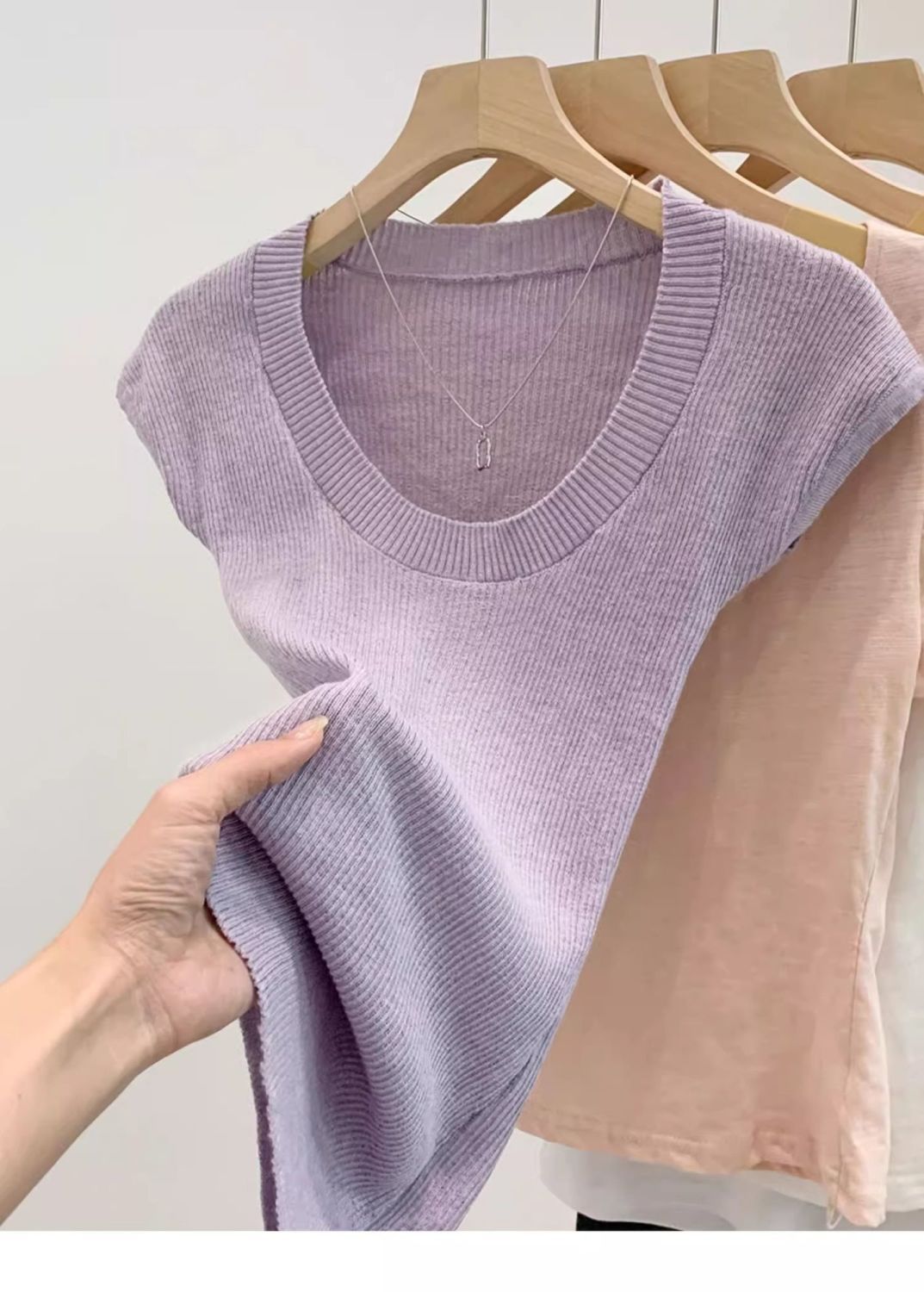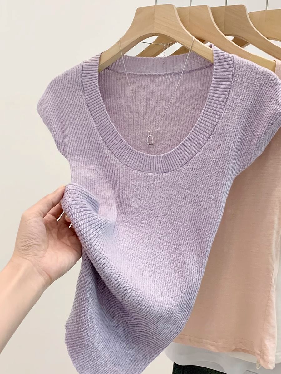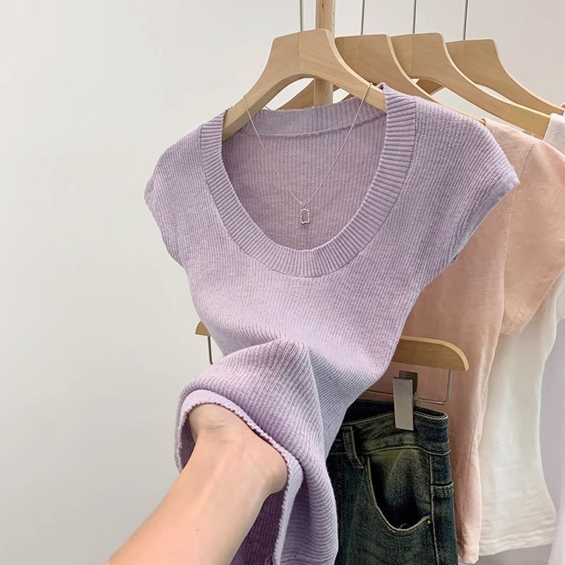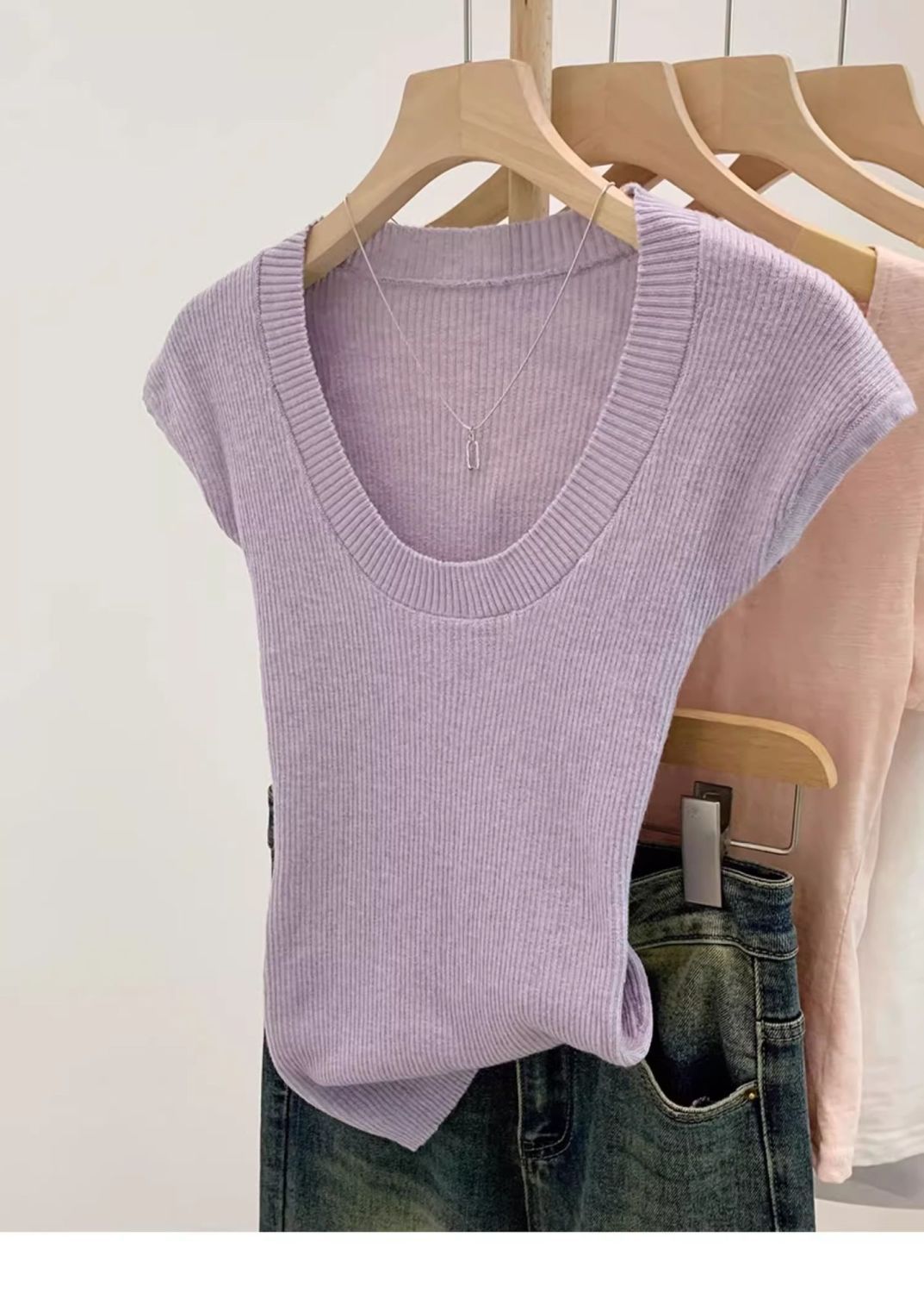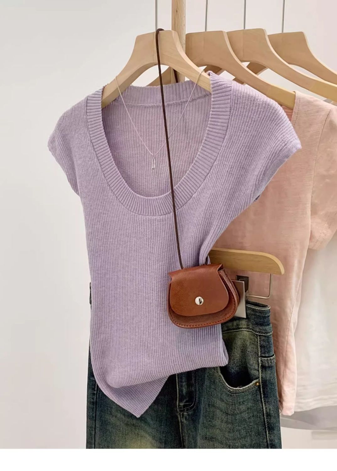 순수한 소원 타이트 허리 슬리밍 어깨 니트 반팔 티셔츠 여성용 여름 새로운 보라색 낮은 목 플라잉 슬리브 쇼트 탑스토어 가기