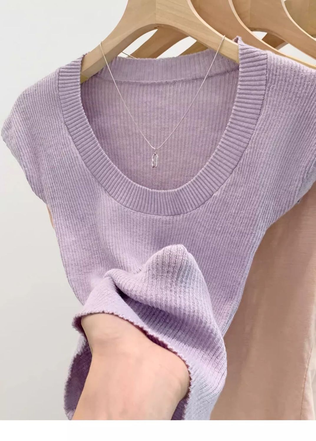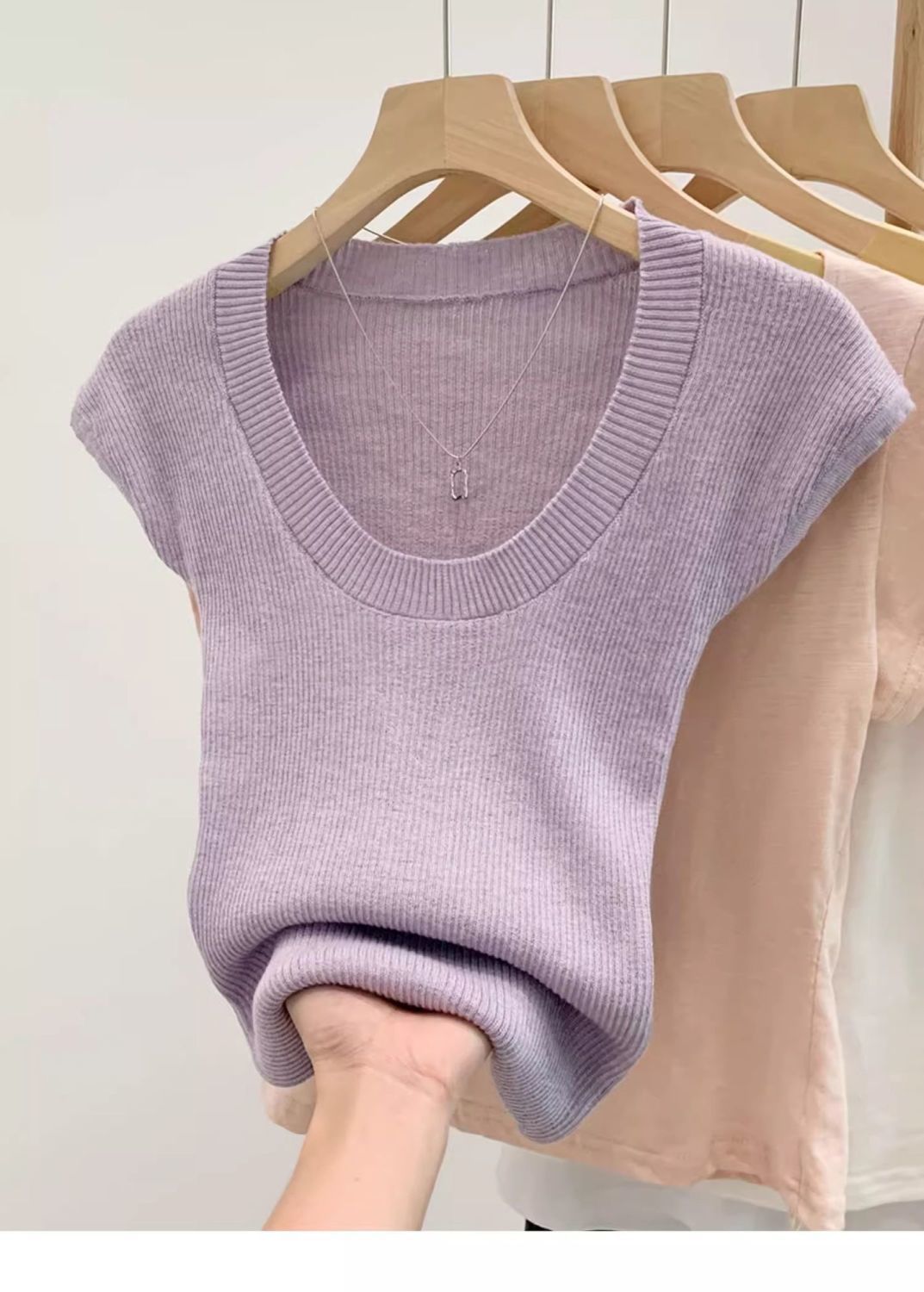 순수한 소원 타이트 허리 슬리밍 어깨 니트 반팔 티셔츠 여성용 여름 새로운 보라색 낮은 목 플라잉 슬리브 쇼트 탑