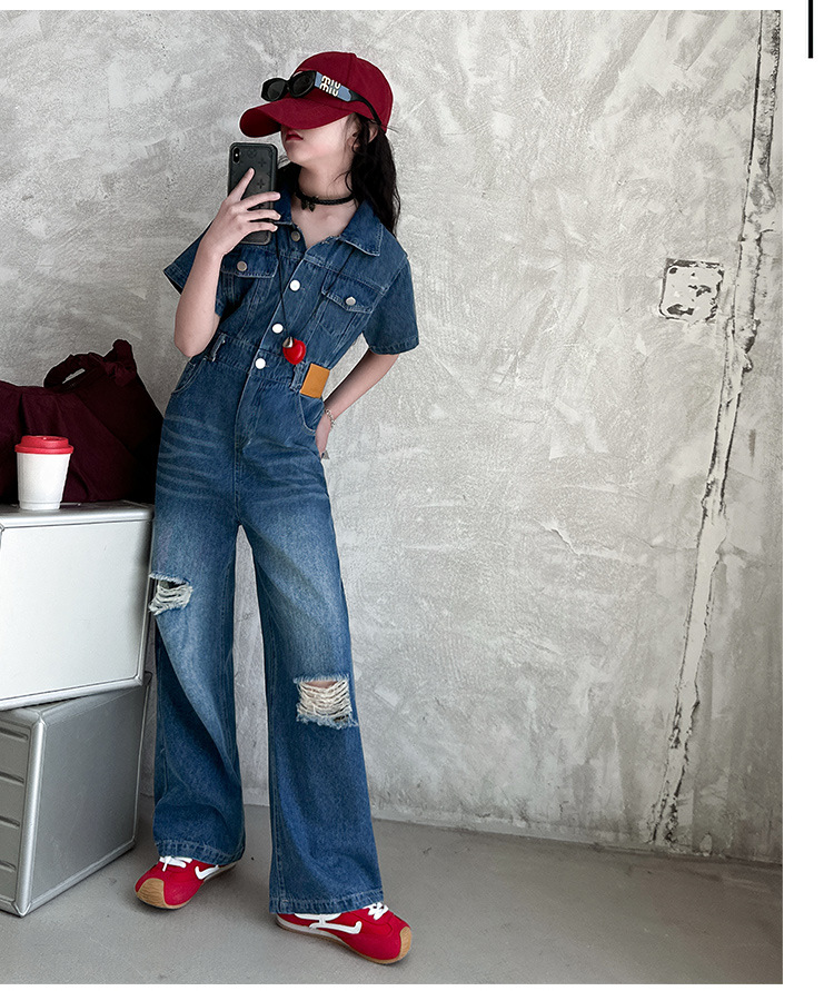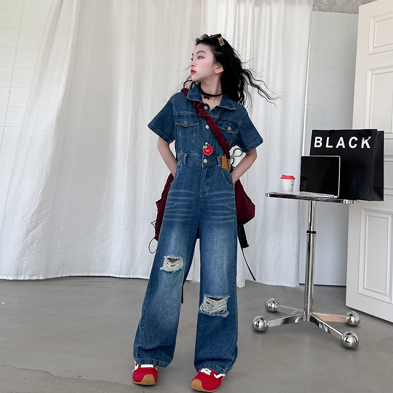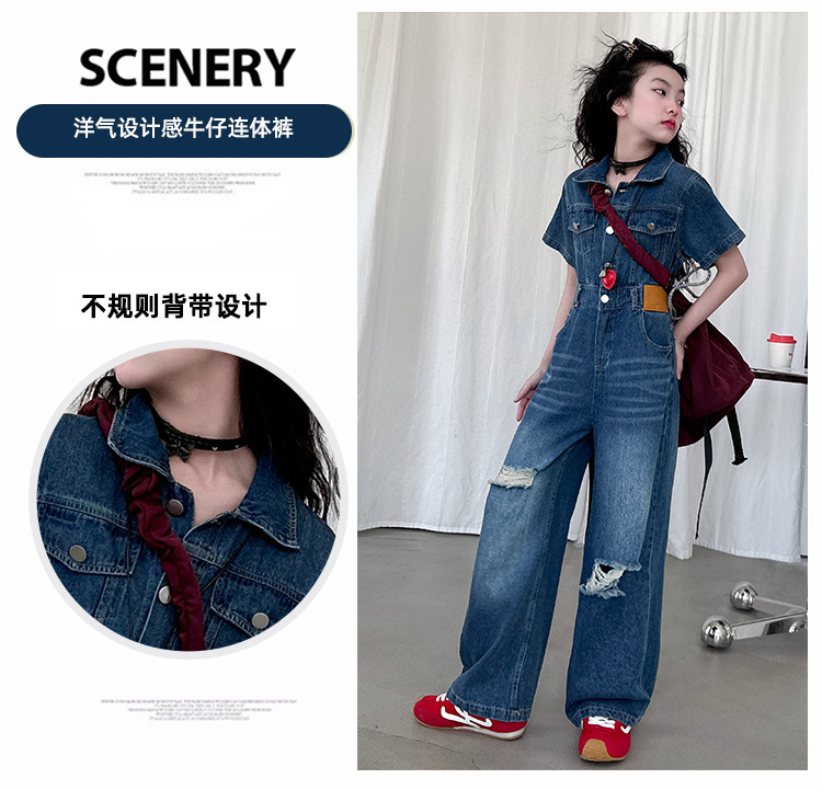 소녀 청바지 여름 2025 새로운 어린이 세련된 패션 와이드 레그 점프 수트 큰 키즈 소녀 바지 여름 착용