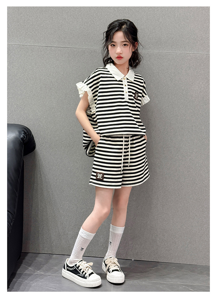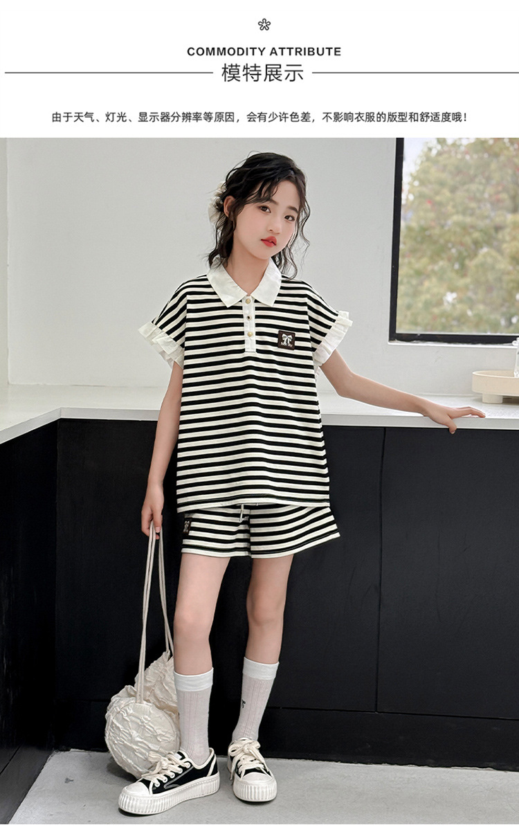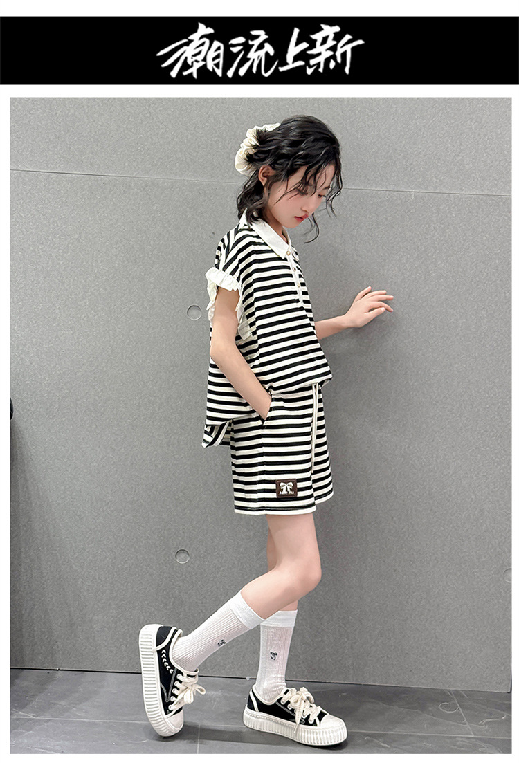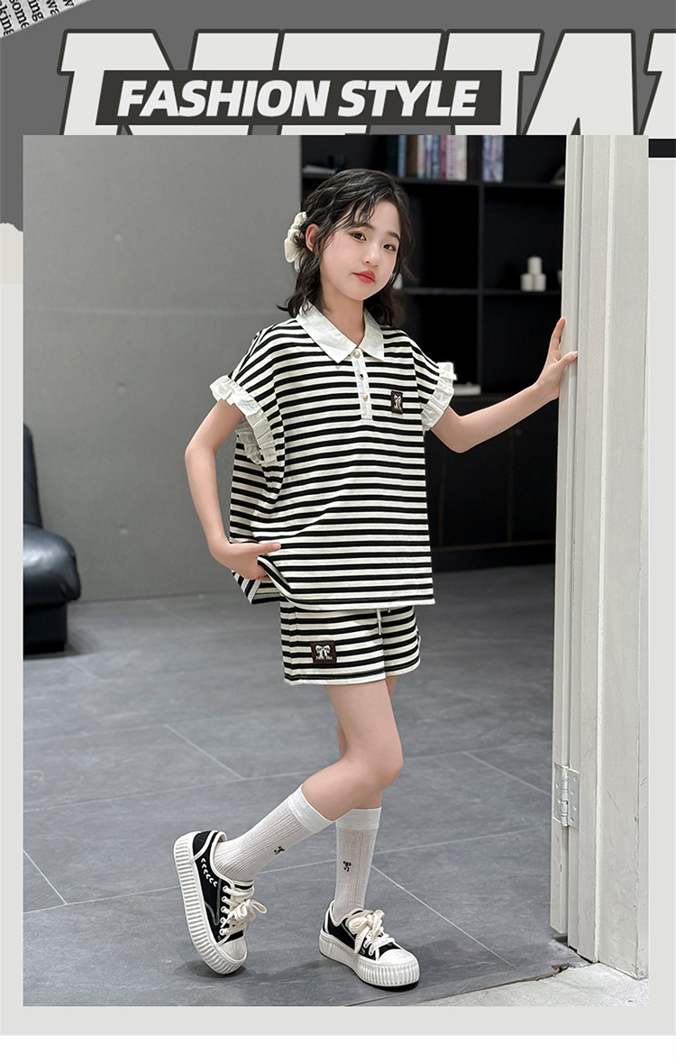 여자 여름 반팔 반바지 여름 새 스타일 소녀 달콤한 어린이 티셔츠 유행 아동복 새로운 수평 투피스 세트스토어 가기