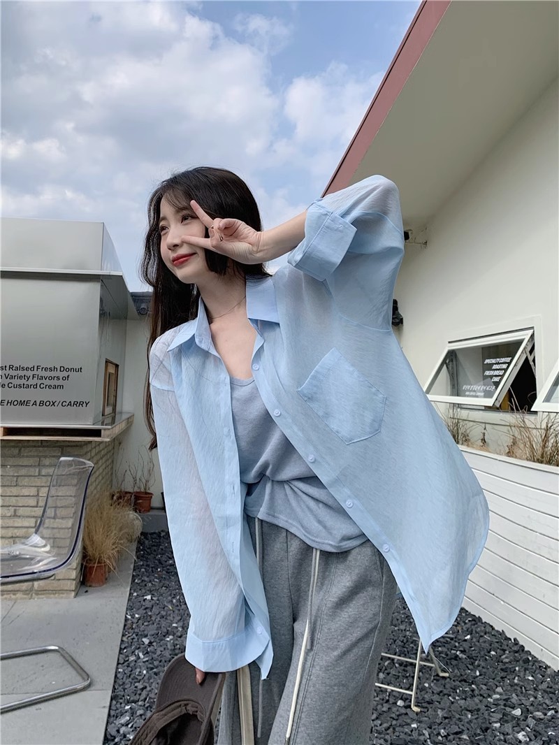 선스크린 탑 여성의 여름 외부 카디건 느슨한 얇은 재킷 여성 셔츠 디자인 틈새 화이트 셔츠