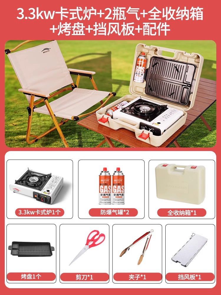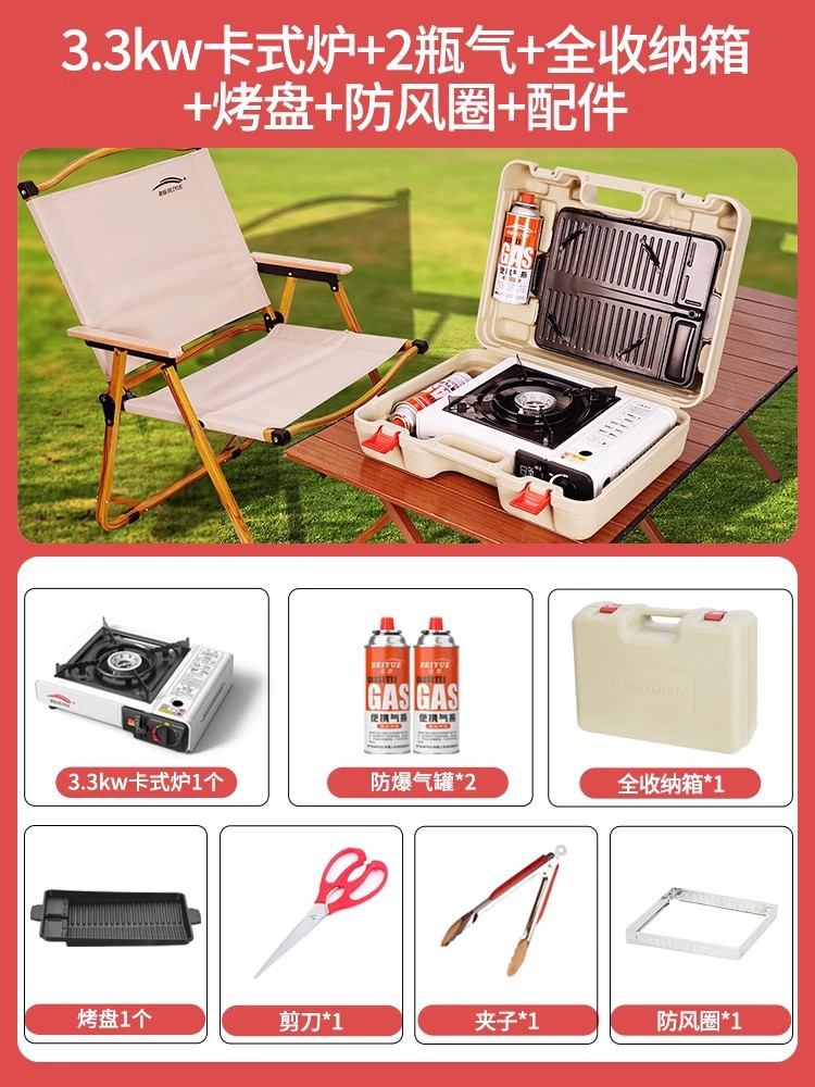 • 업그레이드된 카세트 스토브 + 가스 2병 + 전체 보관함 + 베이킹 팬 + 방풍 링 + 액세서리