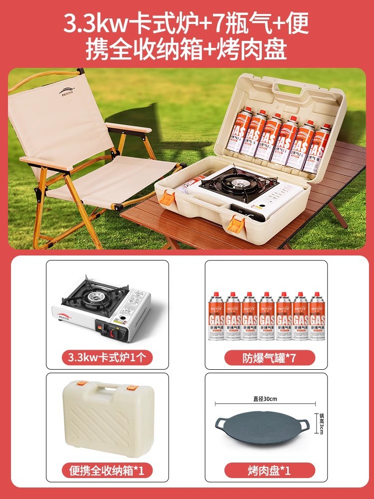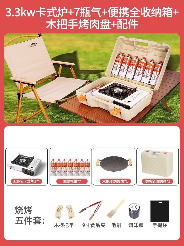 • 업그레이드된 카세트 스토브 + 가스 7병 + 휴대용 전체 보관함 + 나무 손잡이 바베큐 플레이트 + 액세서리