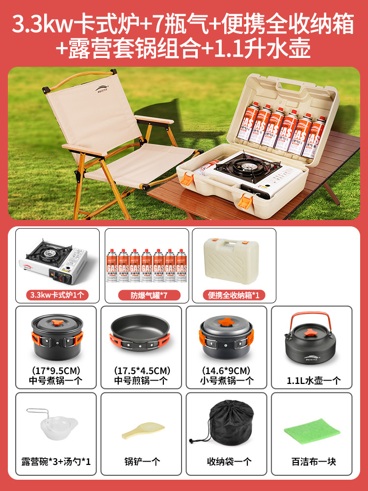 • 업그레이드된 카세트 스토브 + 가스 7병 + 휴대용 풀 수납함 + 캠핑 냄비 세트 + 1.1리터 주전자