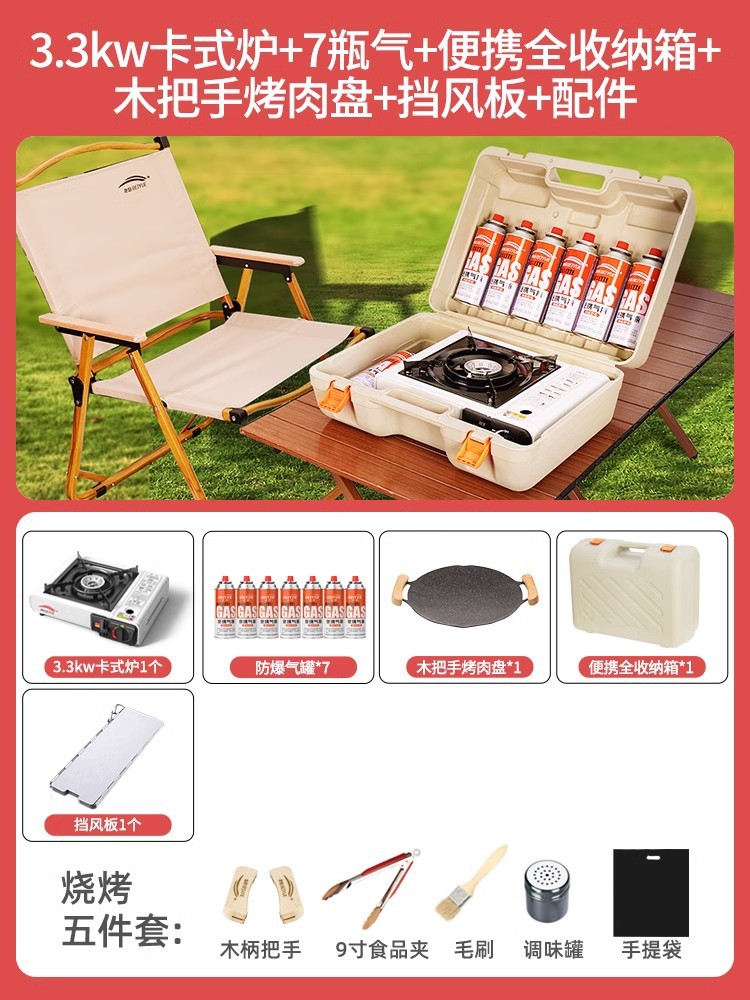 • 업그레이드된 카세트 스토브 + 가스 7병 + 휴대용 전체 보관함 + 나무 손잡이 바베큐 플레이트 + 앞유리 + 액세서리