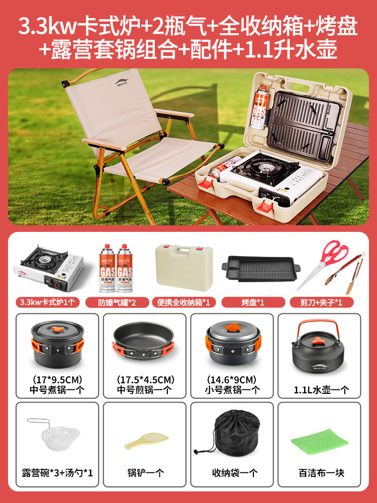 • 업그레이드된 카세트 스토브 + 가스 2병 + 풀 수납함 + 베이킹 팬 + 캠핑 냄비 세트 + 액세서리 + 1.1리터 주전자