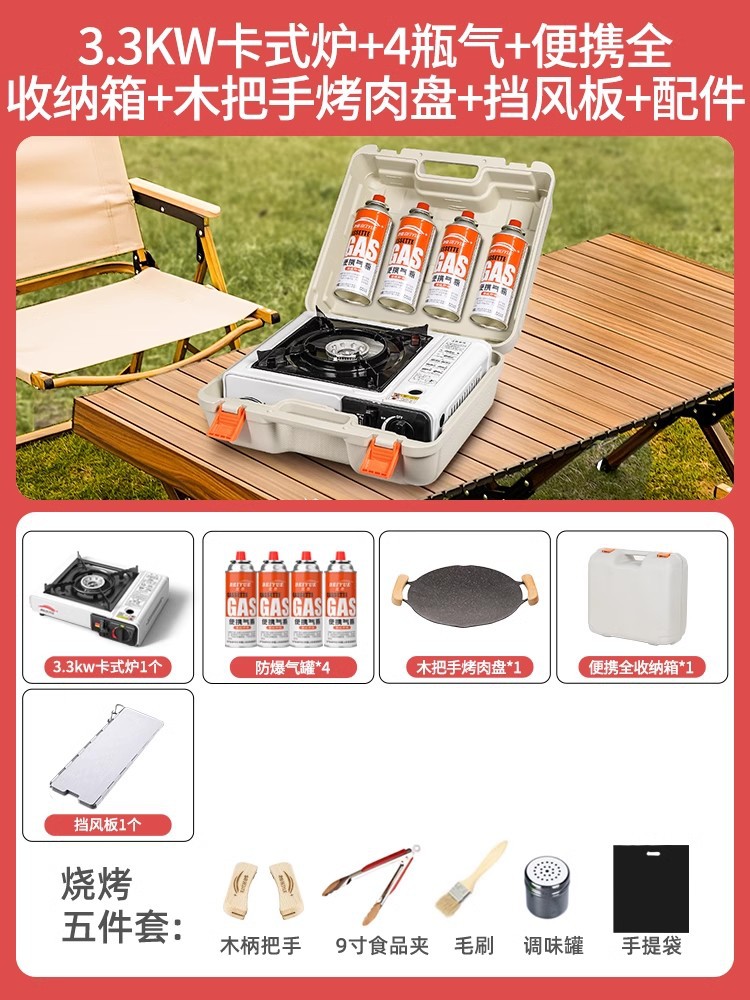 • 업그레이드된 카세트 스토브 + 가스 4병 + 휴대용 전체 보관함 + 나무 손잡이 바베큐 플레이트 + 앞유리 + 액세서리