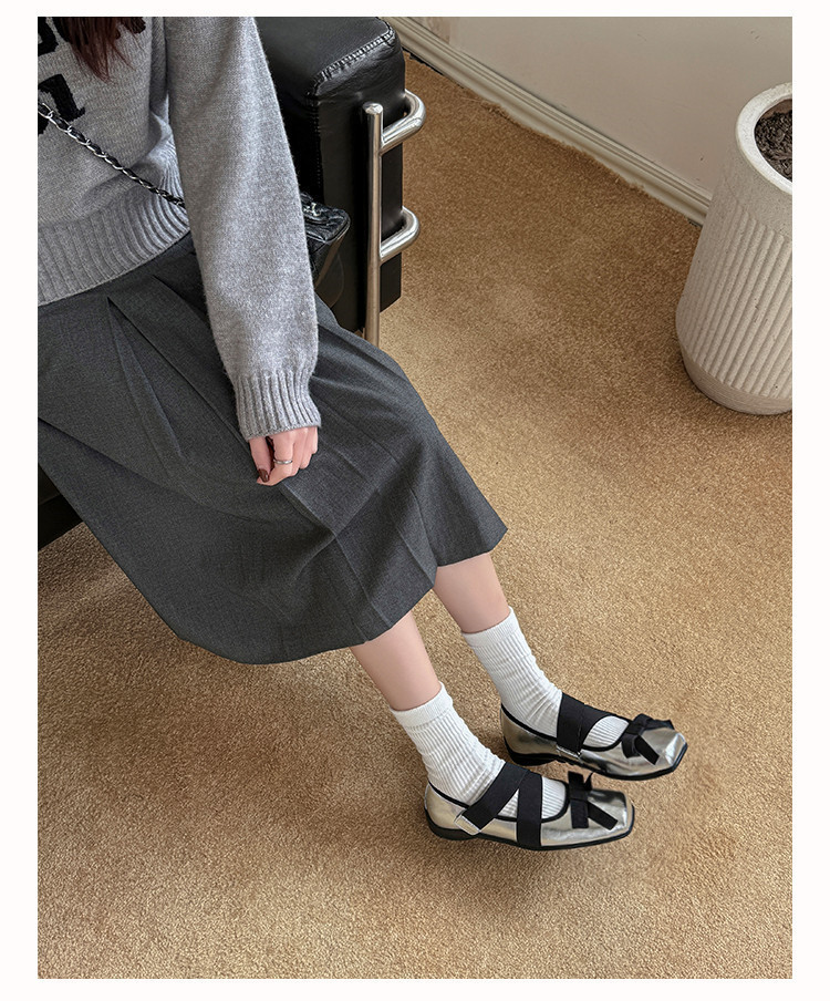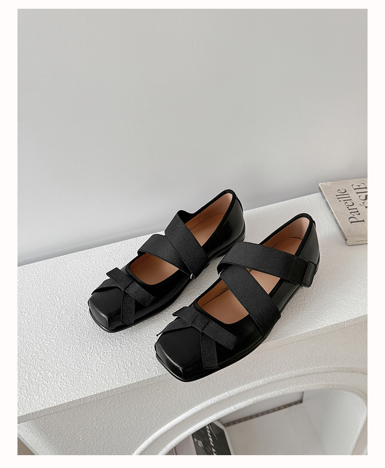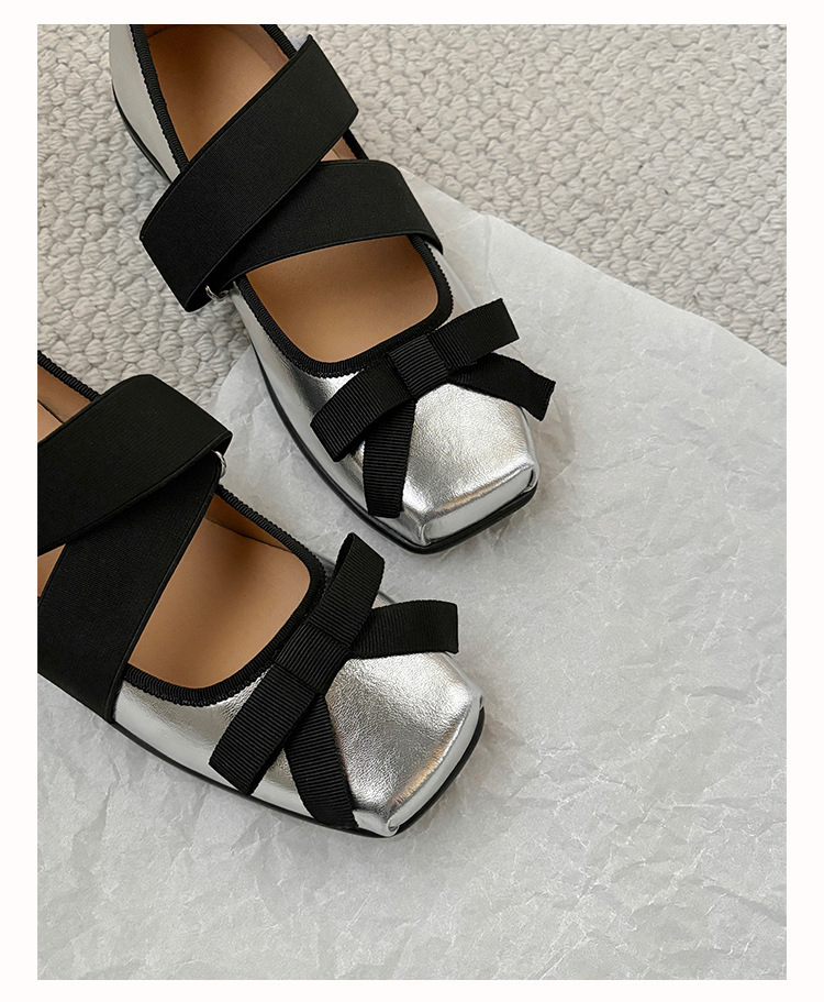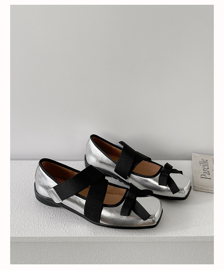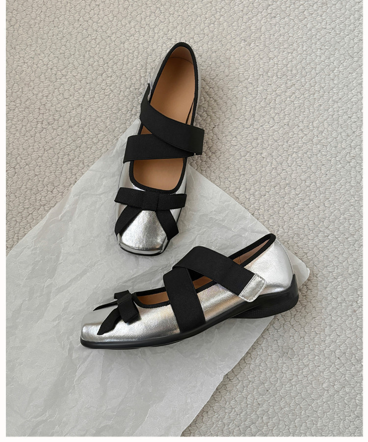 양가죽 버전 ~ 스포츠 스타일 복고풍 실버 스퀘어 헤드 발레 신발 나비 넥타이 플랫 바닥 메리 제인 신발 여성