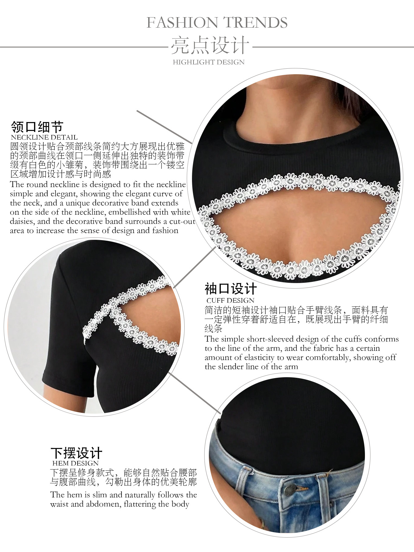 유럽과 미국의 국경 아마존 2025 여름 새로운 단색 장식 데칼 크루 넥 반팔 패션 티셔츠 여성을위한 탑
