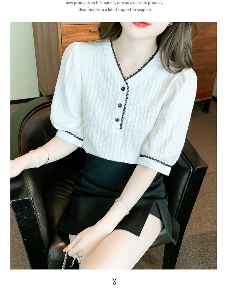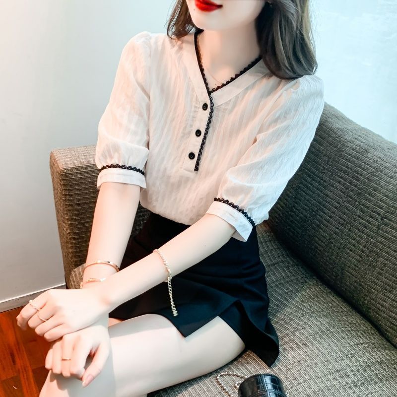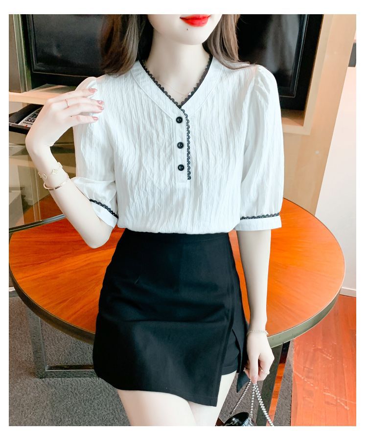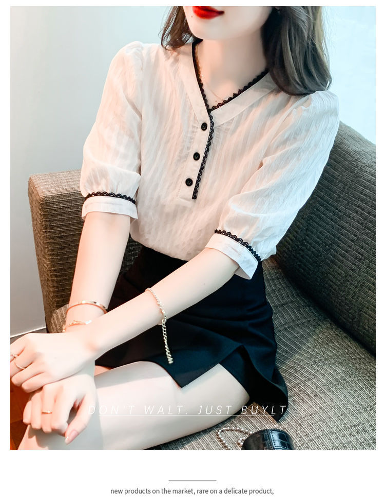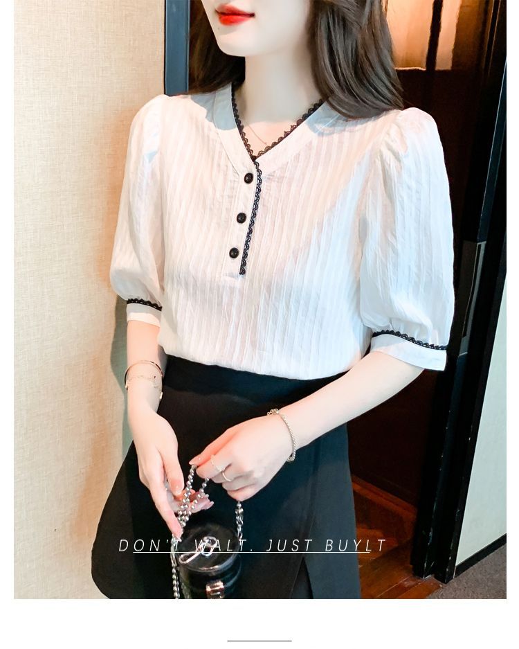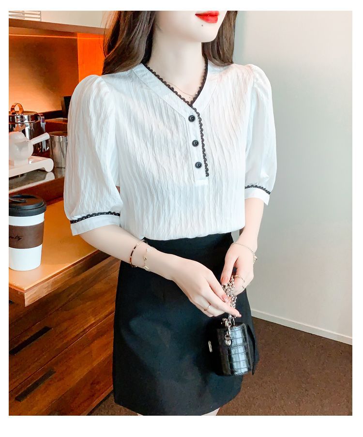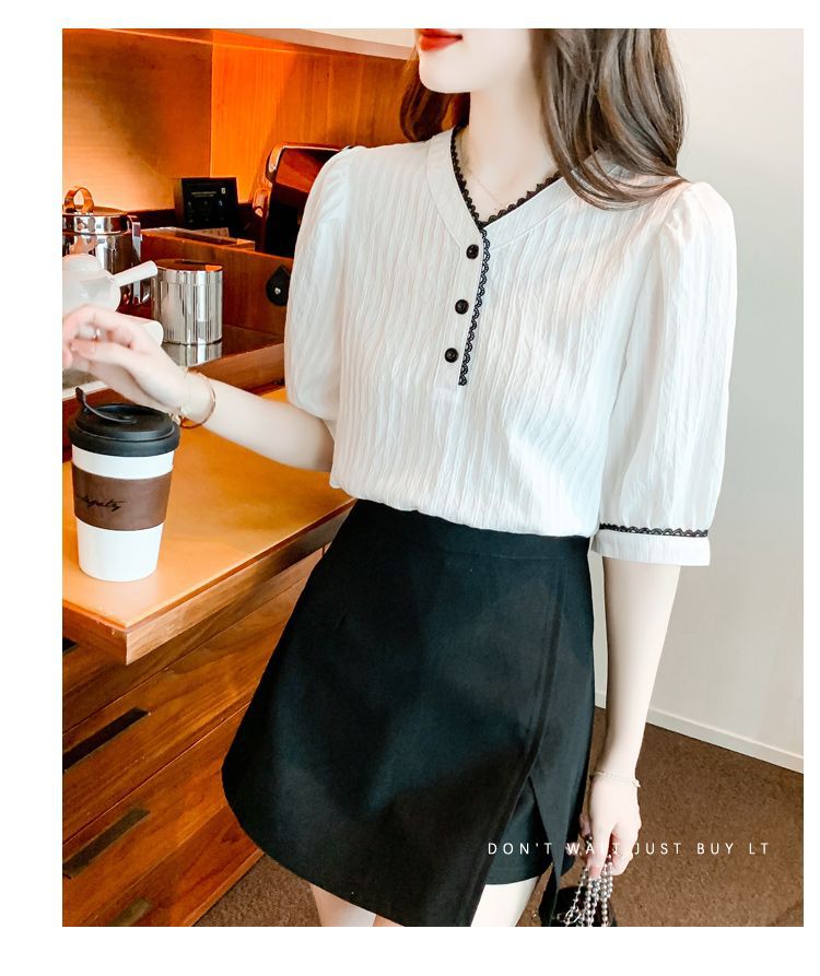 2025 여름 새로운 대비 컬러 퍼프 슬리브 유행 화이트 짧은 소매 쉬폰 셔츠 여성의 얇은 V 넥 탑 풀오버스토어 가기