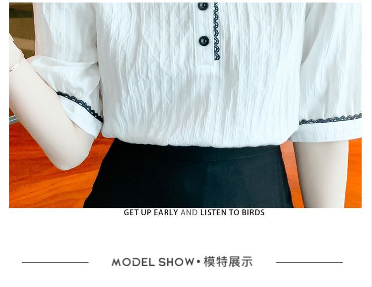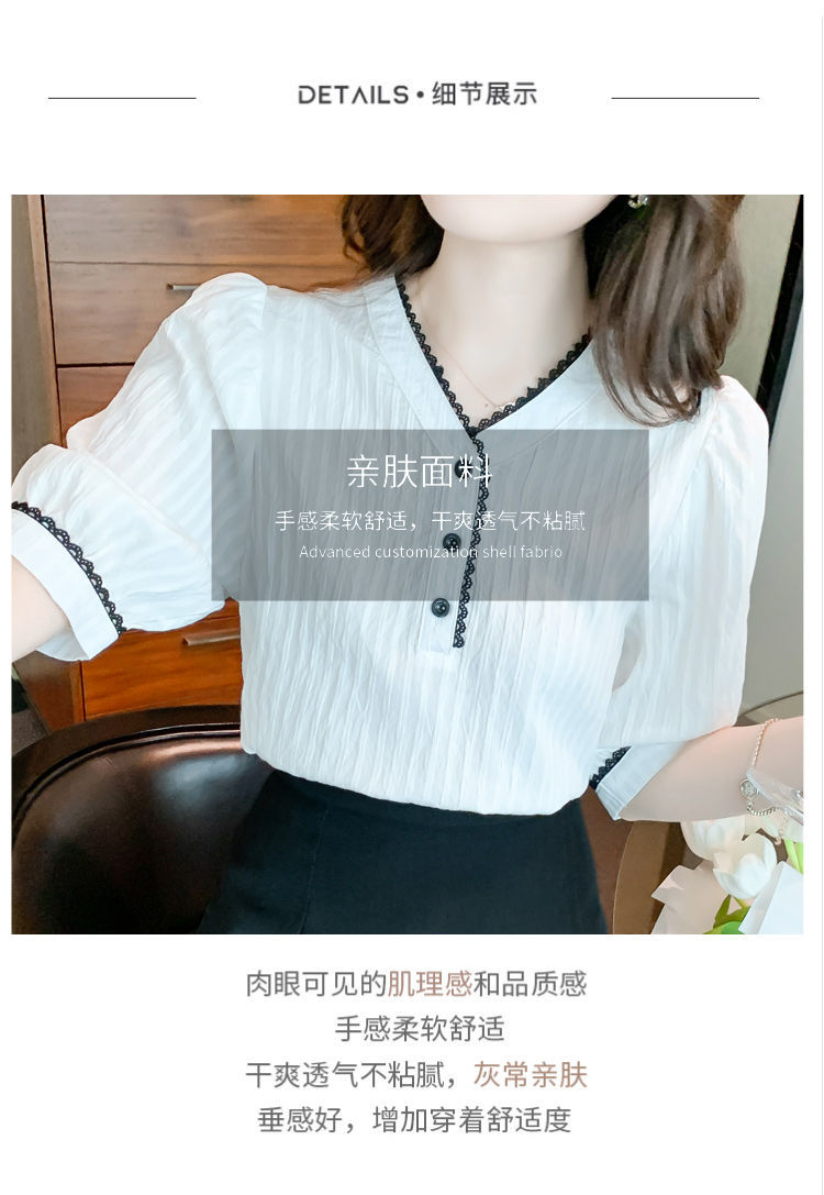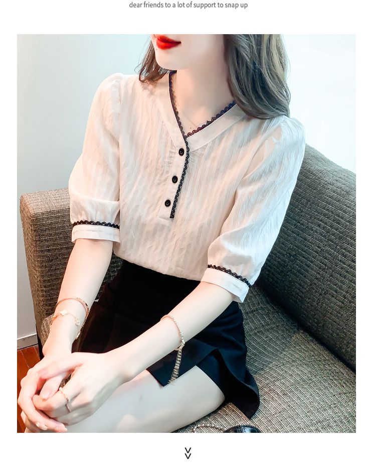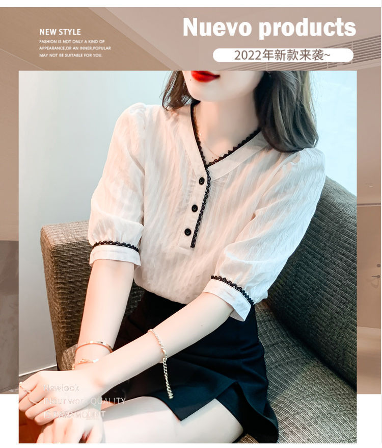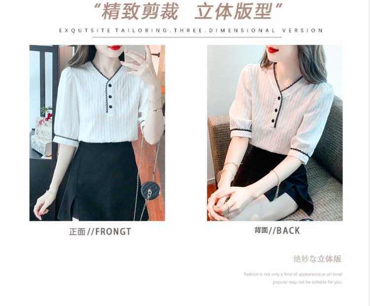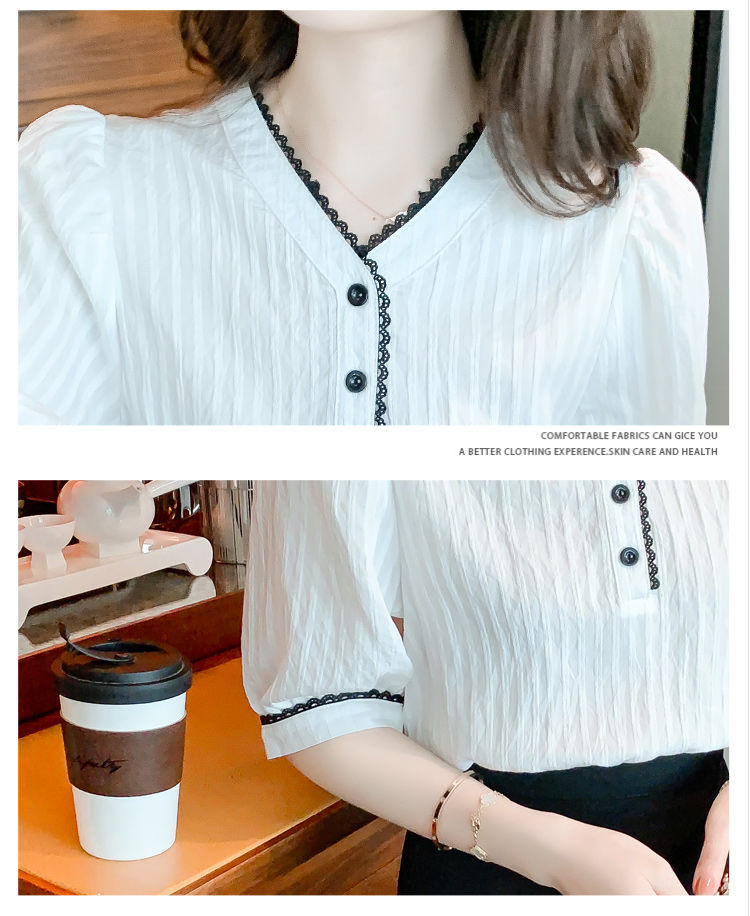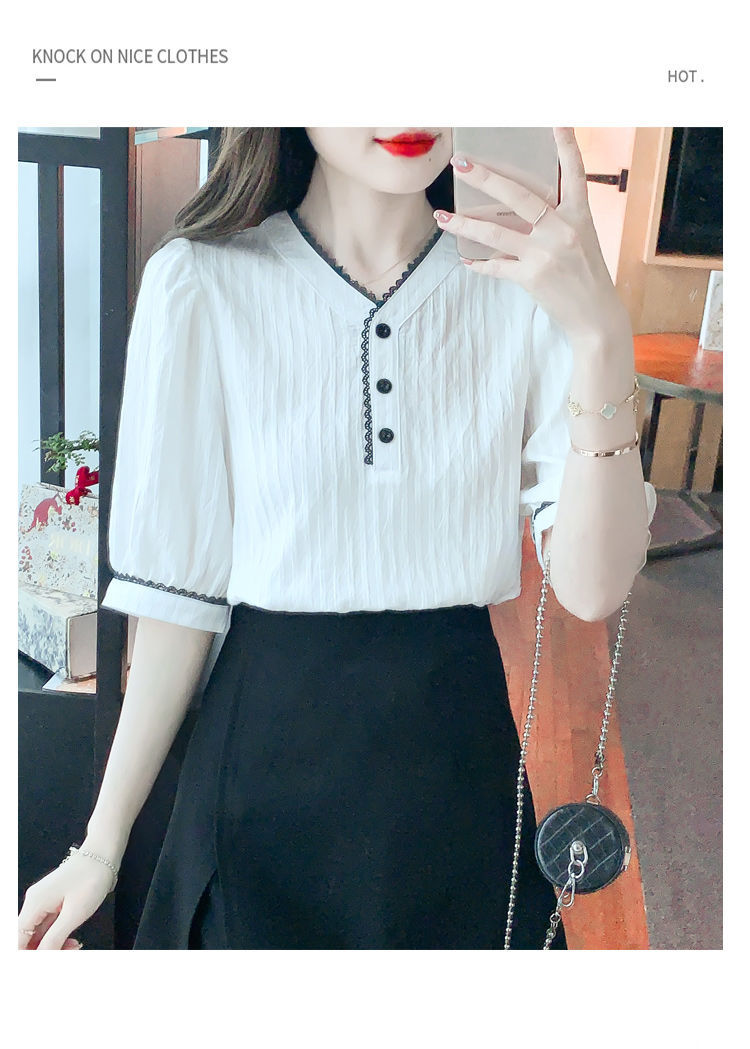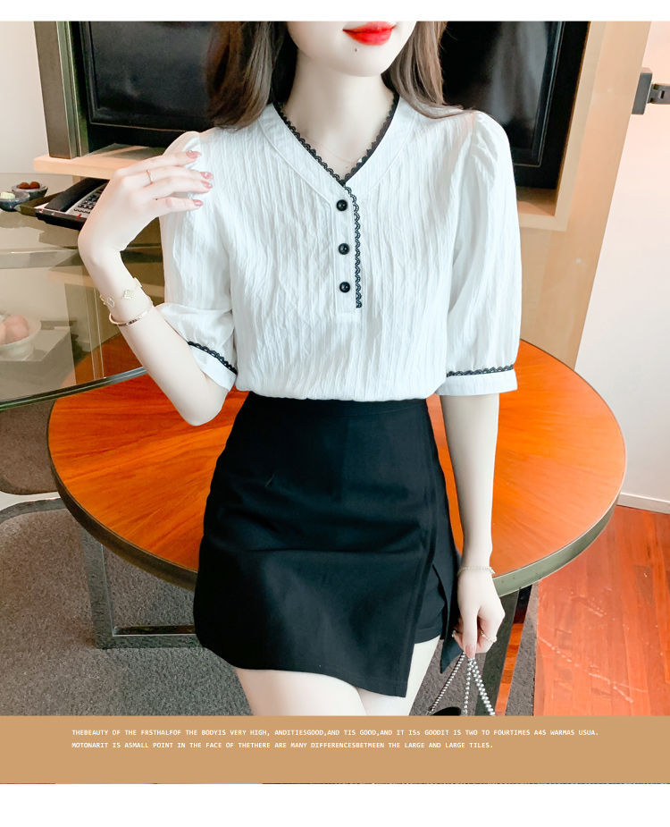 2025 여름 새로운 대비 컬러 퍼프 슬리브 유행 화이트 짧은 소매 쉬폰 셔츠 여성의 얇은 V 넥 탑 풀오버스토어 가기