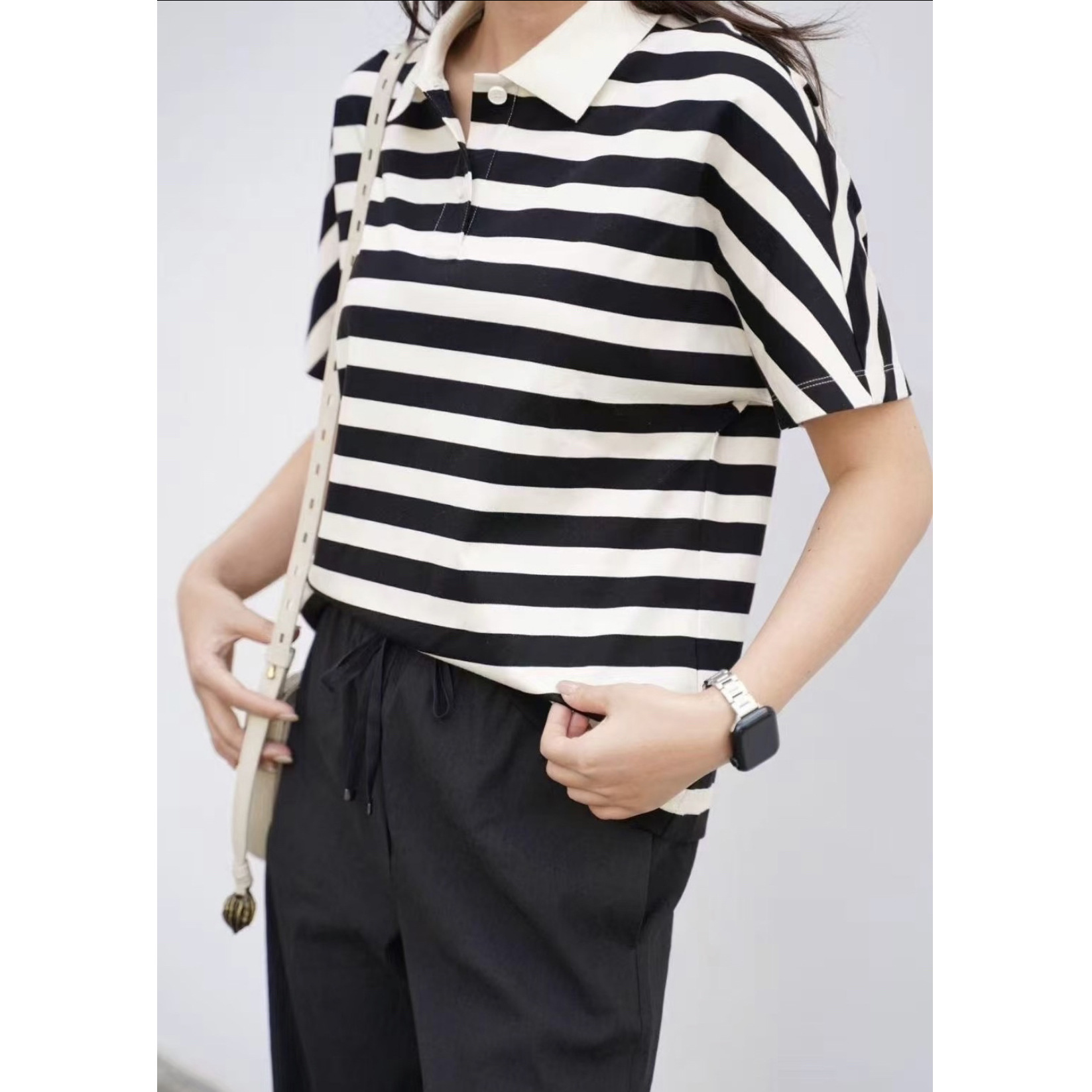 재고 Xiaohefeng 여름 흑백 줄무늬 반팔 티셔츠 여성용 틈새 디자인 폴로 칼라베이스 셔츠 탑스토어 가기