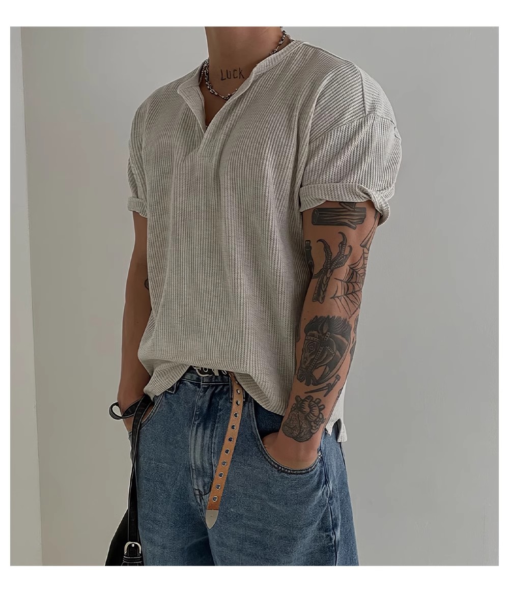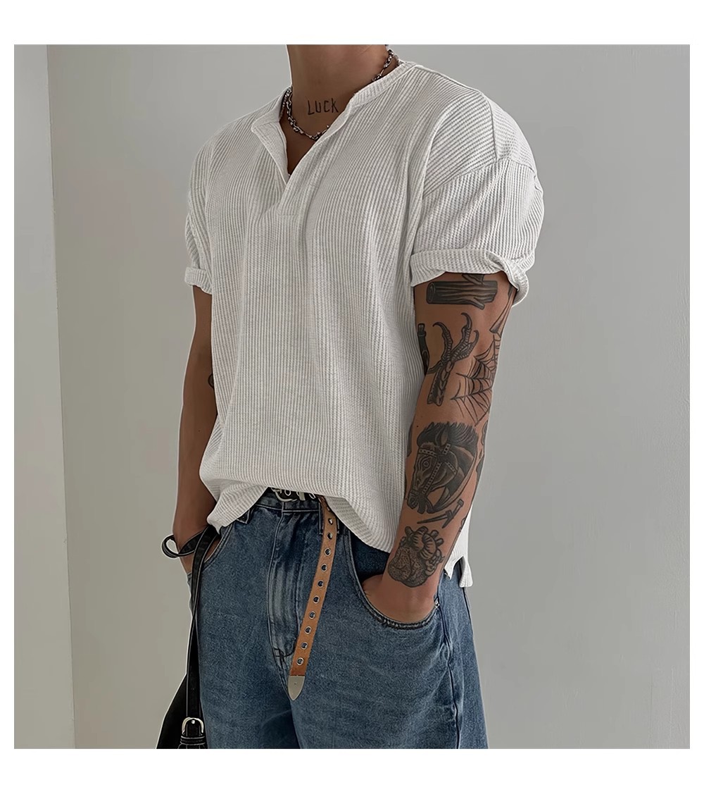 헨리 칼라 와플 반팔 티셔츠 남자 여름 아메리칸 스타일 심플베이스 탑 경량 통기성 사이드 스플릿 티셔츠