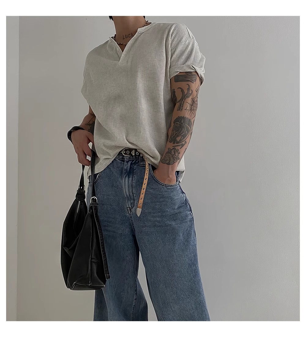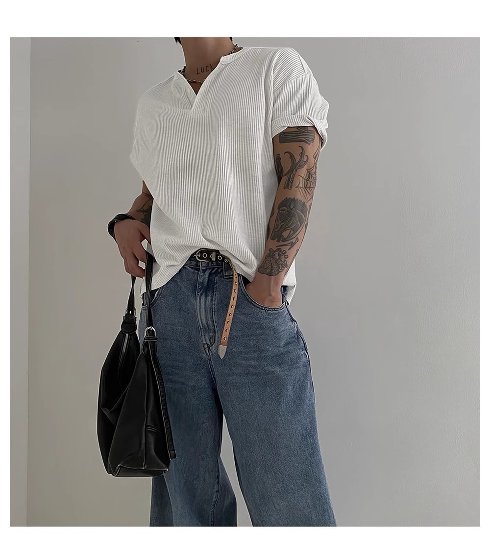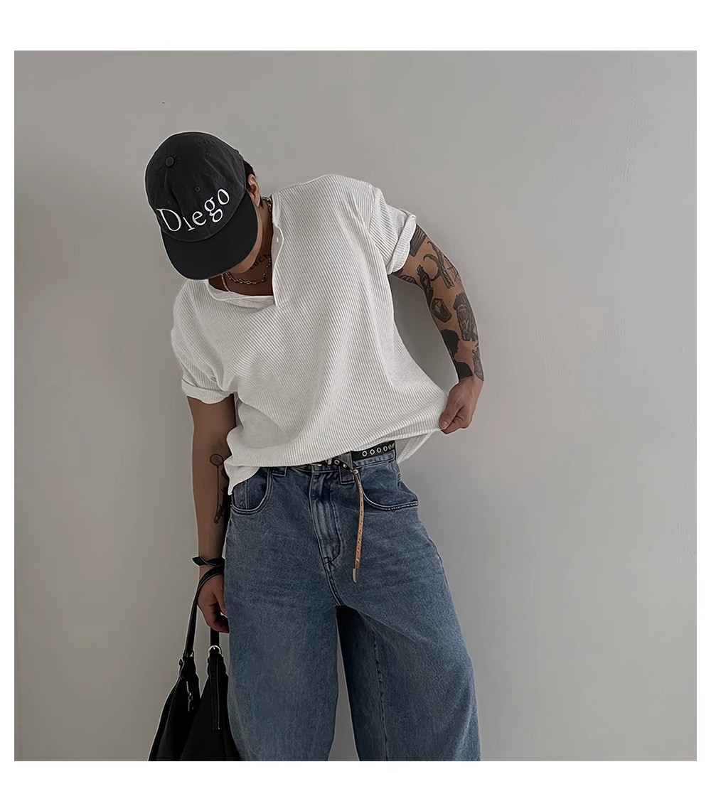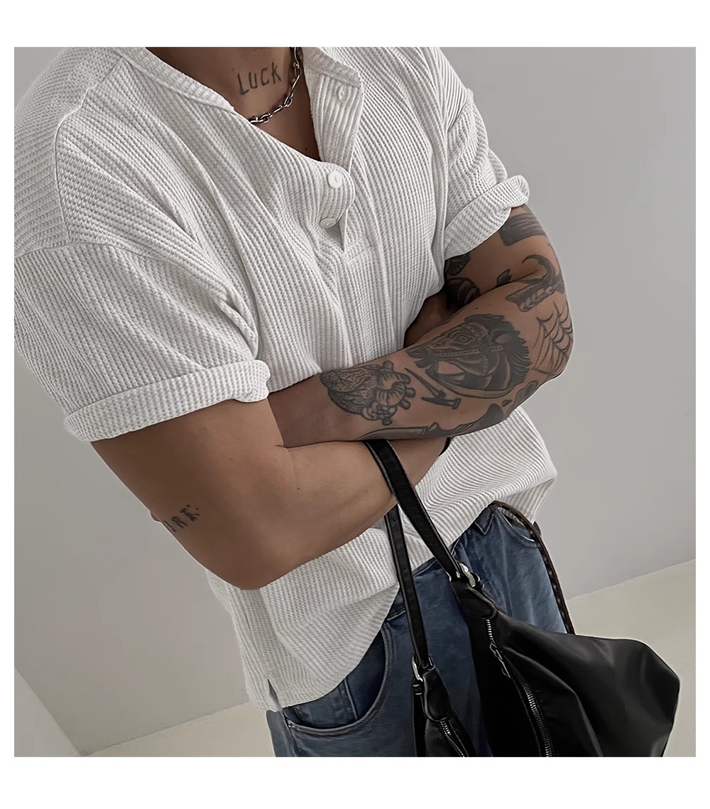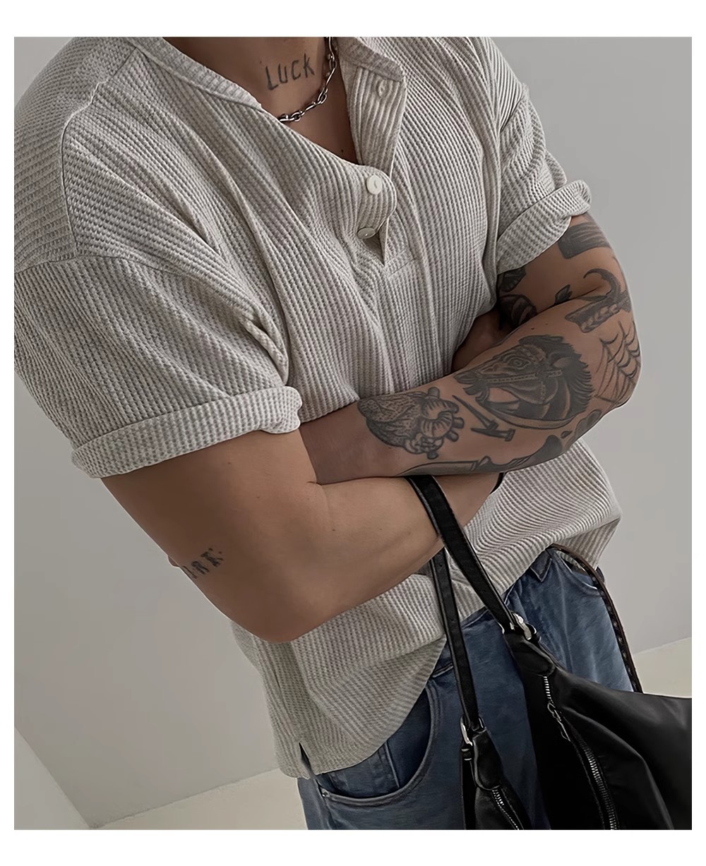 헨리 칼라 와플 반팔 티셔츠 남자 여름 아메리칸 스타일 심플베이스 탑 경량 통기성 사이드 스플릿 티셔츠스토어 가기