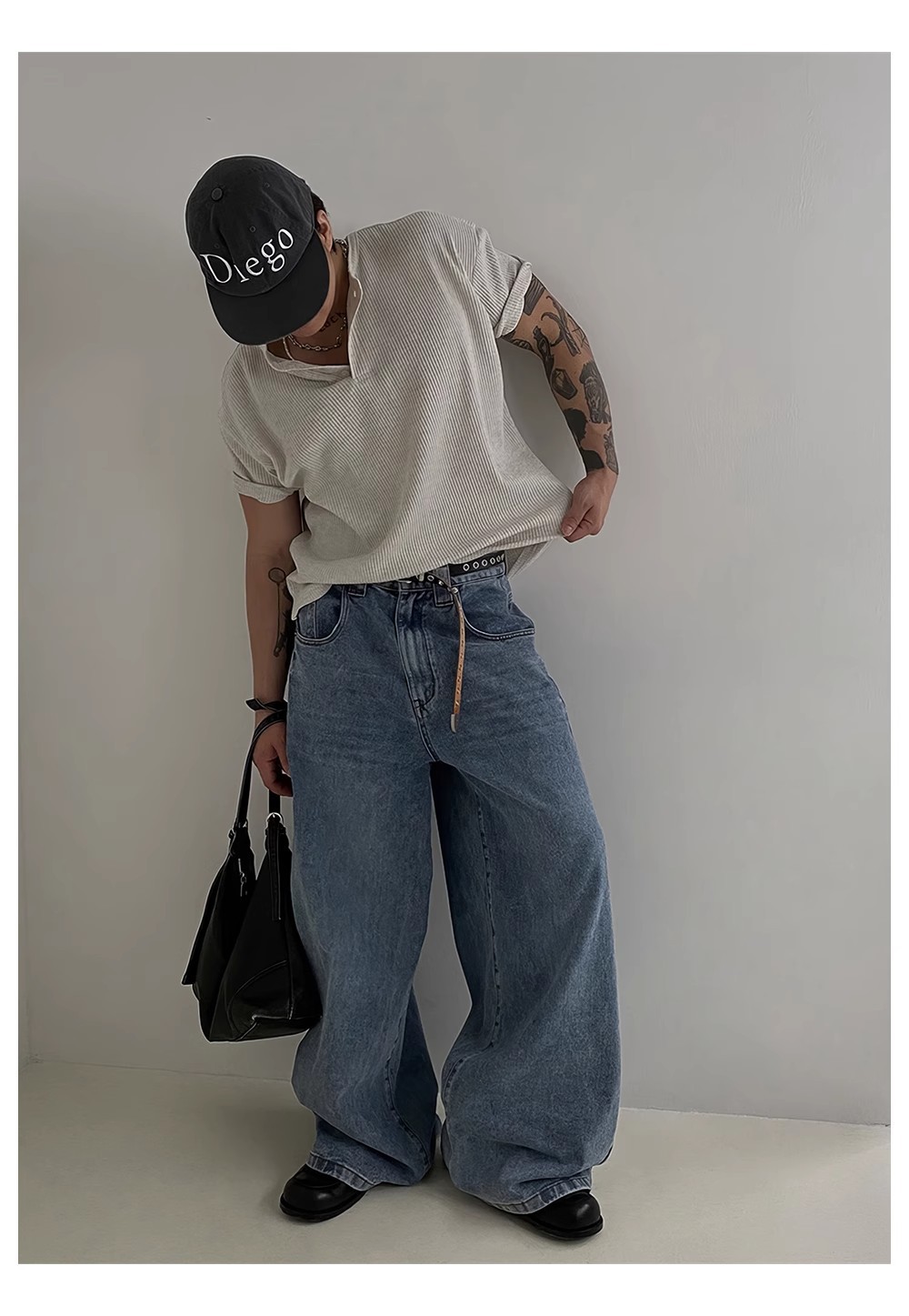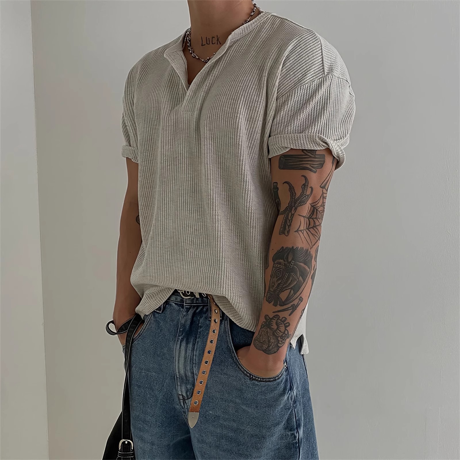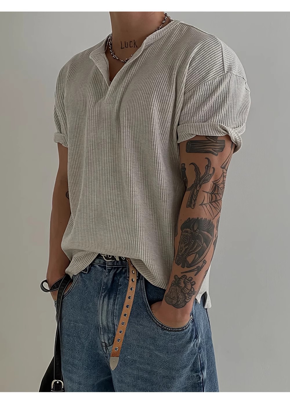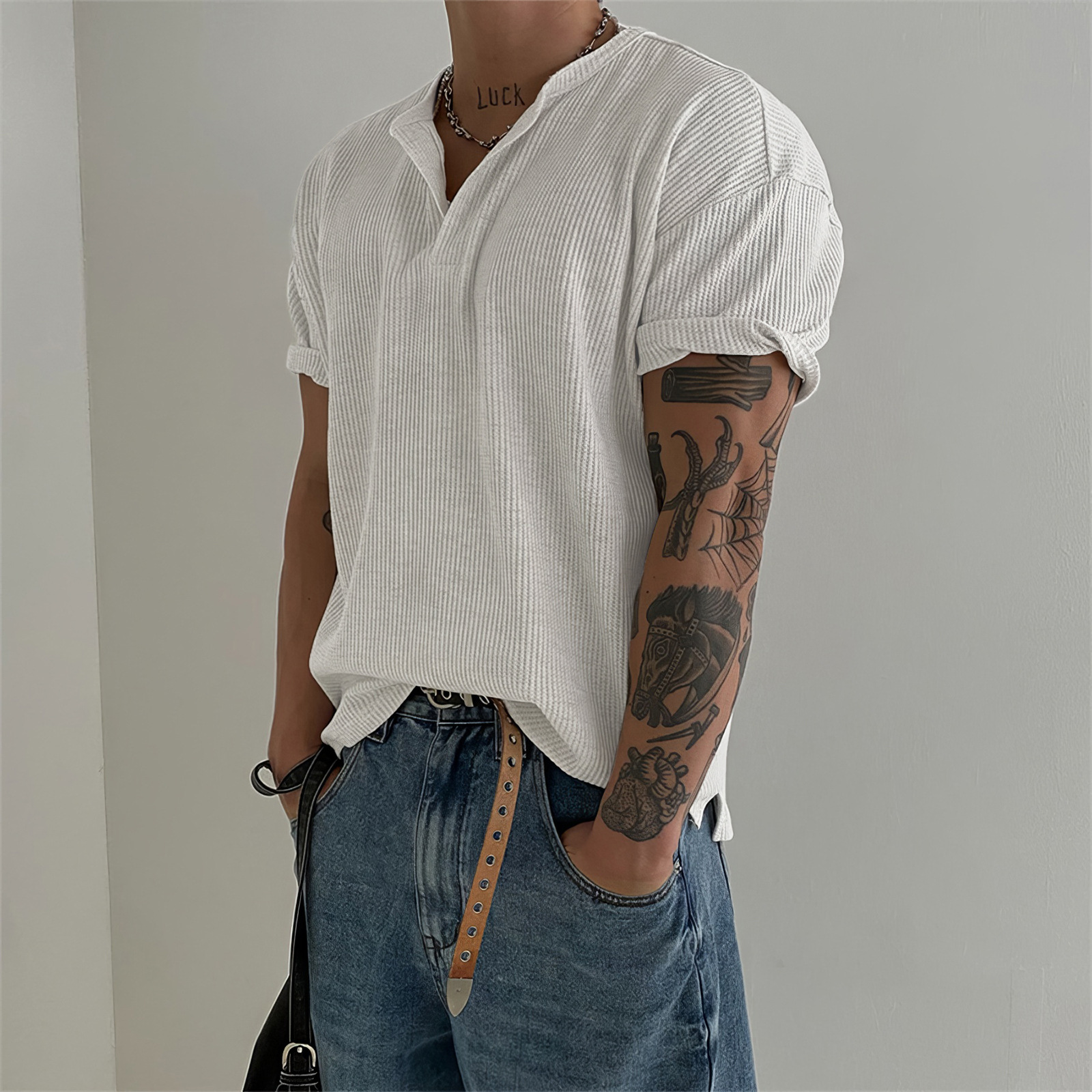 헨리 칼라 와플 반팔 티셔츠 남자 여름 아메리칸 스타일 심플베이스 탑 경량 통기성 사이드 스플릿 티셔츠스토어 가기