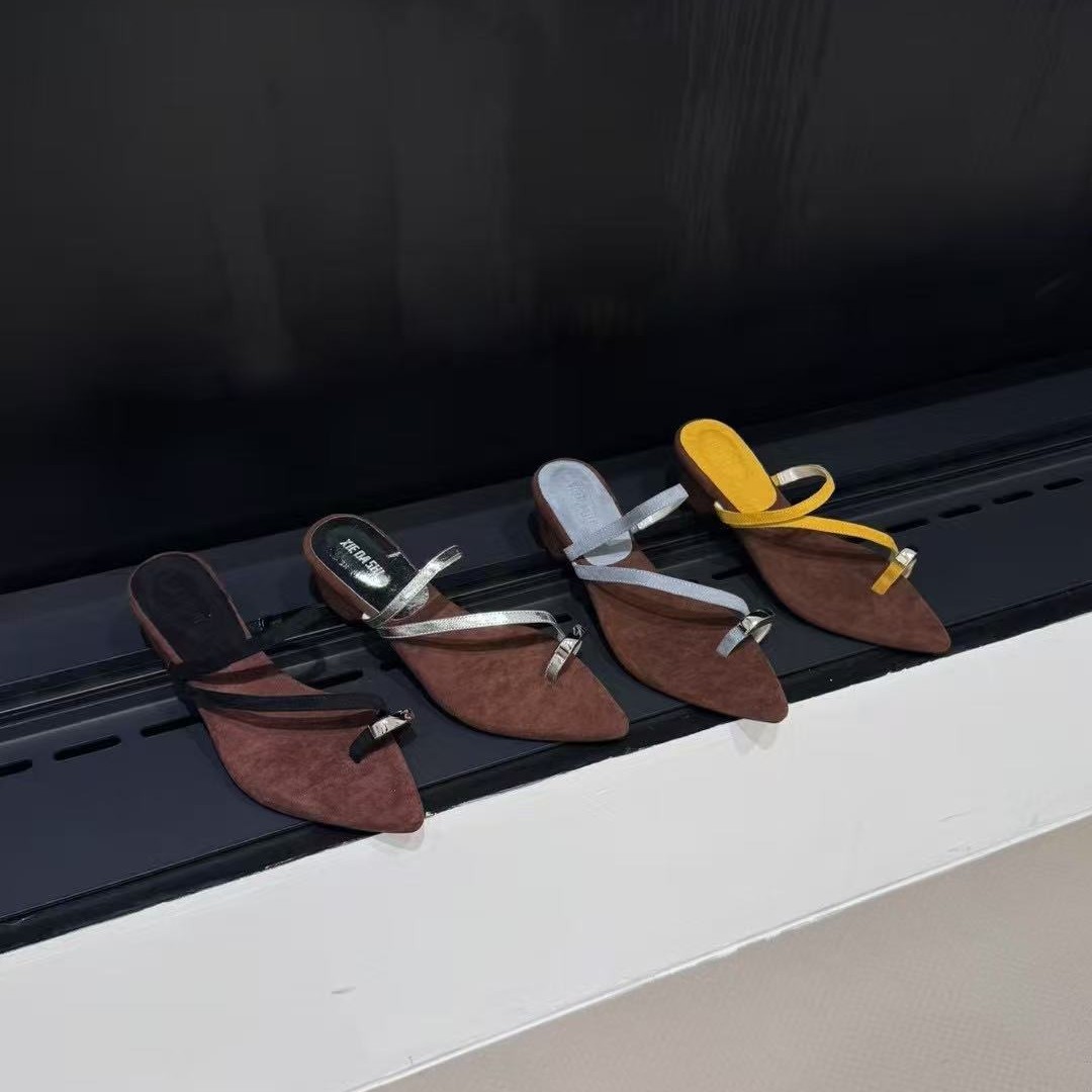 2025년 여름 신상 뾰족한 발가락 슬림 스트랩 데님 블루 두꺼운 하이힐 패션쇼 섹시한 하프 드래그 스웨이드 여성 샌들스토어 가기