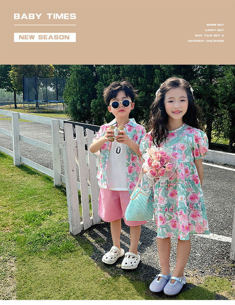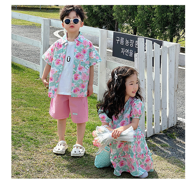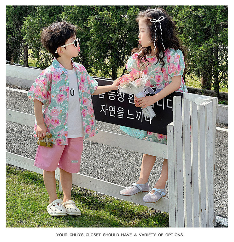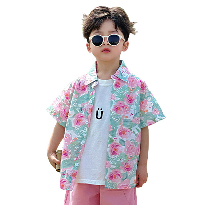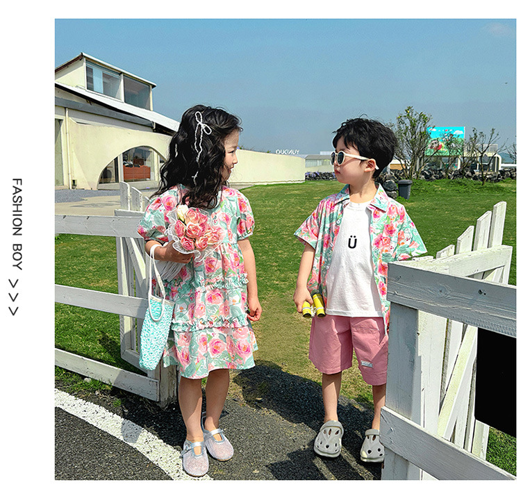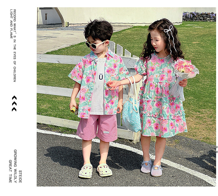 소년 반팔 꽃무늬 셔츠, 아기 휴가복, 아동 해변복 투피스 세트, 여름 소녀 꽃무늬 드레스스토어 가기
