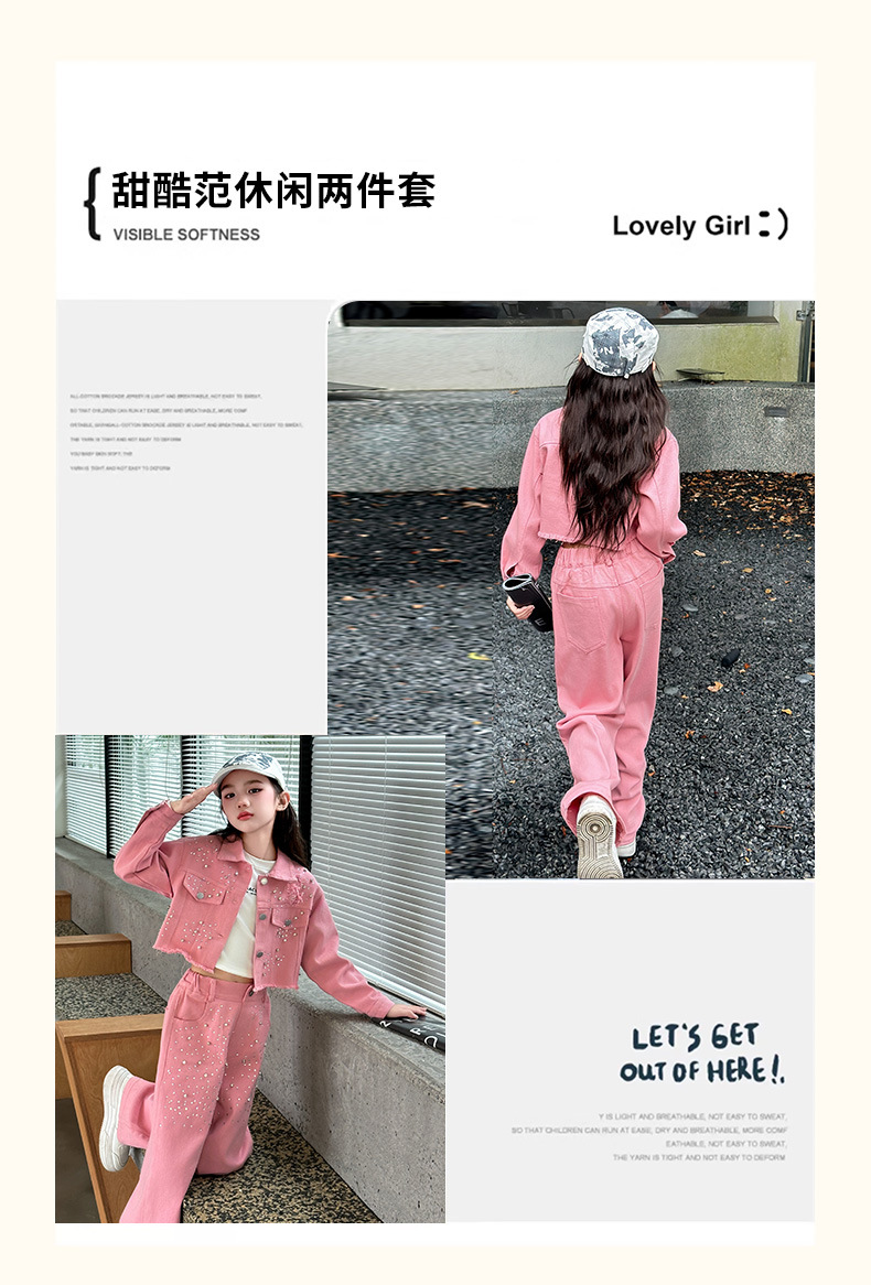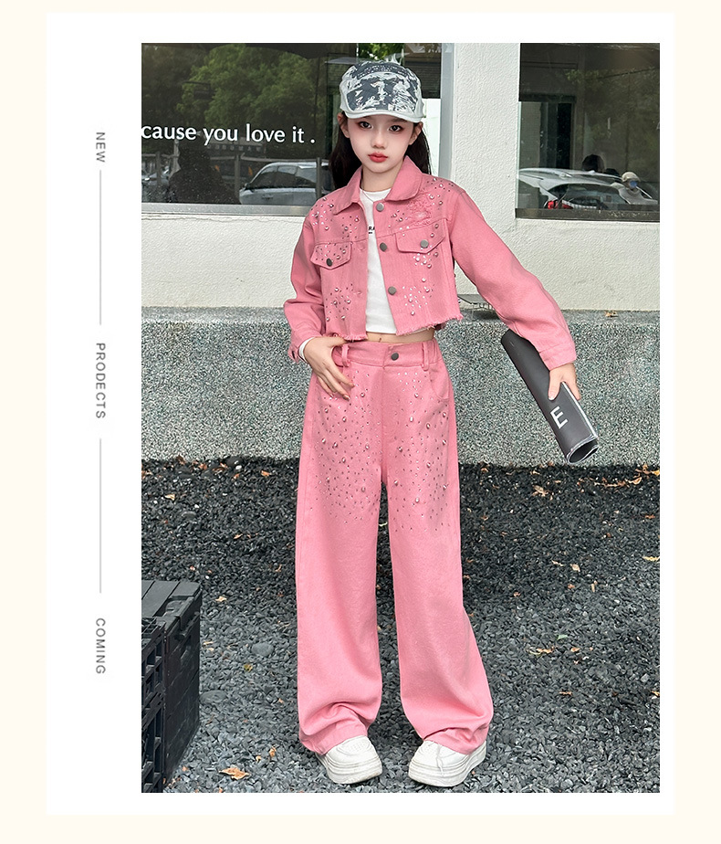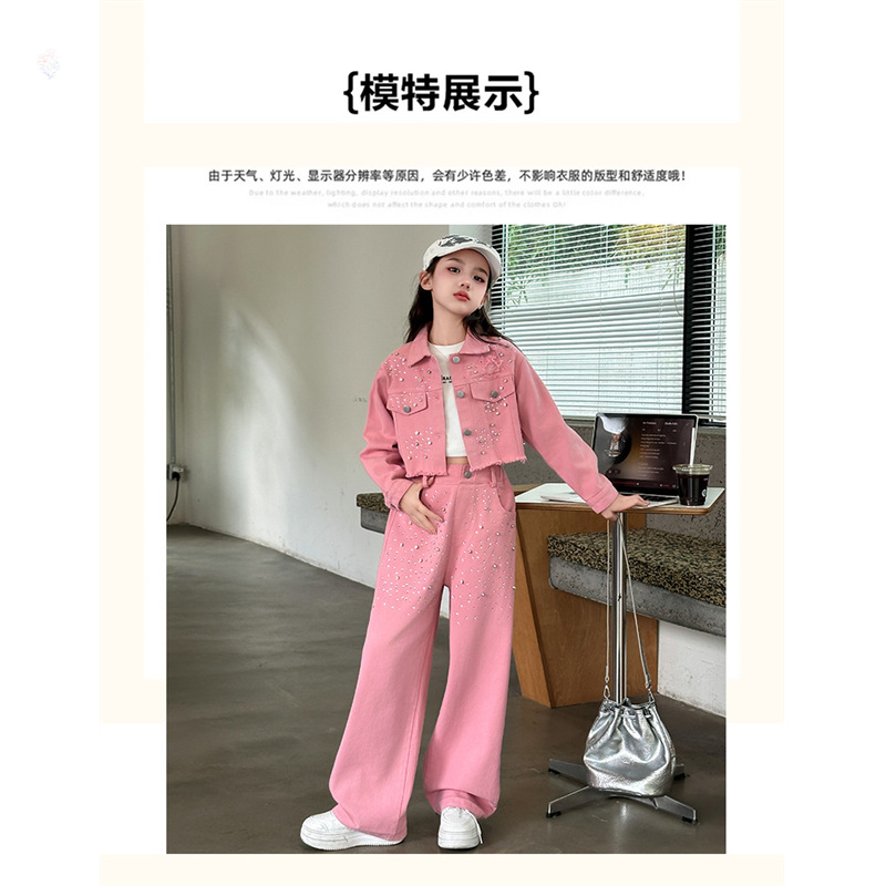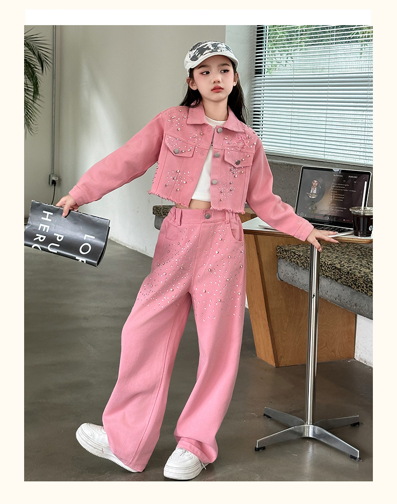 여아용 한국 스타일 핑크 비즈 장식 데님 세트, 큰 아이들을 위한 폴로 칼라 재킷, 스트레이트 팬츠, 와이드 팬츠, 2025 가을 의류스토어 가기