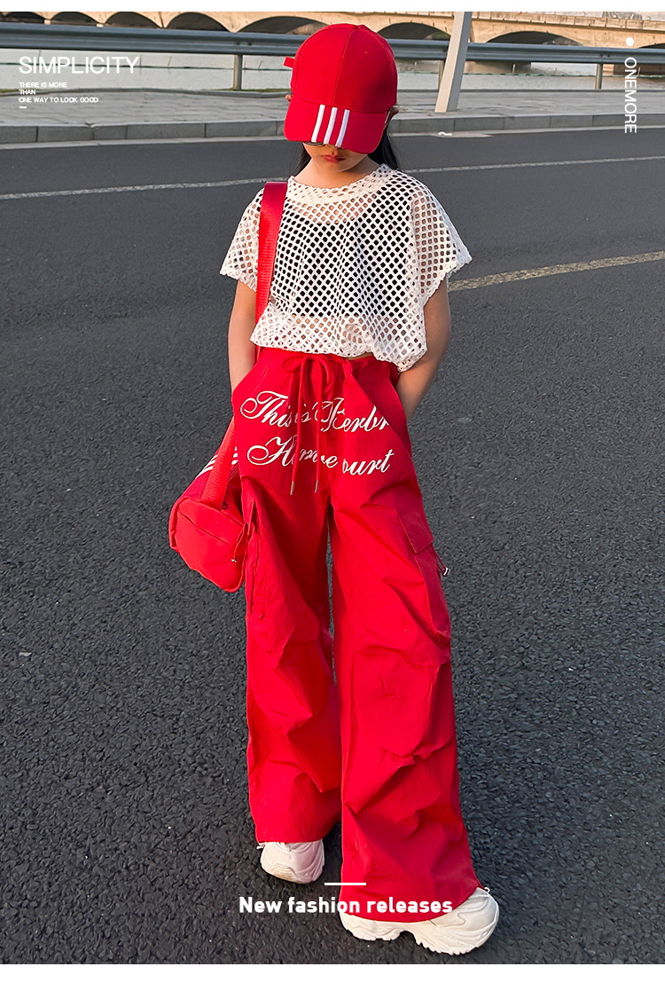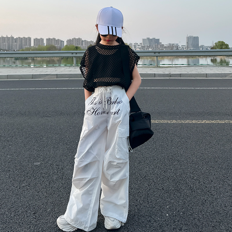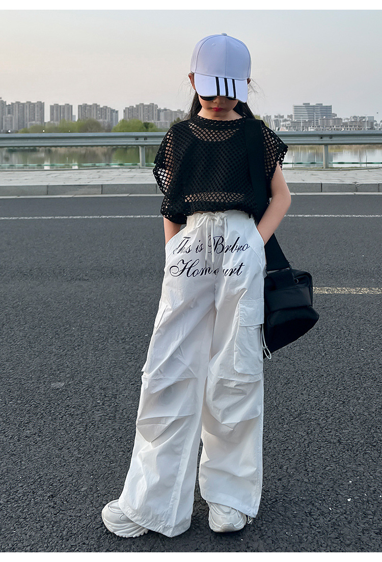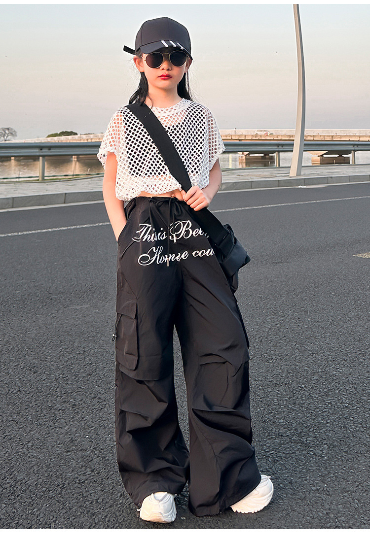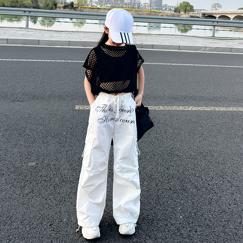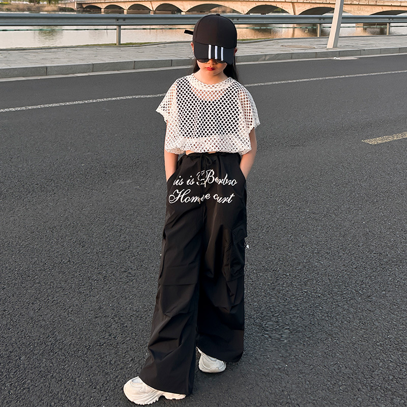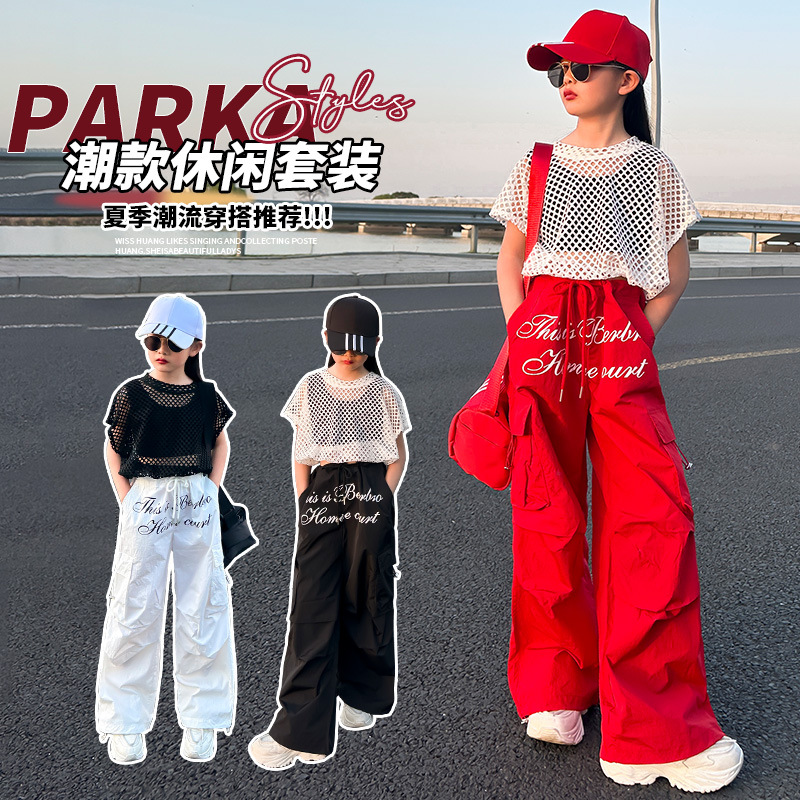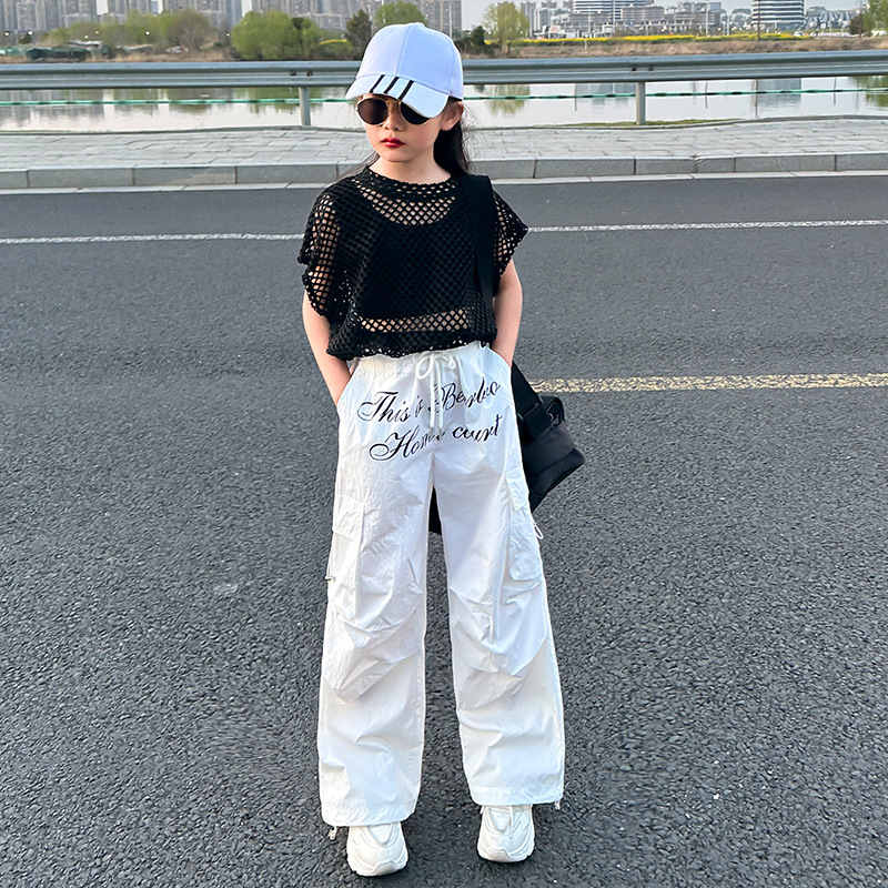걸스 세트 2025 여름 미들 및 빅 키즈를위한 새로운 유행 작업복 메쉬 티셔츠 느슨한 세련된 스트리트 댄스 두 조각
